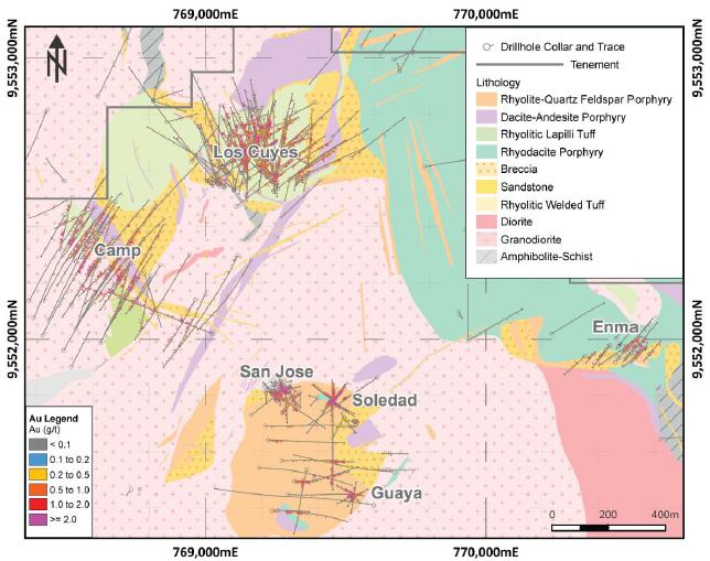 • Los Cuyes: Gold is hosted in a volcanic diatreme which crosscuts a granodiorite batholith. The diatreme, with a dimension of 450m in NE-SW x 300m in NW-SE x 350m depth comprises phreatomagmatic breccias, tuff and sediments, all of which are cross-cut by NW and NE striking dykes of rhyolite and dacite.