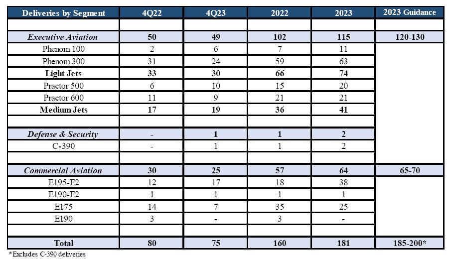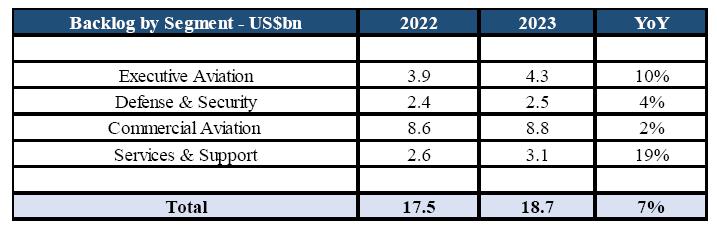 Executive Aviation continued its sales momentum with sustained demand across its entire product portfolio and strong customer acceptance in both retail and fleet markets. The business unit ended the year with a book-to-bill in excess of 1.3:1 and a US$4.3 billion backlog, a US$400 million growth YoY. The 74 deliveries of light jets in 2023 were 12% higher YoY and the largest volume in 7 years. Moreover, the 41 deliveries of medium jets also posted double-digit annual growth at 14%.