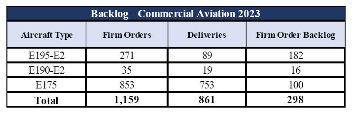 Embraer deliveries increased 13% in 2023 and backlog reached US$18.7 billion, a US$1.2 billion growth