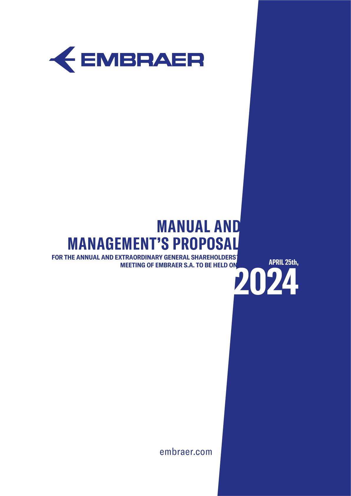 We are pleased to invite you to read our Manual for the Annual and Extraordinary General Meetings ("AEGM" or "Meetings") of Embraer S.A. ("Embraer" or "Company"), which are called, cumulatively, for April 25, 2024, at 10 am, and shall be held exclusively by digital means, using the Microsoft Teams platform.