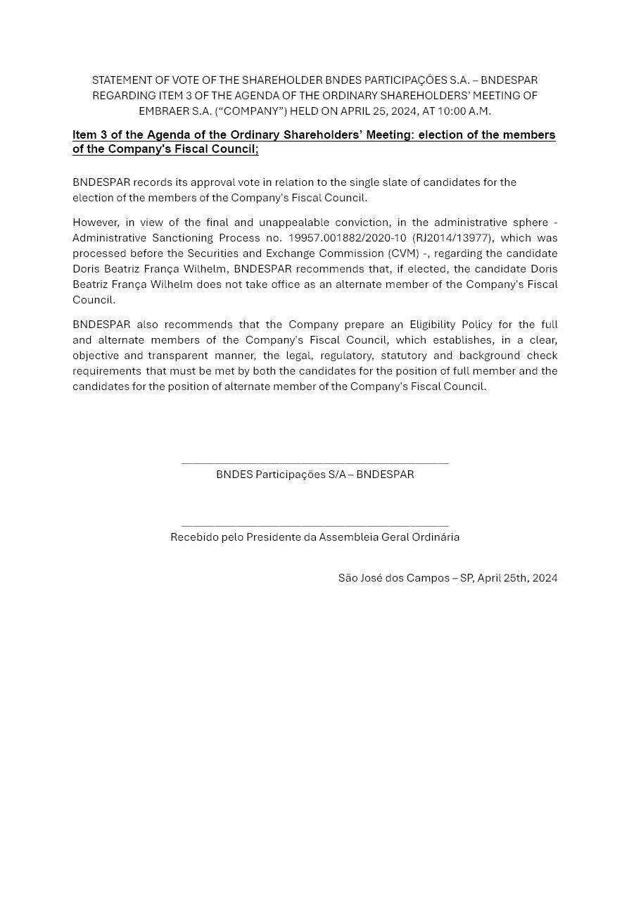 Date, Time and Place: On April 25, 2024, at 10:00 am, (“Company” or “Embraer”), exclusively by digital means, through the Microsoft Teams electronic platform, pursuant to CVM Resolution No. 81/2022.
