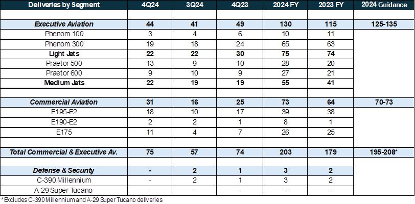 Embraer reached 75 deliveries in the last quarter of 2024, for a total of 206 new aircraft in the year