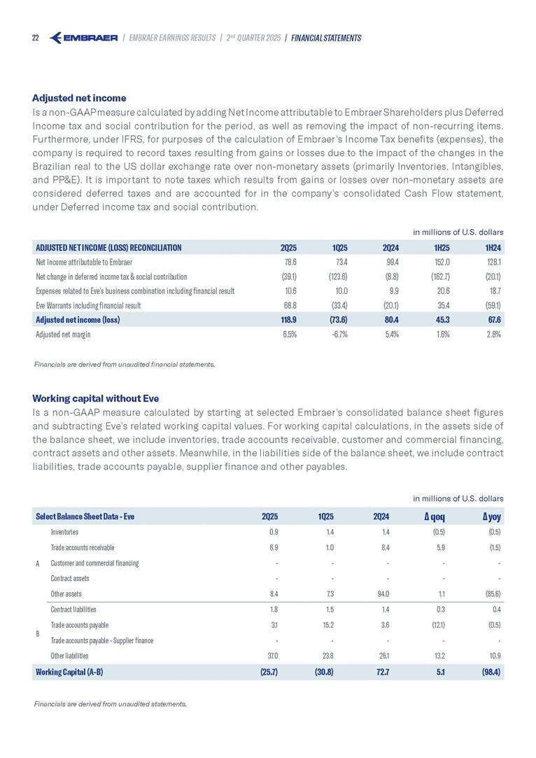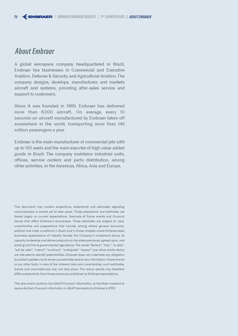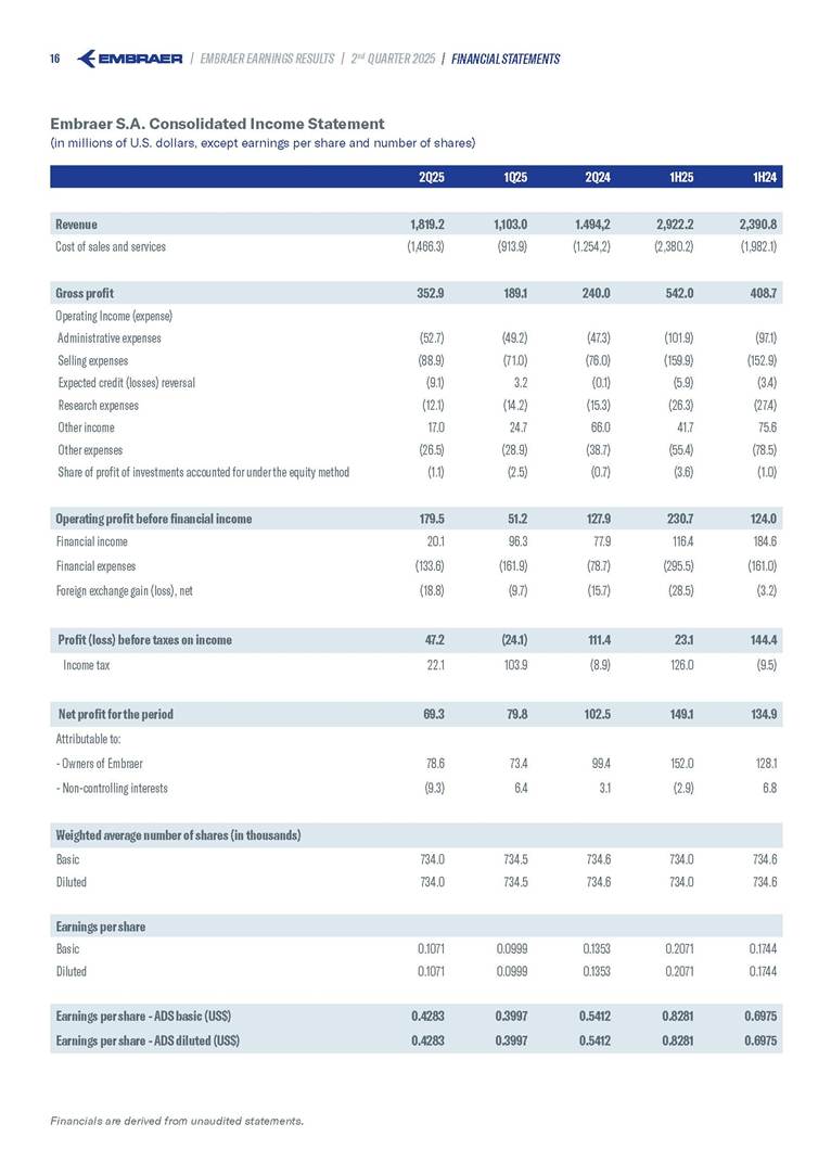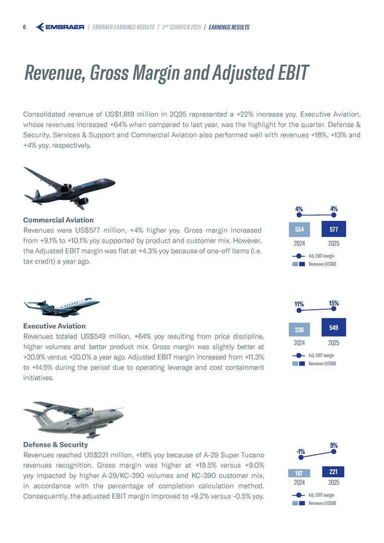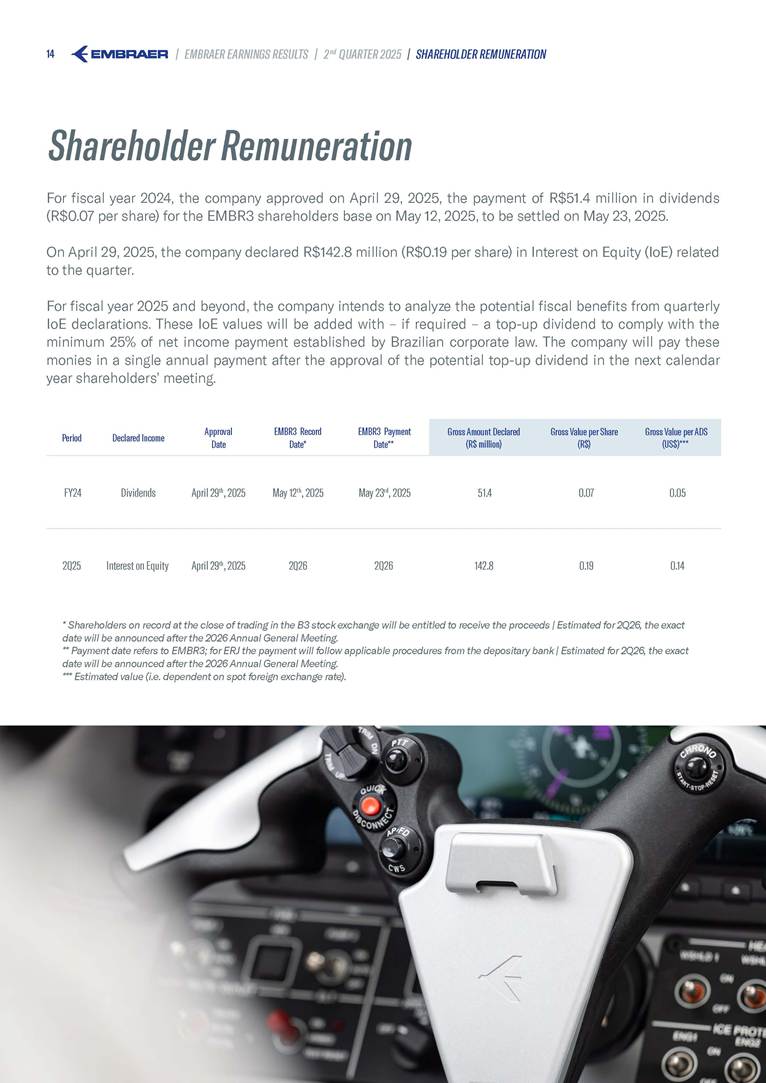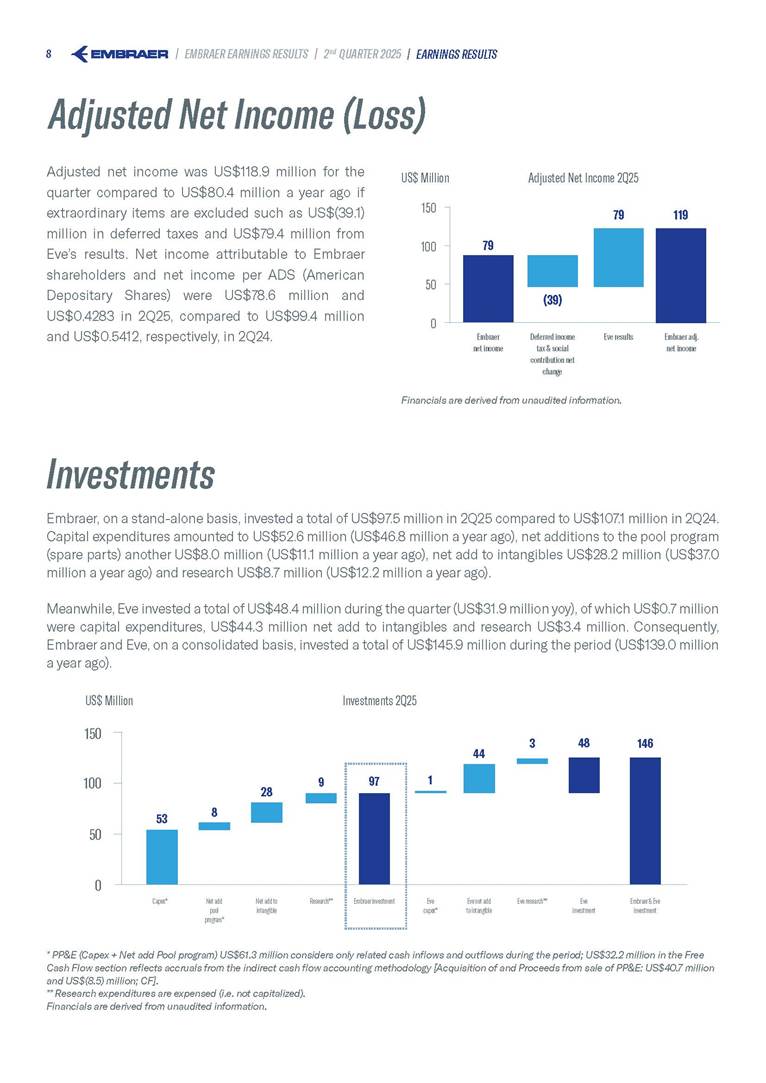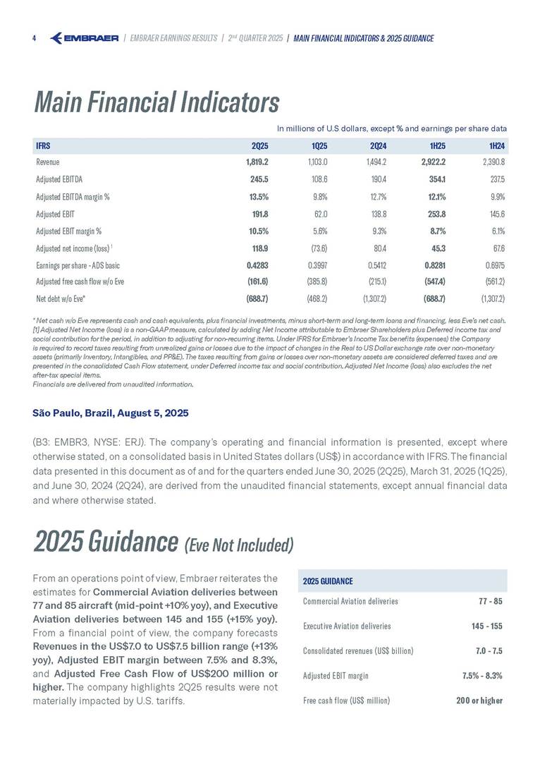 Embraer S.A (the “Company”) is filing this Amendment No. 1 on Form 6-K (this “Amendment” or “Form 6-K/A”) to amend the report on Form 6-K originally filed by the Company with the Securities and Exchange Commission (the “Commission”) on August 5, 2025 (the “Original Report”) that announced the Company’s financial results for the second quarter ended June 30, 2025. The sole purpose of this Amendment is to revise the figures previously reported under “Deferred income tax and social contribution, net change,” which consequently impacted the amount reported under “Adjusted net income (loss),” changing it from US$(4.7) million to US$118.9 million. The previously furnished earnings released is replaced in its entirety with the earnings release that follows. The Company further informs that its interim financial statements as of June 30, 2025 and for the second quarter ended June 30, 2025 are accurate, were correctly published by the Company and that no adjustments will be made to such financial statements. Other than as expressly set forth above, this Form 6-K/A does not amend, update or restate any other information in the Original Report.