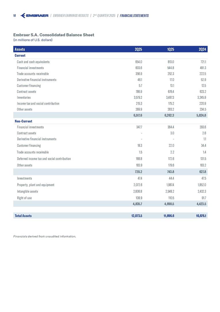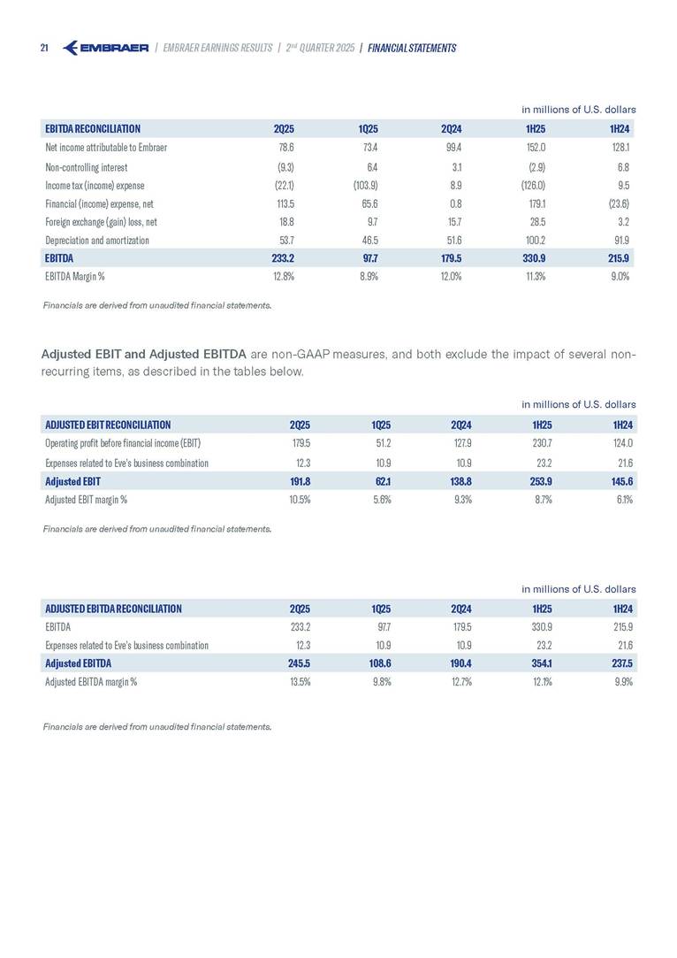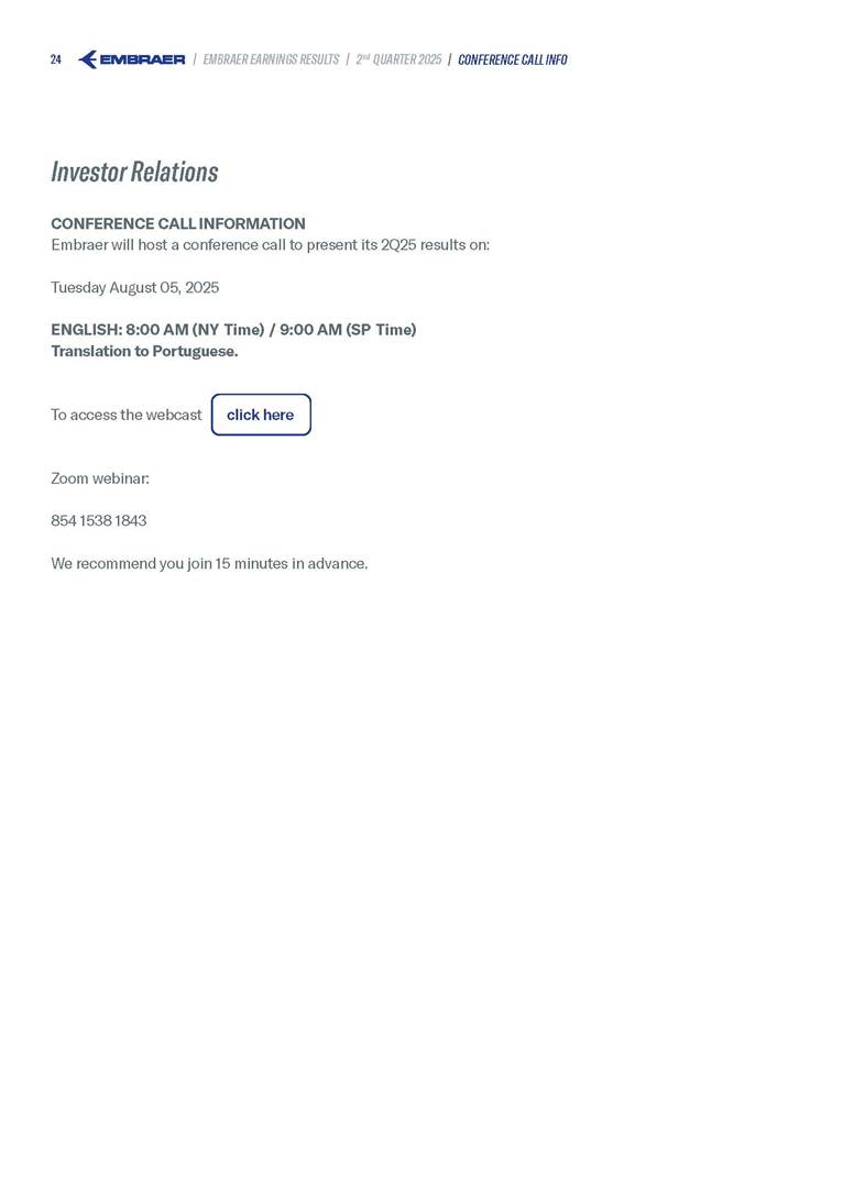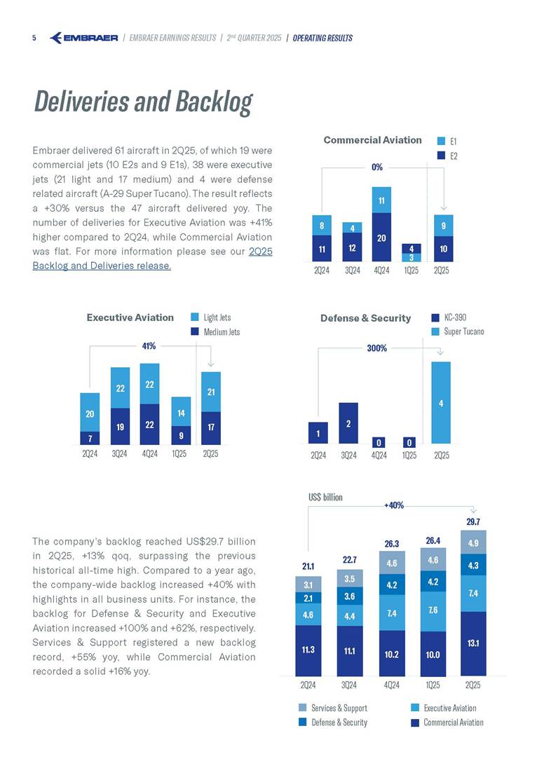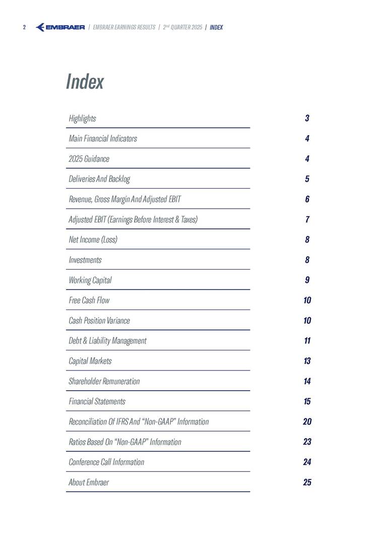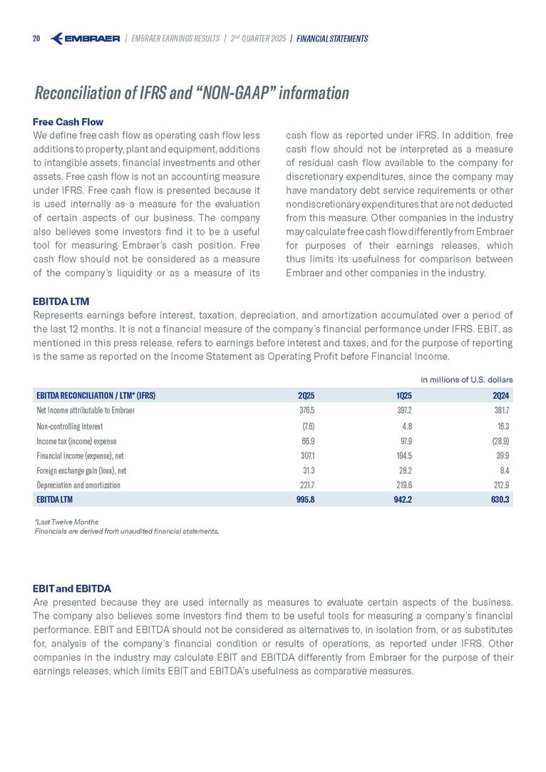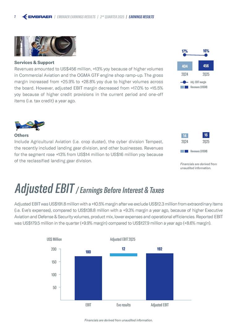Embraer S.A (the “Company”) is filing this Amendment No. 1 on Form 6-K (this “Amendment” or “Form 6-K/A”) to amend the report on Form 6-K originally filed by the Company with the Securities and Exchange Commission (the “Commission”) on August 5, 2025 (the “Original Report”) that announced the Company’s financial results for the second quarter ended June 30, 2025. The sole purpose of this Amendment is to revise the figures previously reported under “Deferred income tax and social contribution, net change,” which consequently impacted the amount reported under “Adjusted net income (loss),” changing it from US$(4.7) million to US$118.9 million. The previously furnished earnings released is replaced in its entirety with the earnings release that follows. The Company further informs that its interim financial statements as of June 30, 2025 and for the second quarter ended June 30, 2025 are accurate, were correctly published by the Company and that no adjustments will be made to such financial statements. Other than as expressly set forth above, this Form 6-K/A does not amend, update or restate any other information in the Original Report.
