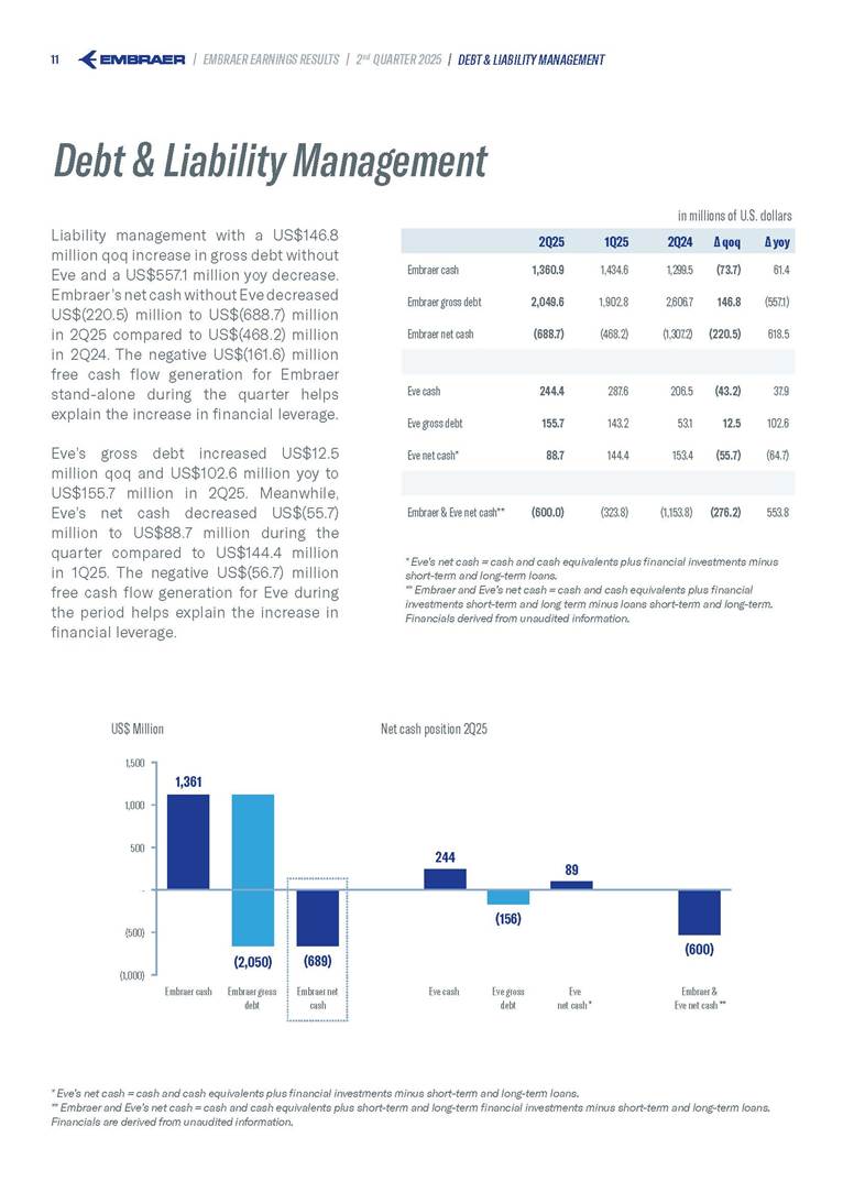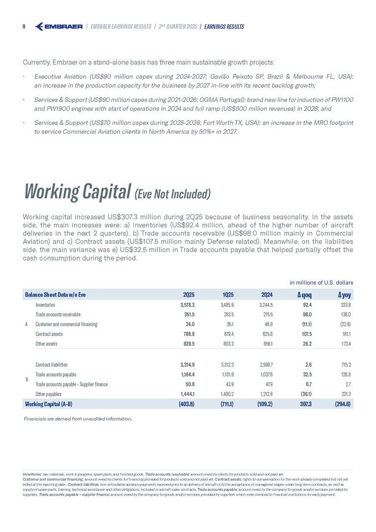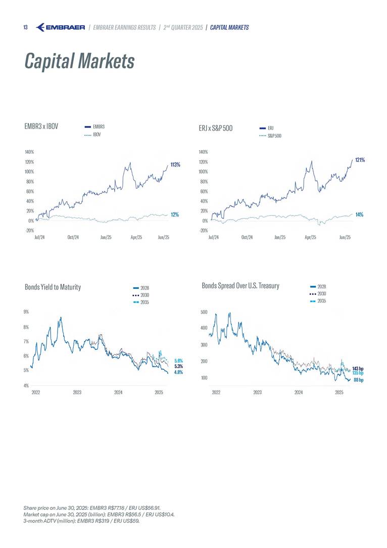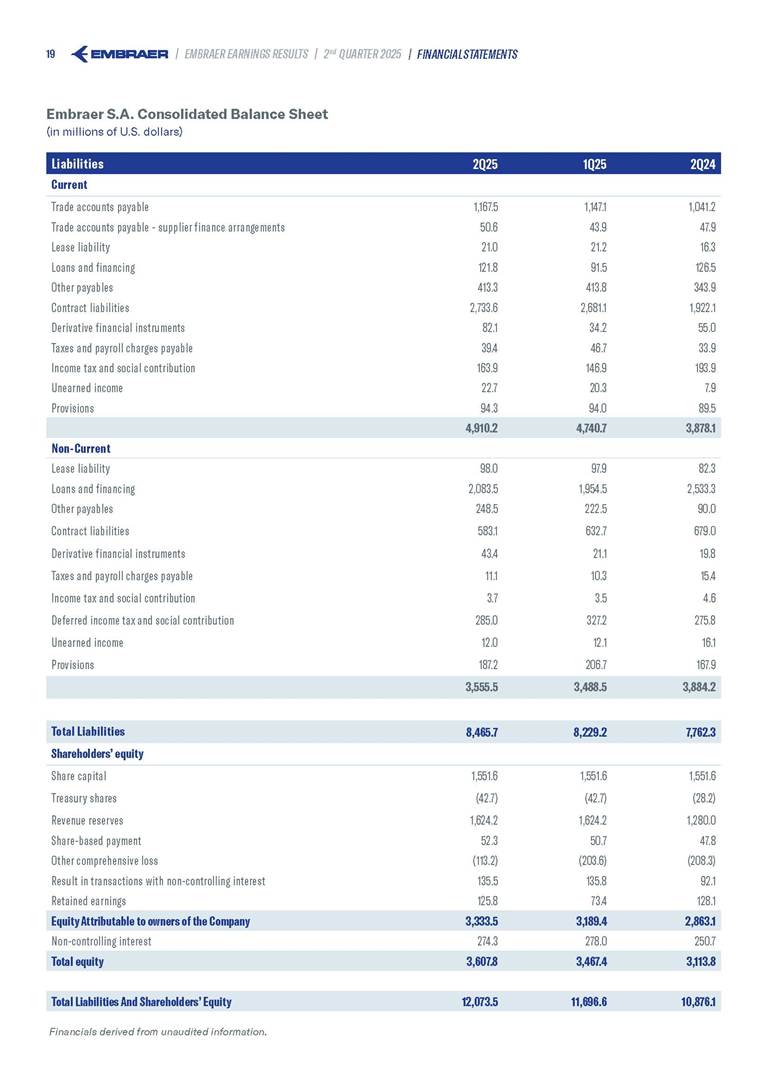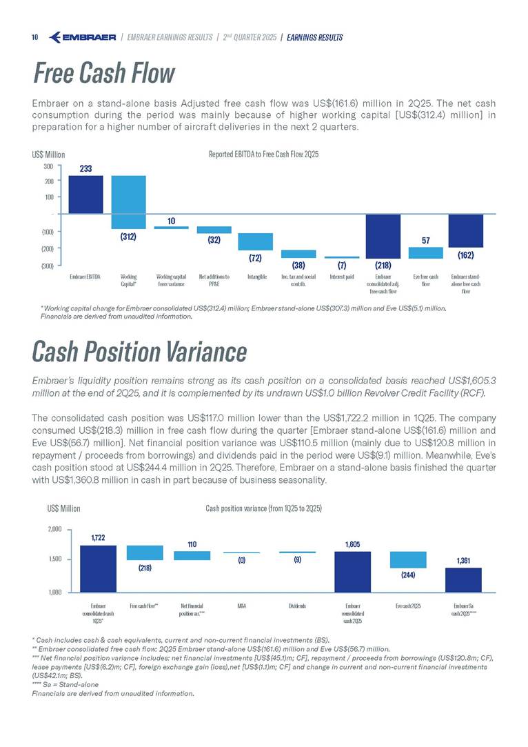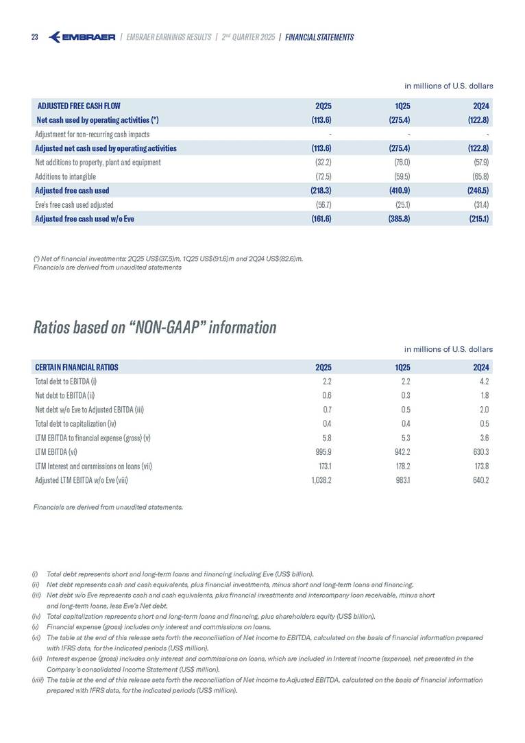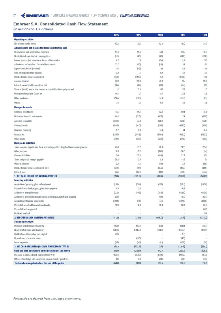 Embraer S.A (the “Company”) is filing this Amendment No. 1 on Form 6-K (this “Amendment” or “Form 6-K/A”) to amend the report on Form 6-K originally filed by the Company with the Securities and Exchange Commission (the “Commission”) on August 5, 2025 (the “Original Report”) that announced the Company’s financial results for the second quarter ended June 30, 2025. The sole purpose of this Amendment is to revise the figures previously reported under “Deferred income tax and social contribution, net change,” which consequently impacted the amount reported under “Adjusted net income (loss),” changing it from US$(4.7) million to US$118.9 million. The previously furnished earnings released is replaced in its entirety with the earnings release that follows. The Company further informs that its interim financial statements as of June 30, 2025 and for the second quarter ended June 30, 2025 are accurate, were correctly published by the Company and that no adjustments will be made to such financial statements. Other than as expressly set forth above, this Form 6-K/A does not amend, update or restate any other information in the Original Report.