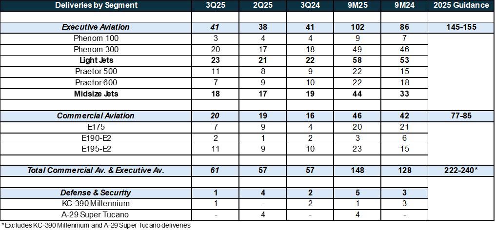 São Paulo (SP), Brazil, October 2, 2025 – Embraer (NYSE: ERJ / B3: EMBR3), a global leader in the aerospace industry, delivered 62 aircraft in 3Q25. The result represented a marginal improvement compared to 2Q25 and 3Q24, when 61 and 59 jets were delivered, respectively.