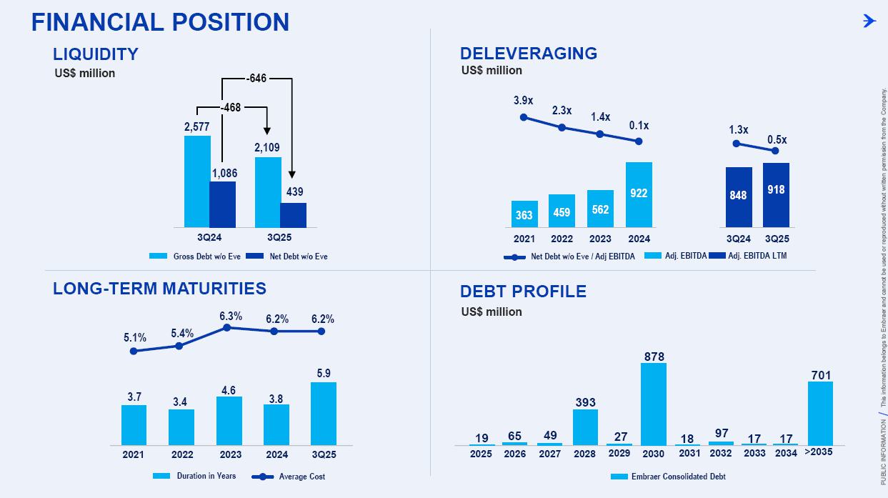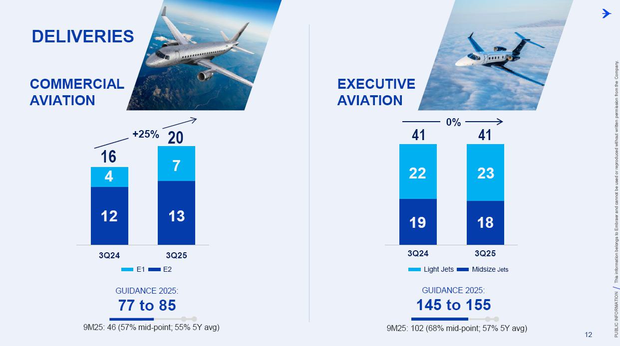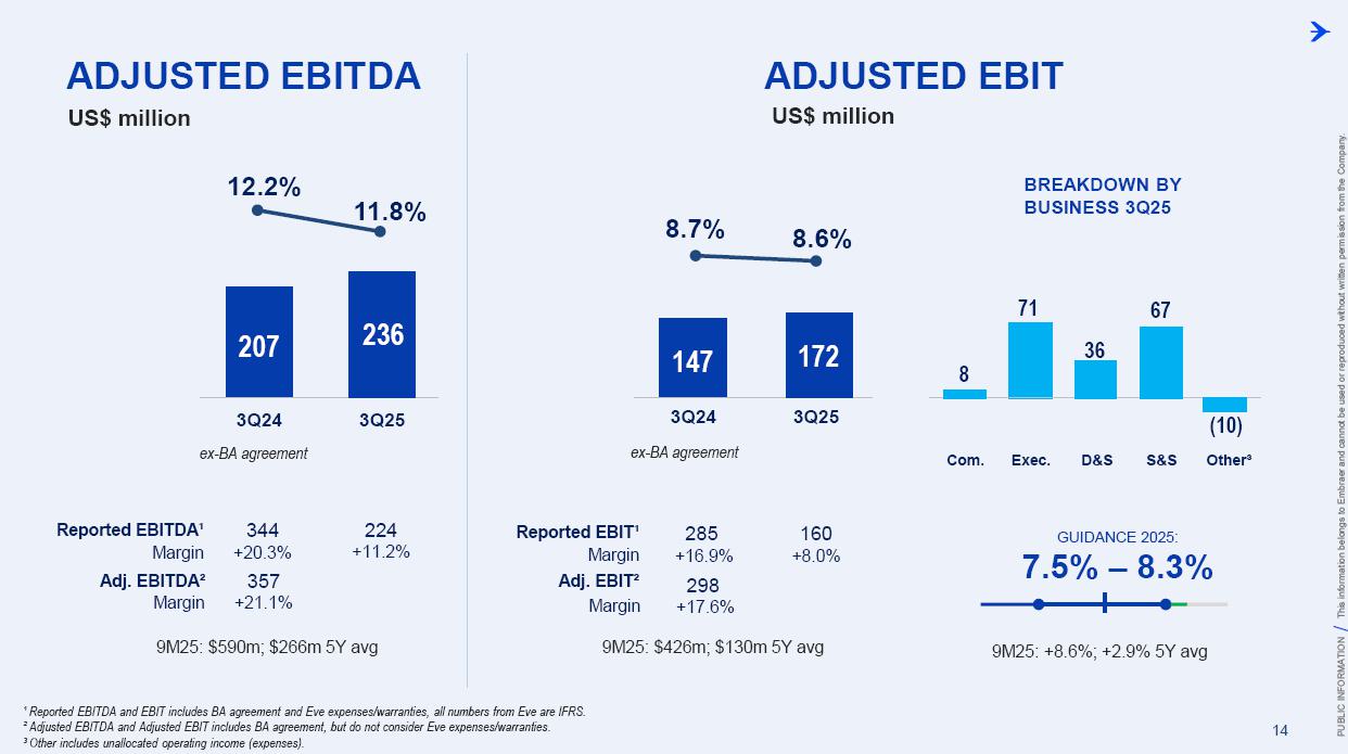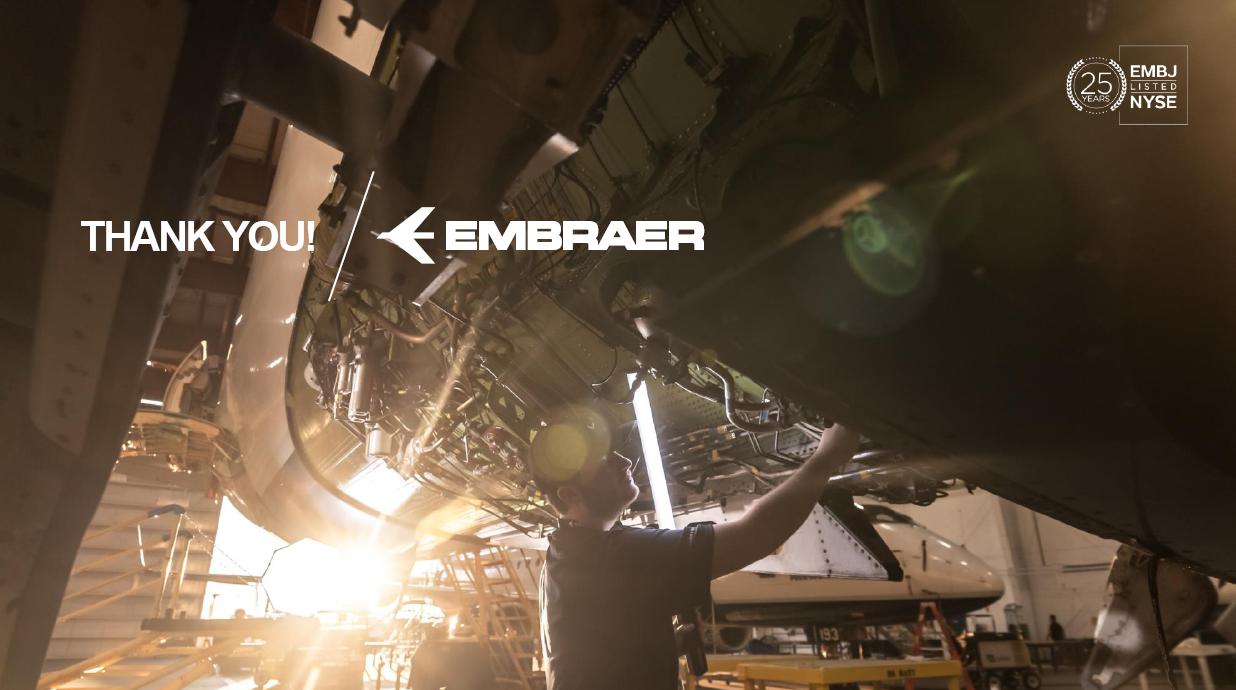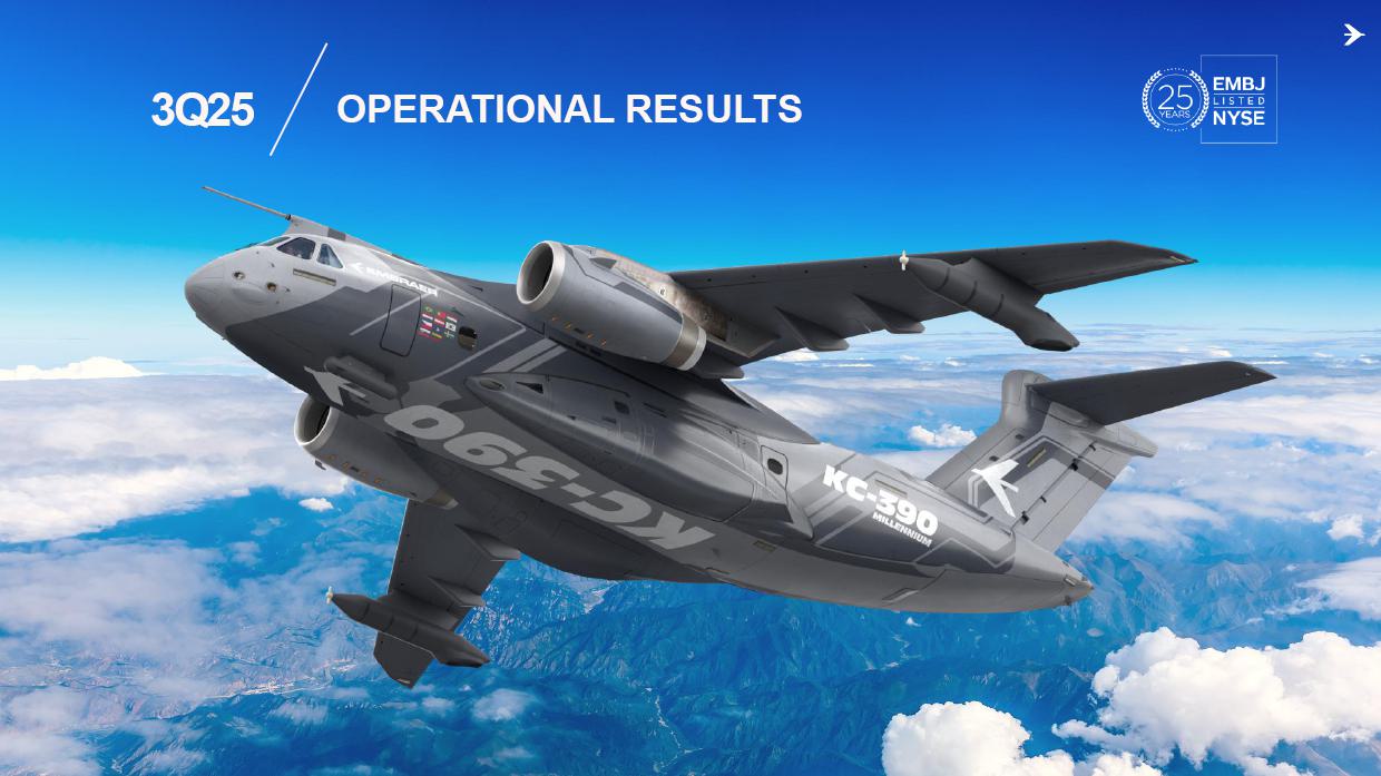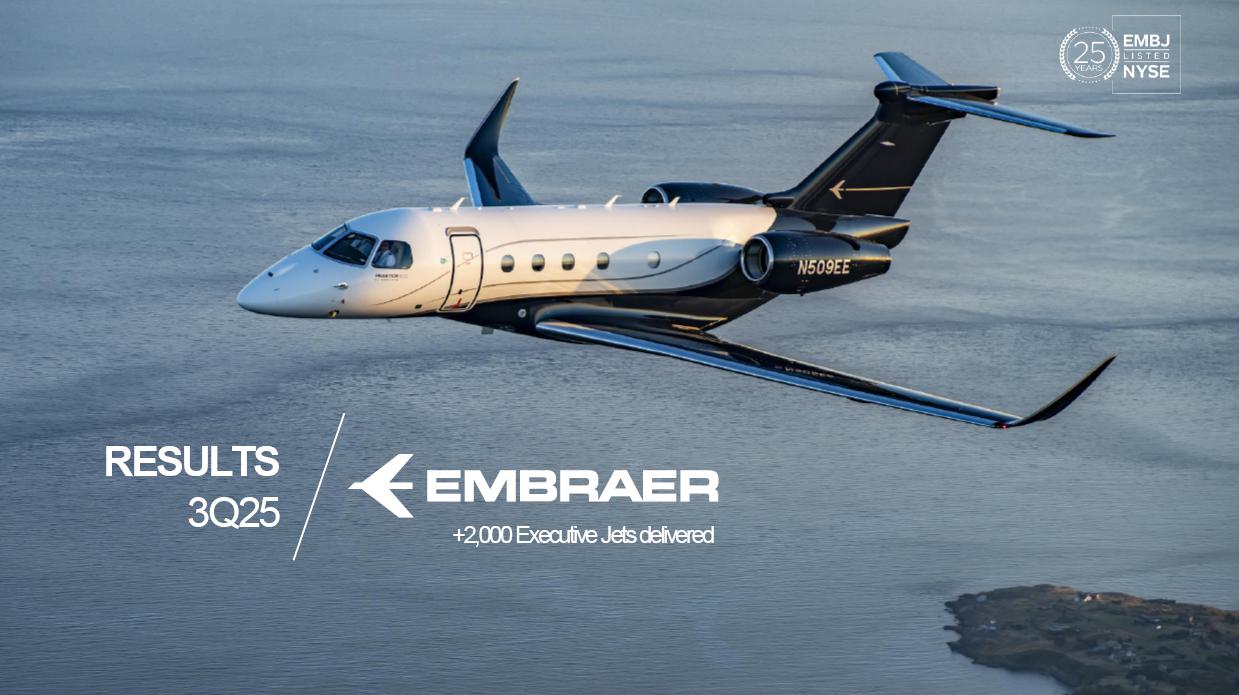 This information belongs to Embraer and cannot be used or reproduced without written permission PUBLIC INFORMATION from the Company. RESULTS3Q25 +2,000 Executive Jets delivered This information belongs to Embraer and cannot be used or reproduced without written permission PUBLIC INFORMATION from the Company. 2 DISCLAIMER This conference call may include statements about future events, based on Embraer's expectations and market financial trends. Such statements are subject to uncertainties that may cause actual results to differ from those expressed or implied in this conference call. Except in accordance with the applicable rules, the company assumes no obligation to publicly update any forward-looking statements. For detailed financial information, the company encourages reviewing publications filed by the company with the CVM. This information belongs to Embraer and cannot be used or reproduced without written permission PUBLIC INFORMATION from the Company. SUSTAINABLE GROWTH Driven by Efficiency and Innovation 3 Strong sales momentum with higher backlog across all BUs S&P rating upgrade to BBB High(er) margin across all BUs Substantial midterm growth and long-term focus on innovation Capacity increase and supply chain management Zero import tariffs push CULTURE FOUNDATION: SAFETY FIRST, QUALITY ALWAYS IN EVERYTHING WE DO! This information belongs to Embraer and cannot be used or reproduced without written permission PUBLIC INFORMATION from the Company. EXECUTIVE JETS EXPANSION: All time high 3Q revenues (c.$580 million) +2,000 business jets delivery, record 3Q deliveries 4 3Q25 HIGHLIGHTS Backlog$15.2 bn 2.7 btb* Backlog$4.9 bn 1.8 btb* Backlog$3.9 bn 1.3 btb* Backlog$7.3 bn 2.4 btb* GLOBAL DEFENSE SALES: Portugal 6th KC-390 purchase, along with 10 new options Panama (4) and SNC (1) sign A-29 acquisition agreements NEW ORDERS IN COMMERCIAL AVIATION: Avelo 50 E195-E2 plus 50 purchase rights LATAM 24 E195-E2 plus 50 options SERVICES SUSTAINABLE GROWTH: CommuteAir new maintenance agreement Starlink connectivity solution for Praetor and Legacy operators *btb= book-to-bill LTM This information belongs to Embraer and cannot be used or reproduced without written permission PUBLIC INFORMATION from the Company. 5 PRODUCTION LEAD TIME REDUCTION (2025 x 2021) PRAETOR KC-390 E-JETS 40% 33% 27% ¹ The gains indicated are based on the evolution compared to the baseline of each program over the past 5 years. 2025 2026 J F M A M J J A S O N D J F M A M J J A S O N D PRODUCTION LEVELING This information belongs to Embraer and cannot be used or reproduced without written permission PUBLIC INFORMATION from the Company. PRODUCTION CAPACITY INCREASE Flight Preparation Hangar #3Site: MLB Delivered: 1Q24 Paint PreparationBuildingSite: MLB Delivered: 1Q25 Flight PreparationHangarSite: GPX Delivered: 1Q25 Paint BoothCenterSite: GPX Delivered: 3Q25 Final AssemblyHangar ExpansionSite: GPX Delivered: 3Q25 Delivery CenterExpansionSite: MLB Delivery: 2Q26 AdditionalMachinerySite: BOT Delivery: 3Q26 Cabinetry shopExpansionSite: GPX Delivery: 3Q26 DRIVING EFFICIENCY CAPABILITY BUILDING DIGITAL & AI TRANSFORMATION AIRCRAFT DELIVERIES INCREASE * 16% AVERAGE SHORTAGES REDUCTION * 25% *Total Commercial Av. & Executive Av. & Defense Security 9M24 vs. 9M25 SUPPLY CHAIN MANAGEMENT 2.0 OPERATIONAL RESULTS 3Q25 This information belongs to Embraer and cannot be used or reproduced without written permission PUBLIC INFORMATION from the Company. 3Q24 3Q25 8 -5% 3Q24 1% 3Q25 16% 12% 583 562 618 473 Adj. EBIT margin Revenues (US$m) COMMERCIAL AVIATION EXECUTIVE AVIATION Revenue +4% yoy EBIT $71m (-23% yoy); margin +12.1% (-420bp)¹ Revenue +31% yoy EBIT $8m (+$31m yoy); margin +1.3% (+610bp) ¹ Ex U.S. import tariff +14.8% (-150bp yoy). This information belongs to Embraer and cannot be used or reproduced without written permission PUBLIC INFORMATION from the Company. 9 Revenue +16% yoy EBIT $68m (-15% yoy); margin +13.7% (-500bp)¹ Revenue +27% yoy EBIT $36m (+127% yoy); margin +12.9% (+570bp) DEFENSE & SECURITY SERVICES & SUPPORT Adj. EBIT margin Revenues (US$m) 3Q24 3Q25 7% 3Q24 13% 3Q25 19% 14% 493 426 278 220 ¹ Ex U.S. import tariff +14.0% (-460bp yoy). This information belongs to Embraer and cannot be used or reproduced without written permission PUBLIC INFORMATION from the Company. 10 FIRST FULL SCALE ENGINEERING PROTOTYPE TEST ENVELOPE FLIGHT SCHEDULED FOR LATE 2025 EARLY 2026 FINANCIAL RESULTS 3Q25 This information belongs to Embraer and cannot be used or reproduced without written permission PUBLIC INFORMATION from the Company. EXECUTIVE AVIATION Light Jets Midsize Jets COMMERCIAL AVIATION 3Q24 3Q25 41 41 3Q24 3Q25 7 GUIDANCE 2025: 77 to 85 9M25: 46 (57% mid-point; 55% 5Y avg) E1 E2 12 DELIVERIES GUIDANCE 2025: 145 to 155 9M25: 102 (68% mid-point; 57% 5Y avg) 23 22 19 18 12 4 13 7 16 20 +25% 0% This information belongs to Embraer and cannot be used or reproduced without written permission PUBLIC INFORMATION from the Company. US$ billion US$ million 14% 30% 31% 25% BREAKDOWN BY BUSINESS 3Q251 Services & Support Defense & Security Executive Aviation Commercial Aviation 1,692 3Q24 2,004 3Q25 +18% GUIDANCE 2025: US$7.0 – 7.5 billion 9M25: US$4,926 million (68% mid-point; 61% 5Y avg) 13 BACKLOG NET REVENUES ¹Revenue breakdown does not include “Others” Business Unit. +65% +8% +40% +37% 3.5 3.6 4.4 11.1 3Q24 4.9 3.9 7.3 15.2 3Q25 22.7 31.3 +38% 3Q25 + Options ~50.0 63% 21% 16% Options This information belongs to Embraer and cannot be used or reproduced without written permission PUBLIC INFORMATION from the Company. Reported EBITDA¹ 224 +11.2% 344 +20.3% 3Q24 3Q25 14 ADJUSTED EBITDA US$ million 160 +8.0% BREAKDOWN BY BUSINESS 3Q25 Reported EBIT¹ 3Q24 3Q25 Exec. D&S Com. S&S Other³ US$ million ADJUSTED EBIT 285 +16.9% Margin Margin 236 207 12.2% 11.8% 172 147 8.7% 8.6% 71 36 8 67 (10) ¹ Reported EBITDA and EBIT includes BA agreement and Eve expenses/warranties, all numbers from Eve are IFRS. ² Adjusted EBITDA and Adju