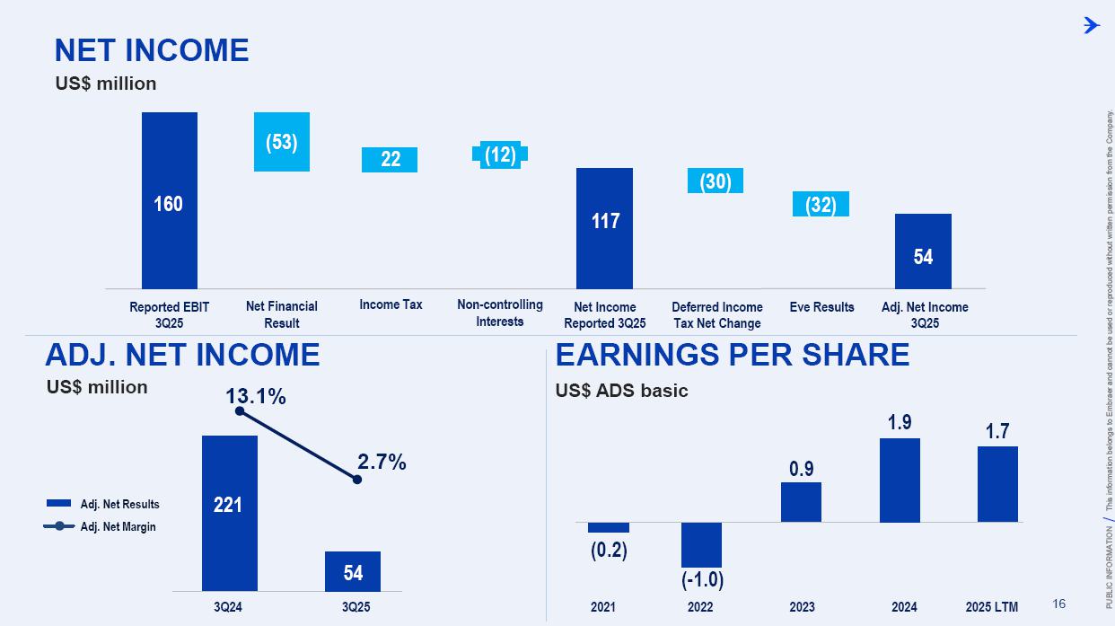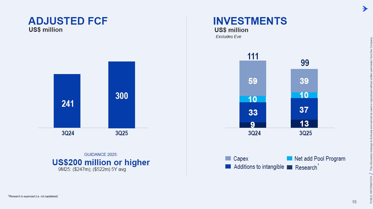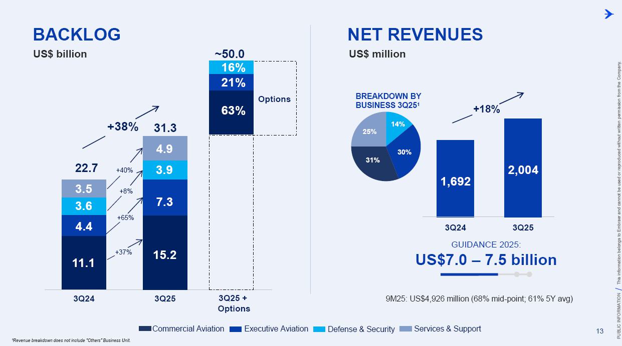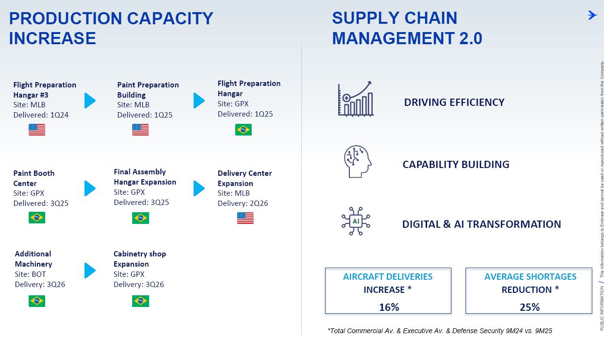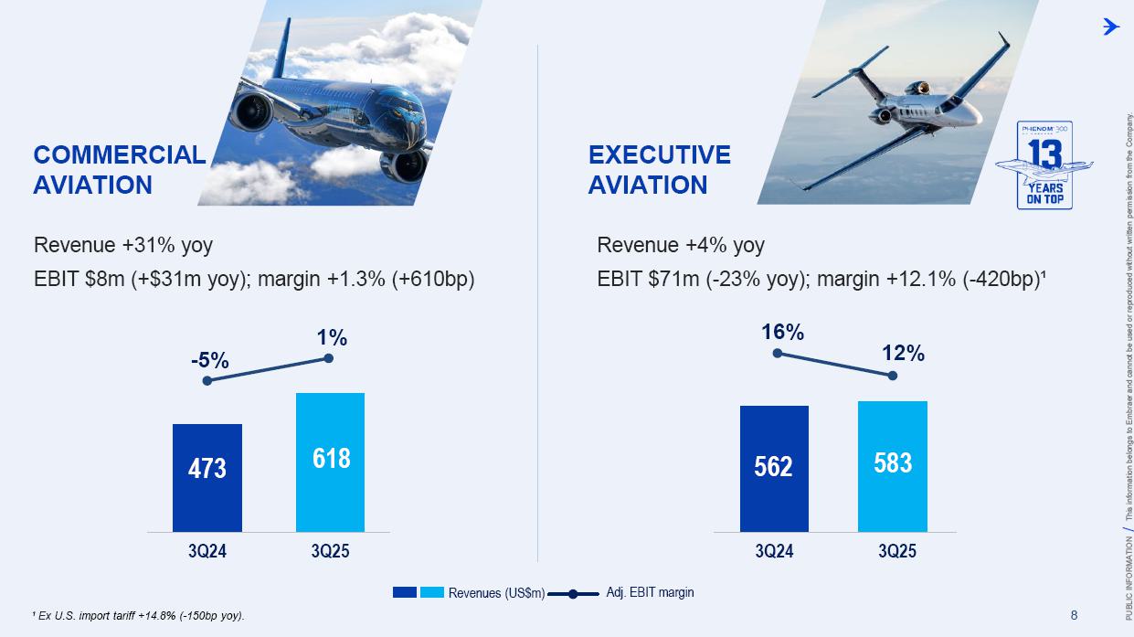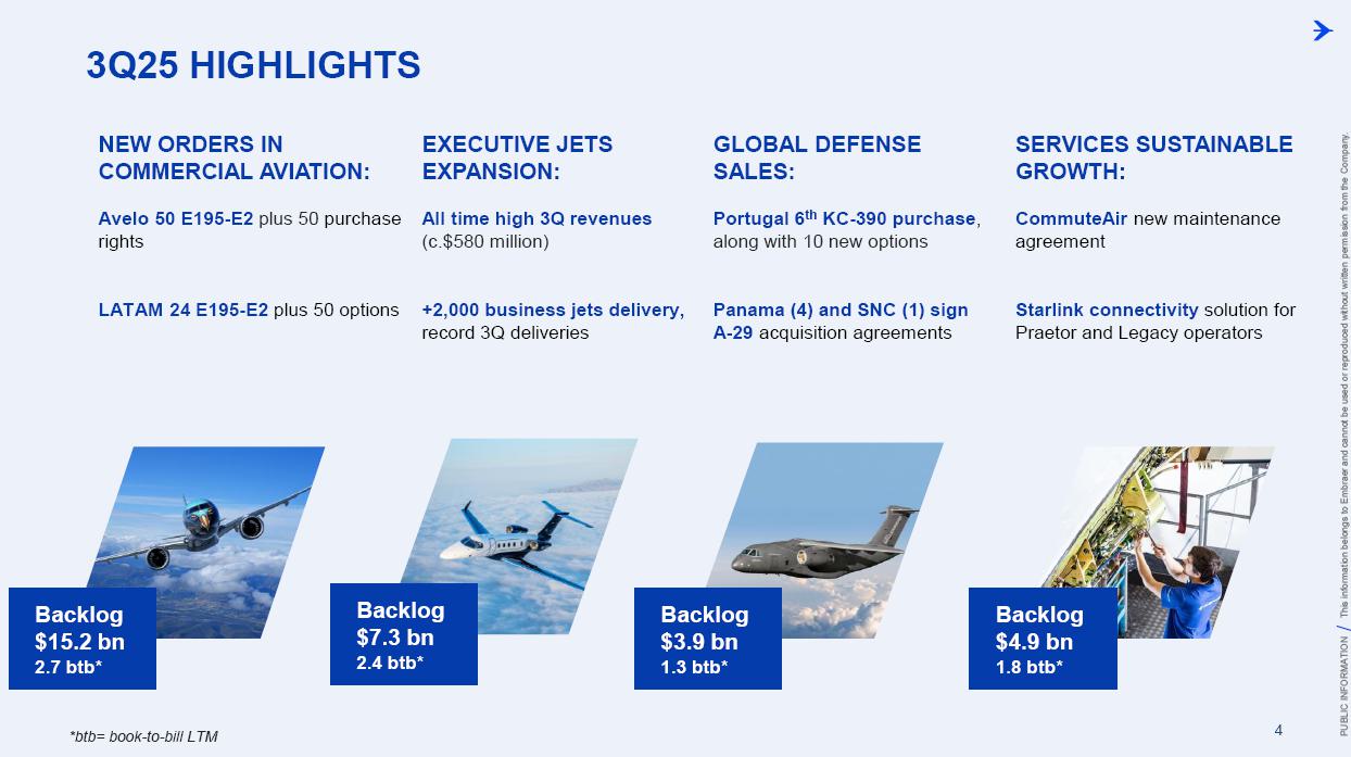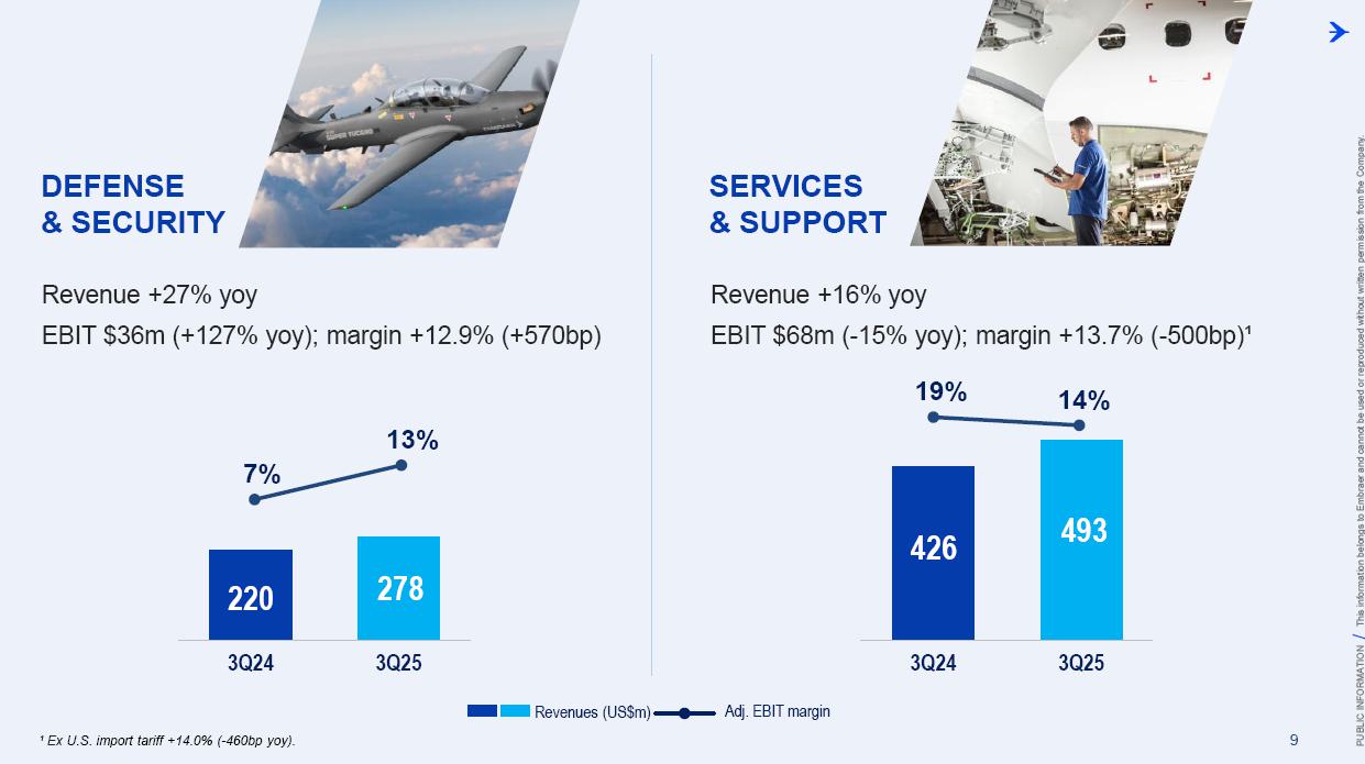 This information belongs to Embraer and cannot be used or reproduced without written permission PUBLIC INFORMATION from the Company. RESULTS3Q25 +2,000 Executive Jets delivered This information belongs to Embraer and cannot be used or reproduced without written permission PUBLIC INFORMATION from the Company. 2 DISCLAIMER This conference call may include statements about future events, based on Embraer's expectations and market financial trends. Such statements are subject to uncertainties that may cause actual results to differ from those expressed or implied in this conference call. Except in accordance with the applicable rules, the company assumes no obligation to publicly update any forward-looking statements. For detailed financial information, the company encourages reviewing publications filed by the company with the CVM. This information belongs to Embraer and cannot be used or reproduced without written permission PUBLIC INFORMATION from the Company. SUSTAINABLE GROWTH Driven by Efficiency and Innovation 3 Strong sales momentum with higher backlog across all BUs S&P rating upgrade to BBB High(er) margin across all BUs Substantial midterm growth and long-term focus on innovation Capacity increase and supply chain management Zero import tariffs push CULTURE FOUNDATION: SAFETY FIRST, QUALITY ALWAYS IN EVERYTHING WE DO! This information belongs to Embraer and cannot be used or reproduced without written permission PUBLIC INFORMATION from the Company. EXECUTIVE JETS EXPANSION: All time high 3Q revenues (c.$580 million) +2,000 business jets delivery, record 3Q deliveries 4 3Q25 HIGHLIGHTS Backlog$15.2 bn 2.7 btb* Backlog$4.9 bn 1.8 btb* Backlog$3.9 bn 1.3 btb* Backlog$7.3 bn 2.4 btb* GLOBAL DEFENSE SALES: Portugal 6th KC-390 purchase, along with 10 new options Panama (4) and SNC (1) sign A-29 acquisition agreements NEW ORDERS IN COMMERCIAL AVIATION: Avelo 50 E195-E2 plus 50 purchase rights LATAM 24 E195-E2 plus 50 options SERVICES SUSTAINABLE GROWTH: CommuteAir new maintenance agreement Starlink connectivity solution for Praetor and Legacy operators *btb= book-to-bill LTM This information belongs to Embraer and cannot be used or reproduced without written permission PUBLIC INFORMATION from the Company. 5 PRODUCTION LEAD TIME REDUCTION (2025 x 2021) PRAETOR KC-390 E-JETS 40% 33% 27% ¹ The gains indicated are based on the evolution compared to the baseline of each program over the past 5 years. 2025 2026 J F M A M J J A S O N D J F M A M J J A S O N D PRODUCTION LEVELING This information belongs to Embraer and cannot be used or reproduced without written permission PUBLIC INFORMATION from the Company. PRODUCTION CAPACITY INCREASE Flight Preparation Hangar #3Site: MLB Delivered: 1Q24 Paint PreparationBuildingSite: MLB Delivered: 1Q25 Flight PreparationHangarSite: GPX Delivered: 1Q25 Paint BoothCenterSite: GPX Delivered: 3Q25 Final AssemblyHangar ExpansionSite: GPX Delivered: 3Q25 Delivery CenterExpansionSite: MLB Delivery: 2Q26 AdditionalMachinerySite: BOT Delivery: 3Q26 Cabinetry shopExpansionSite: GPX Delivery: 3Q26 DRIVING EFFICIENCY CAPABILITY BUILDING DIGITAL & AI TRANSFORMATION AIRCRAFT DELIVERIES INCREASE * 16% AVERAGE SHORTAGES REDUCTION * 25% *Total Commercial Av. & Executive Av. & Defense Security 9M24 vs. 9M25 SUPPLY CHAIN MANAGEMENT 2.0 OPERATIONAL RESULTS 3Q25 This information belongs to Embraer and cannot be used or reproduced without written permission PUBLIC INFORMATION from the Company. 3Q24 3Q25 8 -5% 3Q24 1% 3Q25 16% 12% 583 562 618 473 Adj. EBIT margin Revenues (US$m) COMMERCIAL AVIATION EXECUTIVE AVIATION Revenue +4% yoy EBIT $71m (-23% yoy); margin +12.1% (-420bp)¹ Revenue +31% yoy EBIT $8m (+$31m yoy); margin +1.3% (+610bp) ¹ Ex U.S. import tariff +14.8% (-150bp yoy). This information belongs to Embraer and cannot be used or reproduced without written permission PUBLIC INFORMATION from the Company. 9 Revenue +16% yoy EBIT $68m (-15% yoy); margin +13.7% (-500bp)¹ Revenue +27% yoy EBIT $36m (+127% yoy); margin +12.9% (+570bp) DEFENSE & SECURITY SERVICES & SUPPORT Adj. EBIT margin Revenues (US$m) 3Q24 3Q25 7% 3Q24 13% 3Q25 19% 14% 493 426 278 220 ¹ Ex U.S. import tariff +14.0% (-460bp yoy). This information belongs to Embraer and cannot be used or reproduced without written permission PUBLIC INFORMATION from the Company. 10 FIRST FULL SCALE ENGINEERING PROTOTYPE TEST ENVELOPE FLIGHT SCHEDULED FOR LATE 2025 EARLY 2026 FINANCIAL RESULTS 3Q25 This information belongs to Embraer and cannot be used or reproduced without written permission PUBLIC INFORMATION from the Company. EXECUTIVE AVIATION Light Jets Midsize Jets COMMERCIAL AVIATION 3Q24 3Q25 41 41 3Q24 3Q25 7 GUIDANCE 2025: 77 to 85 9M25: 46 (57% mid-point; 55% 5Y avg) E1 E2 12 DELIVERIES GUIDANCE 2025: 145 to 155 9M25: 102 (68% mid-point; 57% 5Y avg) 23 22 19 18 12 4 13 7 16 20 +25% 0% This information belongs to Embraer and cannot be used or reproduced without written permission PUBLIC INFORMATION from the Company. US$ billion US$ million 14% 30% 31% 25% BREAKDOWN BY BUSINESS 3Q251 Services & Support Defense & Security Executive Aviation Commercial Aviation 1,692 3Q24 2,004 3Q25 +18% GUIDANCE 2025: US$7.0 – 7.5 billion 9M25: US$4,926 million (68% mid-point; 61% 5Y avg) 13 BACKLOG NET REVENUES ¹Revenue breakdown does not include “Others” Business Unit. +65% +8% +40% +37% 3.5 3.6 4.4 11.1 3Q24 4.9 3.9 7.3 15.2 3Q25 22.7 31.3 +38% 3Q25 + Options ~50.0 63% 21% 16% Options This information belongs to Embraer and cannot be used or reproduced without written permission PUBLIC INFORMATION from the Company. Reported EBITDA¹ 224 +11.2% 344 +20.3% 3Q24 3Q25 14 ADJUSTED EBITDA US$ million 160 +8.0% BREAKDOWN BY BUSINESS 3Q25 Reported EBIT¹ 3Q24 3Q25 Exec. D&S Com. S&S Other³ US$ million ADJUSTED EBIT 285 +16.9% Margin Margin 236 207 12.2% 11.8% 172 147 8.7% 8.6% 71 36 8 67 (10) ¹ Reported EBITDA and EBIT includes BA agreement and Eve expenses/warranties, all numbers from Eve are IFRS. ² Adjusted EBITDA and Adju