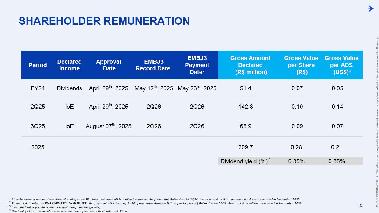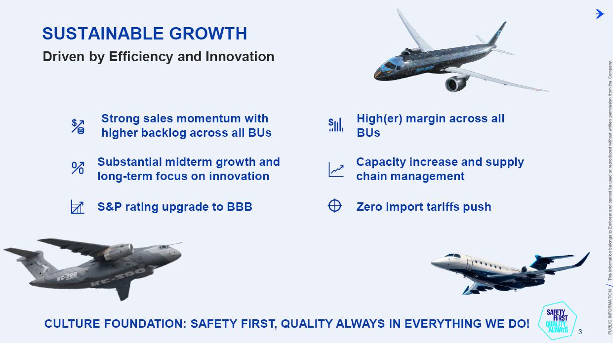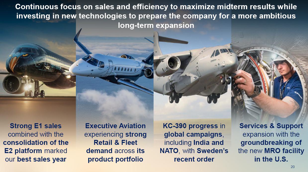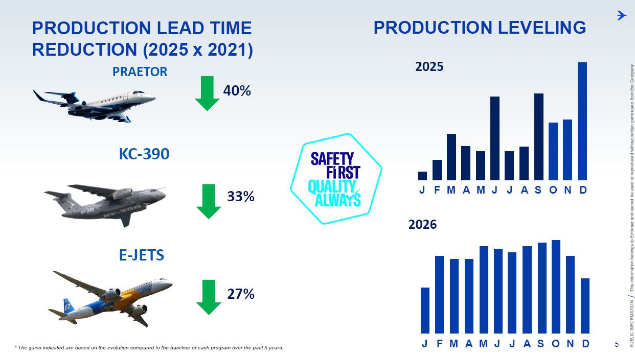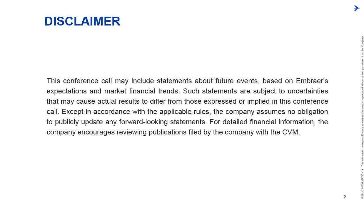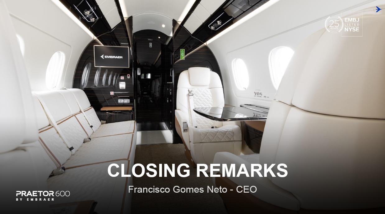 This information belongs to Embraer and cannot be used or reproduced without written permission PUBLIC INFORMATION from the Company. RESULTS3Q25 +2,000 Executive Jets delivered This information belongs to Embraer and cannot be used or reproduced without written permission PUBLIC INFORMATION from the Company. 2 DISCLAIMER This conference call may include statements about future events, based on Embraer's expectations and market financial trends. Such statements are subject to uncertainties that may cause actual results to differ from those expressed or implied in this conference call. Except in accordance with the applicable rules, the company assumes no obligation to publicly update any forward-looking statements. For detailed financial information, the company encourages reviewing publications filed by the company with the CVM. This information belongs to Embraer and cannot be used or reproduced without written permission PUBLIC INFORMATION from the Company. SUSTAINABLE GROWTH Driven by Efficiency and Innovation 3 Strong sales momentum with higher backlog across all BUs S&P rating upgrade to BBB High(er) margin across all BUs Substantial midterm growth and long-term focus on innovation Capacity increase and supply chain management Zero import tariffs push CULTURE FOUNDATION: SAFETY FIRST, QUALITY ALWAYS IN EVERYTHING WE DO! This information belongs to Embraer and cannot be used or reproduced without written permission PUBLIC INFORMATION from the Company. EXECUTIVE JETS EXPANSION: All time high 3Q revenues (c.$580 million) +2,000 business jets delivery, record 3Q deliveries 4 3Q25 HIGHLIGHTS Backlog$15.2 bn 2.7 btb* Backlog$4.9 bn 1.8 btb* Backlog$3.9 bn 1.3 btb* Backlog$7.3 bn 2.4 btb* GLOBAL DEFENSE SALES: Portugal 6th KC-390 purchase, along with 10 new options Panama (4) and SNC (1) sign A-29 acquisition agreements NEW ORDERS IN COMMERCIAL AVIATION: Avelo 50 E195-E2 plus 50 purchase rights LATAM 24 E195-E2 plus 50 options SERVICES SUSTAINABLE GROWTH: CommuteAir new maintenance agreement Starlink connectivity solution for Praetor and Legacy operators *btb= book-to-bill LTM This information belongs to Embraer and cannot be used or reproduced without written permission PUBLIC INFORMATION from the Company. 5 PRODUCTION LEAD TIME REDUCTION (2025 x 2021) PRAETOR KC-390 E-JETS 40% 33% 27% ¹ The gains indicated are based on the evolution compared to the baseline of each program over the past 5 years. 2025 2026 J F M A M J J A S O N D J F M A M J J A S O N D PRODUCTION LEVELING This information belongs to Embraer and cannot be used or reproduced without written permission PUBLIC INFORMATION from the Company. PRODUCTION CAPACITY INCREASE Flight Preparation Hangar #3Site: MLB Delivered: 1Q24 Paint PreparationBuildingSite: MLB Delivered: 1Q25 Flight PreparationHangarSite: GPX Delivered: 1Q25 Paint BoothCenterSite: GPX Delivered: 3Q25 Final AssemblyHangar ExpansionSite: GPX Delivered: 3Q25 Delivery CenterExpansionSite: MLB Delivery: 2Q26 AdditionalMachinerySite: BOT Delivery: 3Q26 Cabinetry shopExpansionSite: GPX Delivery: 3Q26 DRIVING EFFICIENCY CAPABILITY BUILDING DIGITAL & AI TRANSFORMATION AIRCRAFT DELIVERIES INCREASE * 16% AVERAGE SHORTAGES REDUCTION * 25% *Total Commercial Av. & Executive Av. & Defense Security 9M24 vs. 9M25 SUPPLY CHAIN MANAGEMENT 2.0 OPERATIONAL RESULTS 3Q25 This information belongs to Embraer and cannot be used or reproduced without written permission PUBLIC INFORMATION from the Company. 3Q24 3Q25 8 -5% 3Q24 1% 3Q25 16% 12% 583 562 618 473 Adj. EBIT margin Revenues (US$m) COMMERCIAL AVIATION EXECUTIVE AVIATION Revenue +4% yoy EBIT $71m (-23% yoy); margin +12.1% (-420bp)¹ Revenue +31% yoy EBIT $8m (+$31m yoy); margin +1.3% (+610bp) ¹ Ex U.S. import tariff +14.8% (-150bp yoy). This information belongs to Embraer and cannot be used or reproduced without written permission PUBLIC INFORMATION from the Company. 9 Revenue +16% yoy EBIT $68m (-15% yoy); margin +13.7% (-500bp)¹ Revenue +27% yoy EBIT $36m (+127% yoy); margin +12.9% (+570bp) DEFENSE & SECURITY SERVICES & SUPPORT Adj. EBIT margin Revenues (US$m) 3Q24 3Q25 7% 3Q24 13% 3Q25 19% 14% 493 426 278 220 ¹ Ex U.S. import tariff +14.0% (-460bp yoy). This information belongs to Embraer and cannot be used or reproduced without written permission PUBLIC INFORMATION from the Company. 10 FIRST FULL SCALE ENGINEERING PROTOTYPE TEST ENVELOPE FLIGHT SCHEDULED FOR LATE 2025 EARLY 2026 FINANCIAL RESULTS 3Q25 This information belongs to Embraer and cannot be used or reproduced without written permission PUBLIC INFORMATION from the Company. EXECUTIVE AVIATION Light Jets Midsize Jets COMMERCIAL AVIATION 3Q24 3Q25 41 41 3Q24 3Q25 7 GUIDANCE 2025: 77 to 85 9M25: 46 (57% mid-point; 55% 5Y avg) E1 E2 12 DELIVERIES GUIDANCE 2025: 145 to 155 9M25: 102 (68% mid-point; 57% 5Y avg) 23 22 19 18 12 4 13 7 16 20 +25% 0% This information belongs to Embraer and cannot be used or reproduced without written permission PUBLIC INFORMATION from the Company. US$ billion US$ million 14% 30% 31% 25% BREAKDOWN BY BUSINESS 3Q251 Services & Support Defense & Security Executive Aviation Commercial Aviation 1,692 3Q24 2,004 3Q25 +18% GUIDANCE 2025: US$7.0 – 7.5 billion 9M25: US$4,926 million (68% mid-point; 61% 5Y avg) 13 BACKLOG NET REVENUES ¹Revenue breakdown does not include “Others” Business Unit. +65% +8% +40% +37% 3.5 3.6 4.4 11.1 3Q24 4.9 3.9 7.3 15.2 3Q25 22.7 31.3 +38% 3Q25 + Options ~50.0 63% 21% 16% Options This information belongs to Embraer and cannot be used or reproduced without written permission PUBLIC INFORMATION from the Company. Reported EBITDA¹ 224 +11.2% 344 +20.3% 3Q24 3Q25 14 ADJUSTED EBITDA US$ million 160 +8.0% BREAKDOWN BY BUSINESS 3Q25 Reported EBIT¹ 3Q24 3Q25 Exec. D&S Com. S&S Other³ US$ million ADJUSTED EBIT 285 +16.9% Margin Margin 236 207 12.2% 11.8% 172 147 8.7% 8.6% 71 36 8 67 (10) ¹ Reported EBITDA and EBIT includes BA agreement and Eve expenses/warranties, all numbers from Eve are IFRS. ² Adjusted EBITDA and Adju