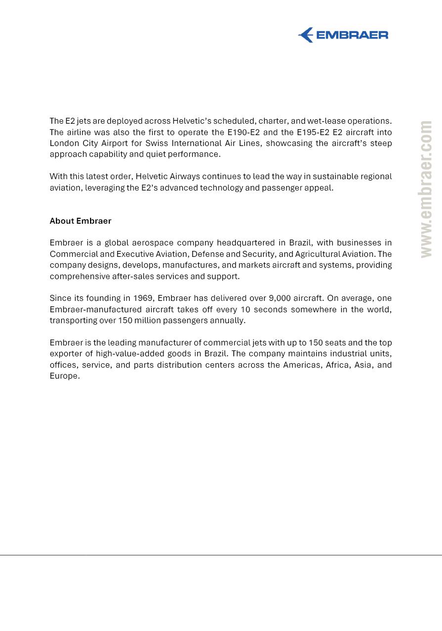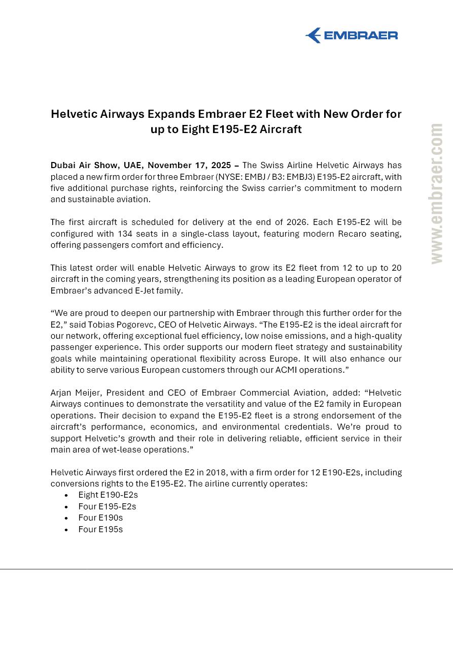 Helvetic Airways Expands Embraer E2 Fleet with New Order for up to Eight E195-E2 Aircraft Dubai Air Show, UAE, November 17, 2025 – The Swiss Airline Helvetic Airways has placed a new firm order for three Embraer (NYSE: EMBJ / B3: EMBJ3) E195-E2 aircraft, with five additional purchase rights, reinforcing the Swiss carrier’s commitment to modern and sustainable aviation. The first aircraft is scheduled for delivery at the end of 2026. Each E195-E2 will be configured with 134 seats in a single-class layout, featuring modern Recaro seating, offering passengers comfort and efficiency. This latest order will enable Helvetic Airways to grow its E2 fleet from 12 to up to 20 aircraft in the coming years, strengthening its position as a leading European operator of Embraer’s advanced E-Jet family. “We are proud to deepen our partnership with Embraer through this further order for the E2,” said Tobias Pogorevc, CEO of Helvetic Airways. “The E195-E2 is the ideal aircraft for our network, offering exceptional fuel efficiency, low noise emissions, and a high-quality passenger experience. This order supports our modern fleet strategy and sustainability goals while maintaining operational flexibility across Europe. It will also enhance our ability to serve various European customers through our ACMI operations.” Arjan Meijer, President and CEO of Embraer Commercial Aviation, added: “Helvetic Airways continues to demonstrate the versatility and value of the E2 family in European operations. Their decision to expand the E195-E2 fleet is a strong endorsement of the aircraft’s performance, economics, and environmental credentials. We’re proud to support Helvetic’s growth and their role in delivering reliable, efficient service in their main area of wet-lease operations.” Helvetic Airways first ordered the E2 in 2018, with a firm order for 12 E190-E2s, including conversions rights to the E195-E2. The airline currently operates: • Eight E190-E2s • Four E195-E2s • Four E190s • Four E195s The E2 jets are deployed across Helvetic’s scheduled, charter, and wet-lease operations. The airline was also the first to operate the E190-E2 and the E195-E2 E2 aircraft into London City Airport for Swiss International Air Lines, showcasing the aircraft’s steep approach capability and quiet performance. With this latest order, Helvetic Airways continues to lead the way in sustainable regional aviation, leveraging the E2’s advanced technology and passenger appeal. About Embraer Embraer is a global aerospace company headquartered in Brazil, with businesses in Commercial and Executive Aviation, Defense and Security, and Agricultural Aviation. The company designs, develops, manufactures, and markets aircraft and systems, providing comprehensive after-sales services and support. Since its founding in 1969, Embraer has delivered over 9,000 aircraft. On average, one Embraer-manufactured aircraft takes off every 10 seconds somewhere in the world, transporting over 150 million passengers annually. Embraer is the leading manufacturer of commercial jets with up to 150 seats and the top exporter of high-value-added goods in Brazil. The company maintains industrial units, offices, service, and parts distribution centers across the Americas, Africa, Asia, and Europe.