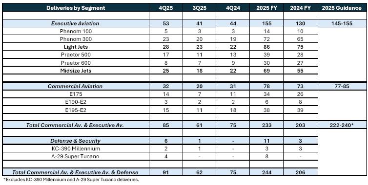 In 2025, the company delivered a total of 244 aircraft across Commercial Aviation, Executive Aviation and Defense & Security, surpassing the 206 units delivered in the previous year.