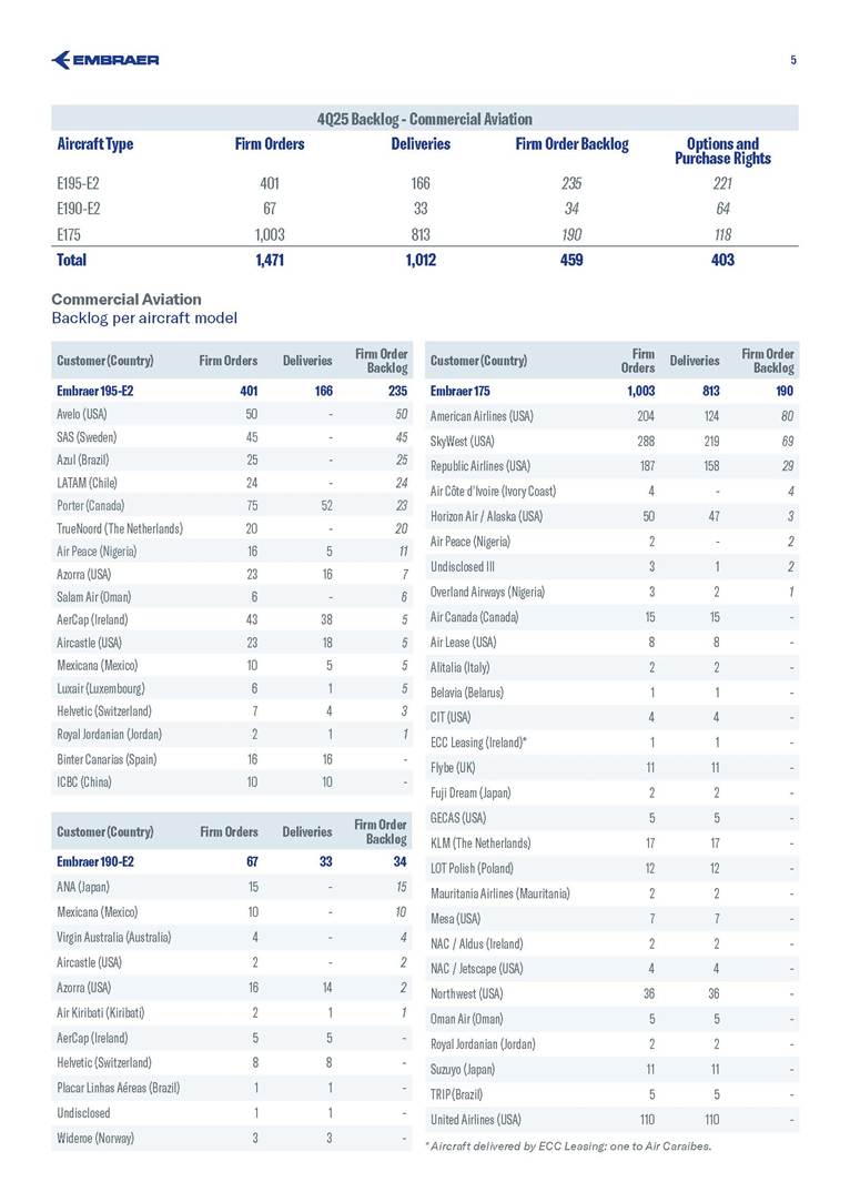 BACKLOG & DELIVERIES 4Q25 Embraer’s backlog reached US$31.6 billion in 4Q25 – a record‑setting level The company wide backlog expanded +20% year-over-year (yoy) in 4Q25 +20% The E195-E2 small narrowbody will expand TrueNoord and Helvetic Airways’ fleets E195-E2 Air Côte d’Ivoire orders E175 to boost regional connectivity E175 Commercial Aviation reported a US$14.5 billion backlog 14.5 bn Executive Aviation recorded a new US$7.6 billion all-time high backlog +4% quarter-over-quarter (qoq) 7.6 bn Defense & Security sold 5 KC-390 to Sweden and Portugal KC-390 Services & Support sustained its record-high US$4.9 billion backlog, up 7% yoy 4.9 bn 3 São Paulo (SP), Brazil, January 27, 2026 Embraer (NYSE: EMBJ / B3: EMBJ3), a global leader in the aerospace industry, registered a US$31.6 billion backlog in the fourth quarter (4Q25) – a record‑setting level for the company. Embraer delivered 91 aircraft in 4Q25 across all its business units. The result reflects a 21% increase compared to the 75 deliveries in the fourth quarter of last year (4Q24), and even higher than the 62 aircraft registered in the third quarter of 2025 (3Q25). Meanwhile, the company delivered a total of 244 aircraft in 2025 - an 18% increase compared to the 206 aircraft in 2024. Business Unit 4Q25 3Q25 4Q24 2025 FY 2024 FY 2025 Guidance Executive Aviation 53 41 44 155 130 145-155 Phenom 100 5 3 3 14 10 Phenom 300 23 20 19 72 65 Light Jets 28 23 22 86 75 Praetor 500 17 11 13 39 28 Praetor 600 8 7 9 30 27 Midsize Jets 25 18 22 69 55 Commercial Aviation 32 20 31 78 73 77-85 E175 14 7 11 34 26 E190-E2 3 2 2 6 8 E195-E2 15 11 18 38 39 Total Commercial Av. & Executive Av. 85 61 75 233 203 222-240* Defense & Security 6 1 — 11 3 KC-390 Millennium 2 1 — 3 3 A-29 Super Tucano 4 — — 8 — Total Commercial Av. & Executive Av. & Defense 91 62 75 244 206 Business Unit 4Q25 3Q25 qoq 4Q24 yoy Commercial Aviation 14.5 15.2 -5% 10.2 42% Executive Aviation 7.6 7.3 4% 7.4 3% Defense & Security 4.6 3.9 18% 4.2 10% Services & Support 4.9 4.9 0% 4.6 7% Total 31.6 31.3 1% 26.4 20% Backlog by Segment - US$ bn *Excludes KC-390 Millennium and A-29 Super Tucano deliveries. Deliveries by Segment 4 Commercial Aviation Highlights Commercial Aviation reported a US$14.5 billion backlog in 4Q25. The backlog was up 42% compared to 4Q24, but 5% lower than 3Q25 because of the renegotiation of Azul’s order during its Chapter 11 process. The business unit delivered 32 new aircraft in the last quarter of 2025 and 78 during the full year (in line with its 77-85 guidance for the period). Consequently, Commercial Aviation finished 2025 with a strong 2.8x book-to-bill ratio. During the quarter, Embraer announced TrueNoord and Helvetic Airways will expand their E‑Jet fleets. TrueNoord signed a firm order for 20 E195‑E2 jets—marking its first direct order with an aircraft manufacturer—which also includes purchase rights for up to an additional 20 E195‑E2s and up to 10 E175‑E1s. Meanwhile, Helvetic Airways reinforced its commitment to modern aviation with a firm order for 3 E195‑E2s and 5 additional purchase rights. 9% 12% 24% 23% 26% 20% 41% 45% The company also announced the E175 will join Air Côte d’Ivoire’s fleet. The airline has signed a firm order for 4 aircraft, with 8 additional purchase rights, to modernize its fleet and improve regional connectivity. First delivery is expected in the first half of 2027. Azul renegotiated its firm order for E195‑E2 aircraft, reducing the number of units from 51 to 25, as disclosed to the market on December 23, 2025. The renegotiation took place amid Azul’s Chapter 11 process. The models delivered during the period were the E175 to American Airlines (6), Republic Airlines (3) and SkyWest (5); the E190-E2 to Azorra (3); and the E195-E2 to AerCap (7), Azorra (1), Luxair (1), Mexicana (2) and Porter (4). E190-E2 5 4Q25 Backlog - Commercial Aviation Aircraft Type Firm Orders Deliveries Firm Order Backlog Options and Purchase Rights E195-E2 401 166 235 221 E190-E2 67 33 34 64 E175 1,003 813 190 118 Total 1,471 1,012 459 403 Commercial Aviation Backlog per aircraft model Customer (Country) Firm Orders Deliveries Firm Order Backlog Embraer 190-E2 67 33 34 ANA (Japan) 15 - 15 Mexicana (Mexico) 10 - 10 Virgin Australia (Australia) 4 - 4 Aircastle (USA) 2 - 2 Azorra (USA) 16 14 2 Air Kiribati (Kiribati) 2 1 1 AerCap (Ireland) 5 5 - Helvetic (Switzerland) 8 8 - Placar Linhas Aéreas (Brazil) 1 1 - Undisclosed 1 1 - Wideroe (Norway) 3 3 - Customer (Country) Firm Orders Deliveries Firm Order Backlog Embraer 195-E2 401 166 235 Avelo (USA) 50 - 50 SAS (Sweden) 45 - 45 Azul (Brazil) 25 - 25 LATAM (Chile) 24 - 24 Porter (Canada) 75 52 23 TrueNoord (The Netherlands) 20 - 20 Air Peace (Nigeria) 16 5 11 Azorra (USA) 23 16 7 Salam Air (Oman) 6 - 6 AerCap (Ireland) 43 38 5 Aircastle (USA) 23 18 5 Mexicana (Mexico) 10 5 5 Luxair (Luxembourg) 6 1 5 Helvetic (Switzerland) 7 4 3 Royal Jordanian (Jordan) 2 1 1 Binter Canarias (Spain) 16 16 - ICBC (China) 10 10 - Customer (Country) Firm Orders Deliveries Firm Order Backlog Embraer 175 1,003 813 190 American Airlines (USA) 204 124 80 SkyWest (USA) 288 219 69 Republic Airlines (USA) 187 158 29 Air Côte d’Ivoire (Ivory Coast) 4 - 4 Horizon Air / Alaska (USA) 50 47 3 Air Peace (Nigeria) 2 - 2 Undisclosed III 3 1 2 Overland Airways (Nigeria) 3 2 1 Air Canada (Canada) 15 15 - Air Lease (USA) 8 8 - Alitalia (Italy) 2 2 - Belavia (Belarus) 1 1 - CIT (USA) 4 4 - ECC Leasing (Ireland)* 1 1 - Flybe (UK) 11 11 - Fuji Dream (Japan) 2 2 - GECAS (USA) 5 5 - KLM (The Netherlands) 17 17 - LOT Polish (Poland) 12 12 - Mauritania Airlines (Mauritania) 2 2 - Mesa (USA) 7 7 - NAC / Aldus (Ireland) 2 2 - NAC / Jetscape (USA) 4 4 - Northwest (USA) 36 36 - Oman Air (Oman) 5 5 - Royal Jordanian (Jordan) 2 2 - Suzuyo (Japan) 11 11 - TRIP (Brazil) 5 5 - United Airlines (USA) 110 110 - * Aircraft delivered by ECC Leasing: one to Air Caraibes. 6 Executive Aviation Highlights Executive Av