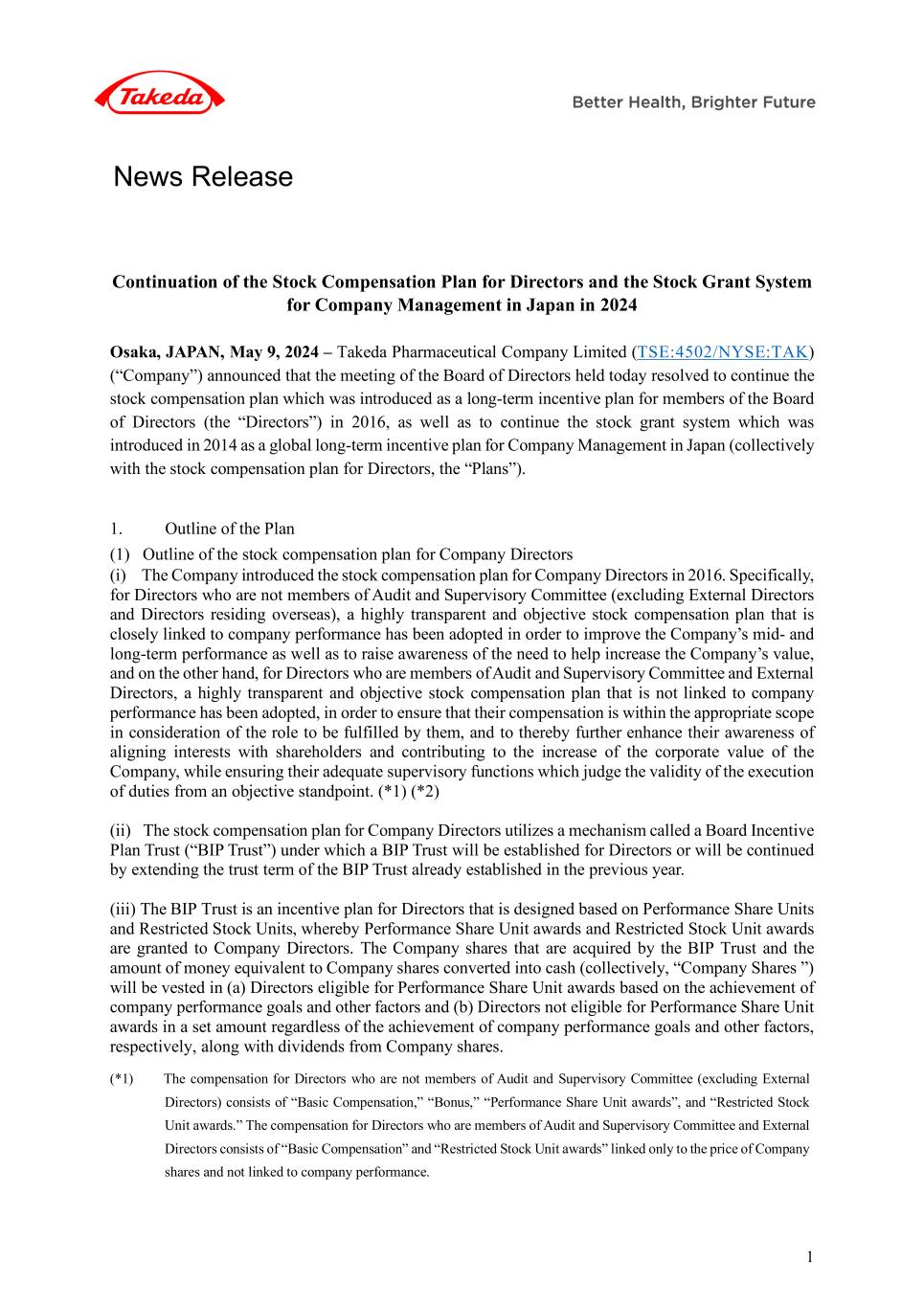 1 Continuation of the Stock Compensation Plan for Directors and the Stock Grant System for Company Management in Japan in 2024 Osaka, JAPAN, May 9, 2024 – Takeda Pharmaceutical Company Limited (TSE:4502/NYSE:TAK) (“Company”) announced that the meeting of the Board of Directors held today resolved to continue the stock compensation plan which was introduced as a long-term incentive plan for members of the Board of Directors (the “Directors”) in 2016, as well as to continue the stock grant system which was introduced in 2014 as a global long-term incentive plan for Company Management in Japan (collectively with the stock compensation plan for Directors, the “Plans”). 1. Outline of the Plan (1) Outline of the stock compensation plan for Company Directors (i) The Company introduced the stock compensation plan for Company Directors in 2016. Specifically, for Directors who are not members of Audit and Supervisory Committee (excluding External Directors and Directors residing overseas), a highly transparent and objective stock compensation plan that is closely linked to company performance has been adopted in order to improve the Company’s mid- and long-term performance as well as to raise awareness of the need to help increase the Company’s value, and on the other hand, for Directors who are members of Audit and Supervisory Committee and External Directors, a highly transparent and objective stock compensation plan that is not linked to company performance has been adopted, in order to ensure that their compensation is within the appropriate scope in consideration of the role to be fulfilled by them, and to thereby further enhance their awareness of aligning interests with shareholders and contributing to the increase of the corporate value of the Company, while ensuring their adequate supervisory functions which judge the validity of the execution of duties from an objective standpoint. (*1) (*2) (ii) The stock compensation plan for Company Directors utilizes a mechanism called a Board Incentive Plan Trust (“BIP Trust”) under which a BIP Trust will be established for Directors or will be continued by extending the trust term of the BIP Trust already established in the previous year. (iii) The BIP Trust is an incentive plan for Directors that is designed based on Performance Share Units and Restricted Stock Units, whereby Performance Share Unit awards and Restricted Stock Unit awards are granted to Company Directors. The Company shares that are acquired by the BIP Trust and the amount of money equivalent to Company shares converted into cash (collectively, “Company Shares ”) will be vested in (a) Directors eligible for Performance Share Unit awards based on the achievement of company performance goals and other factors and (b) Directors not eligible for Performance Share Unit awards in a set amount regardless of the achievement of company performance goals and other factors, respectively, along with dividends from Company shares. (*1) The compensation for Directors who are not members of Audit and Supervisory Committee (excluding External Directors) consists of “Basic Compensation,” “Bonus,” “Performance Share Unit awards”, and “Restricted Stock Unit awards.” The compensation for Directors who are members of Audit and Supervisory Committee and External Directors consists of “Basic Compensation” and “Restricted Stock Unit awards” linked only to the price of Company shares and not linked to company performance. News Release