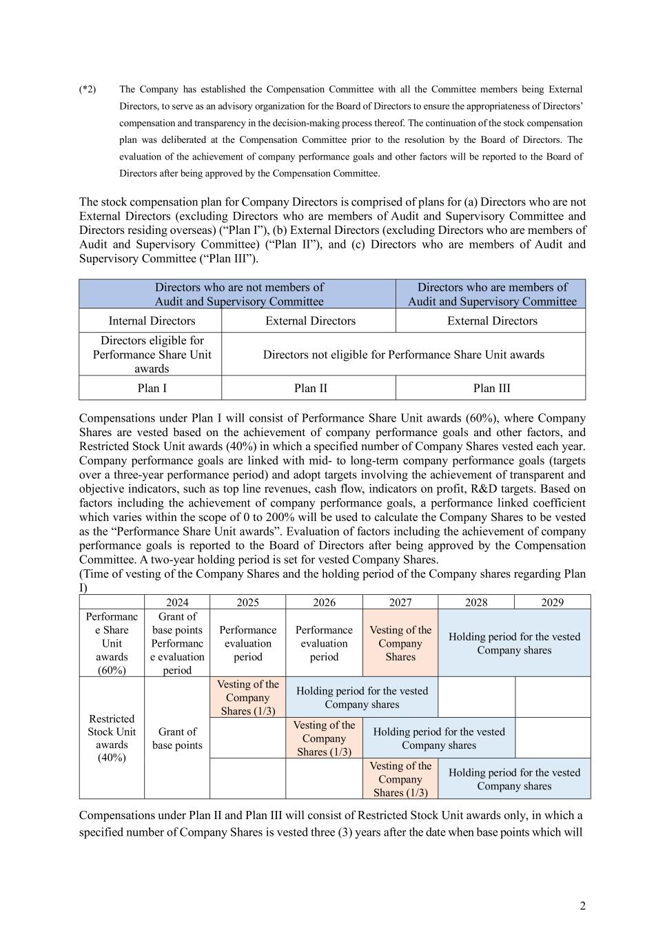 2 (*2) The Company has established the Compensation Committee with all the Committee members being External Directors, to serve as an advisory organization for the Board of Directors to ensure the appropriateness of Directors’ compensation and transparency in the decision-making process thereof. The continuation of the stock compensation plan was deliberated at the Compensation Committee prior to the resolution by the Board of Directors. The evaluation of the achievement of company performance goals and other factors will be reported to the Board of Directors after being approved by the Compensation Committee. The stock compensation plan for Company Directors is comprised of plans for (a) Directors who are not External Directors (excluding Directors who are members of Audit and Supervisory Committee and Directors residing overseas) (“Plan I”), (b) External Directors (excluding Directors who are members of Audit and Supervisory Committee) (“Plan II”), and (c) Directors who are members of Audit and Supervisory Committee (“Plan III”). Directors who are not members of Audit and Supervisory Committee Directors who are members of Audit and Supervisory Committee Internal Directors External Directors External Directors Directors eligible for Performance Share Unit awards Directors not eligible for Performance Share Unit awards Plan I Plan II Plan III Compensations under Plan I will consist of Performance Share Unit awards (60%), where Company Shares are vested based on the achievement of company performance goals and other factors, and Restricted Stock Unit awards (40%) in which a specified number of Company Shares vested each year. Company performance goals are linked with mid- to long-term company performance goals (targets over a three-year performance period) and adopt targets involving the achievement of transparent and objective indicators, such as top line revenues, cash flow, indicators on profit, R&D targets. Based on factors including the achievement of company performance goals, a performance linked coefficient which varies within the scope of 0 to 200% will be used to calculate the Company Shares to be vested as the “Performance Share Unit awards”. Evaluation of factors including the achievement of company performance goals is reported to the Board of Directors after being approved by the Compensation Committee. A two-year holding period is set for vested Company Shares. (Time of vesting of the Company Shares and the holding period of the Company shares regarding Plan I) 2024 2025 2026 2027 2028 2029 Performanc e Share Unit awards (60%) Grant of base points Performanc e evaluation period Performance evaluation period Performance evaluation period Vesting of the Company Shares Holding period for the vested Company shares Restricted Stock Unit awards (40%) Grant of base points Vesting of the Company Shares (1/3) Holding period for the vested Company shares Vesting of the Company Shares (1/3) Holding period for the vested Company shares Vesting of the Company Shares (1/3) Holding period for the vested Company shares Compensations under Plan II and Plan III will consist of Restricted Stock Unit awards only, in which a specified number of Company Shares is vested three (3) years after the date when base points which will