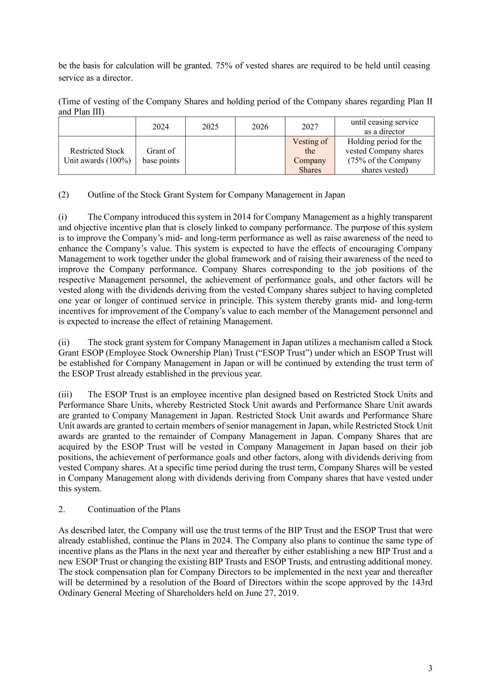 3 be the basis for calculation will be granted. 75% of vested shares are required to be held until ceasing service as a director. (Time of vesting of the Company Shares and holding period of the Company shares regarding Plan II and Plan III) 2024 2025 2026 2027 until ceasing service as a director Restricted Stock Unit awards (100%) Grant of base points Vesting of the Company Shares Holding period for the vested Company shares (75% of the Company shares vested) (2) Outline of the Stock Grant System for Company Management in Japan (i) The Company introduced this system in 2014 for Company Management as a highly transparent and objective incentive plan that is closely linked to company performance. The purpose of this system is to improve the Company’s mid- and long-term performance as well as raise awareness of the need to enhance the Company’s value. This system is expected to have the effects of encouraging Company Management to work together under the global framework and of raising their awareness of the need to improve the Company performance. Company Shares corresponding to the job positions of the respective Management personnel, the achievement of performance goals, and other factors will be vested along with the dividends deriving from the vested Company shares subject to having completed one year or longer of continued service in principle. This system thereby grants mid- and long-term incentives for improvement of the Company’s value to each member of the Management personnel and is expected to increase the effect of retaining Management. (ii) The stock grant system for Company Management in Japan utilizes a mechanism called a Stock Grant ESOP (Employee Stock Ownership Plan) Trust (“ESOP Trust”) under which an ESOP Trust will be established for Company Management in Japan or will be continued by extending the trust term of the ESOP Trust already established in the previous year. (iii) The ESOP Trust is an employee incentive plan designed based on Restricted Stock Units and Performance Share Units, whereby Restricted Stock Unit awards and Performance Share Unit awards are granted to Company Management in Japan. Restricted Stock Unit awards and Performance Share Unit awards are granted to certain members of senior management in Japan, while Restricted Stock Unit awards are granted to the remainder of Company Management in Japan. Company Shares that are acquired by the ESOP Trust will be vested in Company Management in Japan based on their job positions, the achievement of performance goals and other factors, along with dividends deriving from vested Company shares. At a specific time period during the trust term, Company Shares will be vested in Company Management along with dividends deriving from Company shares that have vested under this system. 2. Continuation of the Plans As described later, the Company will use the trust terms of the BIP Trust and the ESOP Trust that were already established, continue the Plans in 2024. The Company also plans to continue the same type of incentive plans as the Plans in the next year and thereafter by either establishing a new BIP Trust and a new ESOP Trust or changing the existing BIP Trusts and ESOP Trusts, and entrusting additional money. The stock compensation plan for Company Directors to be implemented in the next year and thereafter will be determined by a resolution of the Board of Directors within the scope approved by the 143rd Ordinary General Meeting of Shareholders held on June 27, 2019.