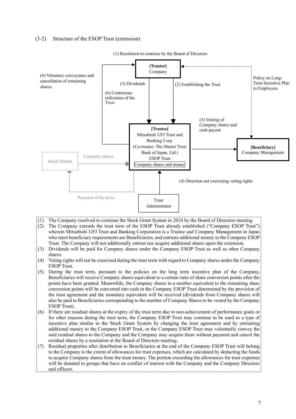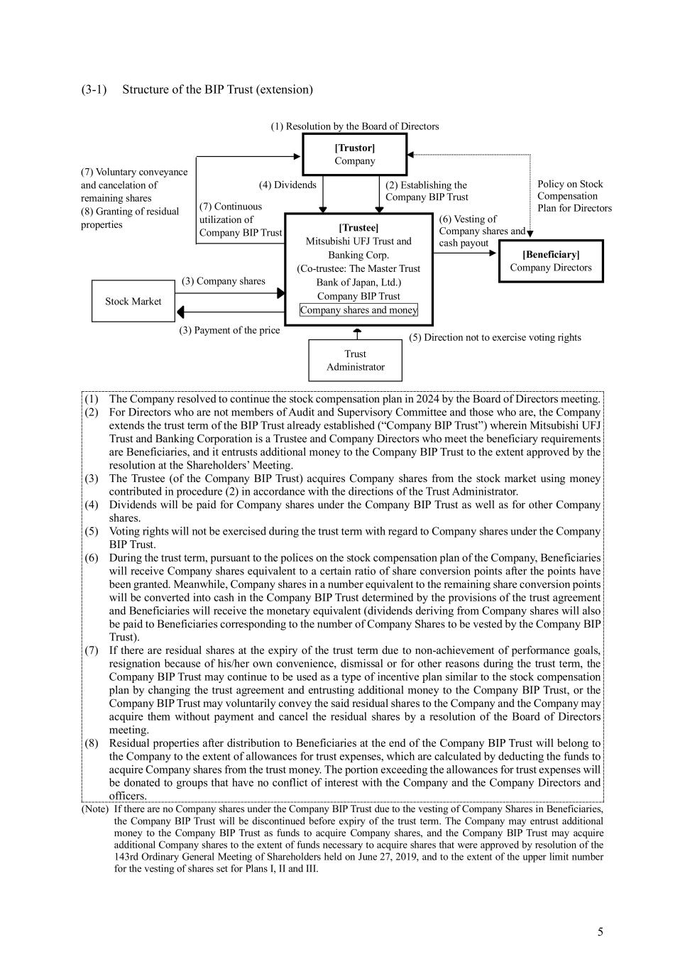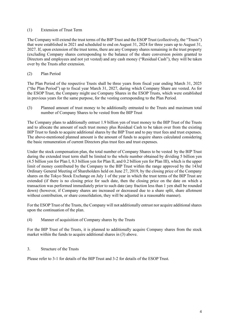 4 (1) Extension of Trust Term The Company will extend the trust terms of the BIP Trust and the ESOP Trust (collectively, the “Trusts”) that were established in 2021 and scheduled to end on August 31, 2024 for three years up to August 31, 2027. If, upon extension of the trust terms, there are any Company shares remaining in the trust property (excluding Company shares corresponding to the balance of the share conversion points granted to Directors and employees and not yet vested) and any cash money (“Residual Cash”), they will be taken over by the Trusts after extension. (2) Plan Period The Plan Period of the respective Trusts shall be three years from fiscal year ending March 31, 2025 (“the Plan Period”) up to fiscal year March 31, 2027, during which Company Share are vested. As for the ESOP Trust, the Company might use Company Shares in the ESOP Trusts, which were established in previous years for the same purpose, for the vesting corresponding to the Plan Period. (3) Planned amount of trust money to be additionally entrusted to the Trusts and maximum total number of Company Shares to be vested from the BIP Trust The Company plans to additionally entrust 1.9 billion yen of trust money to the BIP Trust of the Trusts and to allocate the amount of such trust money plus Residual Cash to be taken over from the existing BIP Trust to funds to acquire additional shares by the BIP Trust and to pay trust fees and trust expenses. The above-mentioned planned amount is the amount of funds to acquire shares calculated considering the basic remuneration of current Directors plus trust fees and trust expenses. Under the stock compensation plan, the total number of Company Shares to be vested by the BIP Trust during the extended trust term shall be limited to the whole number obtained by dividing 5 billion yen (4.5 billion yen for Plan Ⅰ, 0.3 billion yen for Plan II, and 0.2 billion yen for Plan III), which is the upper limit of money contributed by the Company to the BIP Trust within the range approved by the 143rd Ordinary General Meeting of Shareholders held on June 27, 2019, by the closing price of the Company shares on the Tokyo Stock Exchange on July 1 of the year in which the trust terms of the BIP Trust are extended (if there is no closing price for such date, then the closing price on the date on which a transaction was performed immediately prior to such date (any fraction less than 1 yen shall be rounded down) (however, if Company shares are increased or decreased due to a share split, share allotment without contribution, or share consolidation, they will be adjusted in a reasonable manner). For the ESOP Trust of the Trusts, the Company will not additionally entrust nor acquire additional shares upon the continuation of the plan. (4) Manner of acquisition of Company shares by the Trusts For the BIP Trust of the Trusts, it is planned to additionally acquire Company shares from the stock market within the funds to acquire additional shares in (3) above. 3. Structure of the Trusts Please refer to 3-1 for details of the BIP Trust and 3-2 for details of the ESOP Trust.