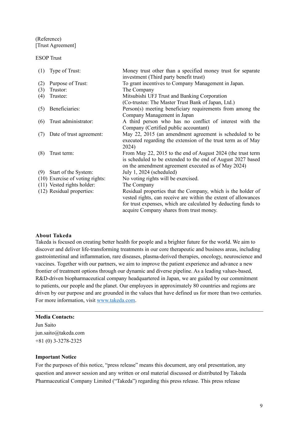 9 (Reference) [Trust Agreement] ESOP Trust (1) Type of Trust: Money trust other than a specified money trust for separate investment (Third party benefit trust) (2) Purpose of Trust: To grant incentives to Company Management in Japan. (3) Trustor: The Company (4) Trustee: Mitsubishi UFJ Trust and Banking Corporation (Co-trustee: The Master Trust Bank of Japan, Ltd.) (5) Beneficiaries: Person(s) meeting beneficiary requirements from among the Company Management in Japan (6) Trust administrator: A third person who has no conflict of interest with the Company (Certified public accountant) (7) Date of trust agreement: May 22, 2015 (an amendment agreement is scheduled to be executed regarding the extension of the trust term as of May 2024) (8) Trust term: From May 22, 2015 to the end of August 2024 (the trust term is scheduled to be extended to the end of August 2027 based on the amendment agreement executed as of May 2024) (9) Start of the System: July 1, 2024 (scheduled) (10) Exercise of voting rights: No voting rights will be exercised. (11) Vested rights holder: The Company (12) Residual properties: Residual properties that the Company, which is the holder of vested rights, can receive are within the extent of allowances for trust expenses, which are calculated by deducting funds to acquire Company shares from trust money. About Takeda Takeda is focused on creating better health for people and a brighter future for the world. We aim to discover and deliver life-transforming treatments in our core therapeutic and business areas, including gastrointestinal and inflammation, rare diseases, plasma-derived therapies, oncology, neuroscience and vaccines. Together with our partners, we aim to improve the patient experience and advance a new frontier of treatment options through our dynamic and diverse pipeline. As a leading values-based, R&D-driven biopharmaceutical company headquartered in Japan, we are guided by our commitment to patients, our people and the planet. Our employees in approximately 80 countries and regions are driven by our purpose and are grounded in the values that have defined us for more than two centuries. For more information, visit www.takeda.com. Media Contacts: Jun Saito jun.saito@takeda.com +81 (0) 3-3278-2325 Important Notice For the purposes of this notice, “press release” means this document, any oral presentation, any question and answer session and any written or oral material discussed or distributed by Takeda Pharmaceutical Company Limited (“Takeda”) regarding this press release. This press release