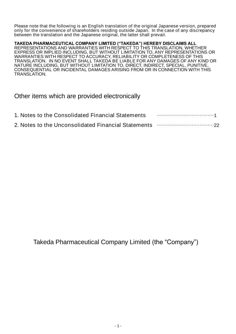 - 1 - Please note that the following is an English translation of the original Japanese version, prepared only for the convenience of shareholders residing outside Japan. In the case of any discrepancy between the translation and the Japanese original, the latter shall prevail. TAKEDA PHARMACEUTICAL COMPANY LIMITED (“TAKEDA”) HEREBY DISCLAIMS ALL REPRESENTATIONS AND WARRANTIES WITH RESPECT TO THIS TRANSLATION, WHETHER EXPRESS OR IMPLIED INCLUDING, BUT WITHOUT LIMITATION TO, ANY REPRESENTATIONS OR WARRANTIES WITH RESPECT TO ACCURACY, RELIABILITY OR COMPLETENESS OF THIS TRANSLATION. IN NO EVENT SHALL TAKEDA BE LIABLE FOR ANY DAMAGES OF ANY KIND OR NATURE INCLUDING, BUT WITHOUT LIMITATION TO, DIRECT, INDIRECT, SPECIAL, PUNITIVE, CONSEQUENTIAL OR INCIDENTAL DAMAGES ARISING FROM OR IN CONNECTION WITH THIS TRANSLATION. Other items which are provided electronically 1. Notes to the Consolidated Financial Statements ………………………………1 2. Notes to the Unconsolidated Financial Statements ………………………………22 Takeda Pharmaceutical Company Limited (the “Company”)