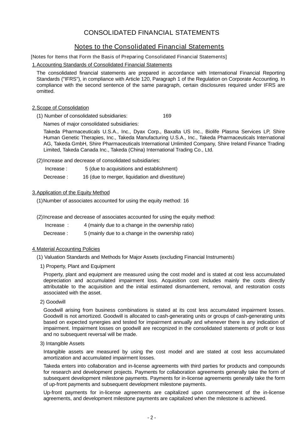 - 2 - CONSOLIDATED FINANCIAL STATEMENTS Notes to the Consolidated Financial Statements [Notes for Items that Form the Basis of Preparing Consolidated Financial Statements] 1. Accounting Standards of Consolidated Financial Statements The consolidated financial statements are prepared in accordance with International Financial Reporting Standards ("IFRS"), in compliance with Article 120, Paragraph 1 of the Regulation on Corporate Accounting. In compliance with the second sentence of the same paragraph, certain disclosures required under IFRS are omitted. 2. Scope of Consolidation (1) Number of consolidated subsidiaries: 169 Names of major consolidated subsidiaries: Takeda Pharmaceuticals U.S.A., Inc., Dyax Corp., Baxalta US Inc., Biolife Plasma Services LP, Shire Human Genetic Therapies, Inc., Takeda Manufacturing U.S.A., Inc., Takeda Pharmaceuticals International AG, Takeda GmbH, Shire Pharmaceuticals International Unlimited Company, Shire Ireland Finance Trading Limited, Takeda Canada Inc., Takeda (China) International Trading Co., Ltd. (2) Increase and decrease of consolidated subsidiaries: Increase : 5 (due to acquisitions and establishment) Decrease : 16 (due to merger, liquidation and divestiture) 3. Application of the Equity Method (1) Number of associates accounted for using the equity method: 16 (2) Increase and decrease of associates accounted for using the equity method: Increase : 4 (mainly due to a change in the ownership ratio) Decrease : 5 (mainly due to a change in the ownership ratio) 4. Material Accounting Policies (1) Valuation Standards and Methods for Major Assets (excluding Financial Instruments) 1) Property, Plant and Equipment Property, plant and equipment are measured using the cost model and is stated at cost less accumulated depreciation and accumulated impairment loss. Acquisition cost includes mainly the costs directly attributable to the acquisition and the initial estimated dismantlement, removal, and restoration costs associated with the asset. 2) Goodwill Goodwill arising from business combinations is stated at its cost less accumulated impairment losses. Goodwill is not amortized. Goodwill is allocated to cash-generating units or groups of cash-generating units based on expected synergies and tested for impairment annually and whenever there is any indication of impairment. Impairment losses on goodwill are recognized in the consolidated statements of profit or loss and no subsequent reversal will be made. 3) Intangible Assets Intangible assets are measured by using the cost model and are stated at cost less accumulated amortization and accumulated impairment losses. Takeda enters into collaboration and in-license agreements with third parties for products and compounds for research and development projects. Payments for collaboration agreements generally take the form of subsequent development milestone payments. Payments for in-license agreements generally take the form of up-front payments and subsequent development milestone payments. Up-front payments for in-license agreements are capitalized upon commencement of the in-license agreements, and development milestone payments are capitalized when the milestone is achieved.