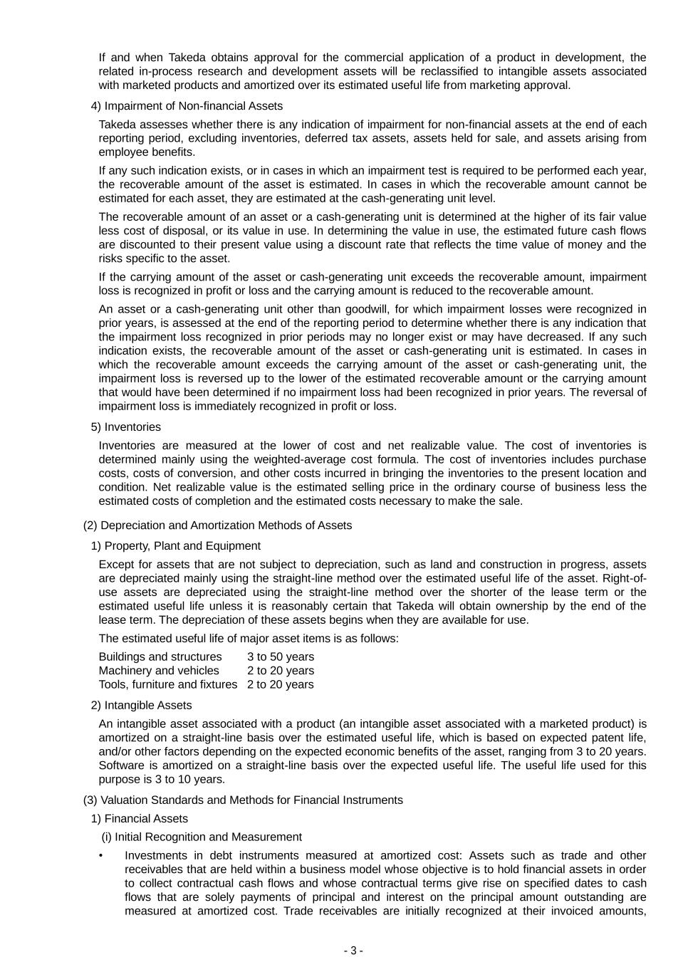 - 3 - If and when Takeda obtains approval for the commercial application of a product in development, the related in-process research and development assets will be reclassified to intangible assets associated with marketed products and amortized over its estimated useful life from marketing approval. 4) Impairment of Non-financial Assets Takeda assesses whether there is any indication of impairment for non-financial assets at the end of each reporting period, excluding inventories, deferred tax assets, assets held for sale, and assets arising from employee benefits. If any such indication exists, or in cases in which an impairment test is required to be performed each year, the recoverable amount of the asset is estimated. In cases in which the recoverable amount cannot be estimated for each asset, they are estimated at the cash-generating unit level. The recoverable amount of an asset or a cash-generating unit is determined at the higher of its fair value less cost of disposal, or its value in use. In determining the value in use, the estimated future cash flows are discounted to their present value using a discount rate that reflects the time value of money and the risks specific to the asset. If the carrying amount of the asset or cash-generating unit exceeds the recoverable amount, impairment loss is recognized in profit or loss and the carrying amount is reduced to the recoverable amount. An asset or a cash-generating unit other than goodwill, for which impairment losses were recognized in prior years, is assessed at the end of the reporting period to determine whether there is any indication that the impairment loss recognized in prior periods may no longer exist or may have decreased. If any such indication exists, the recoverable amount of the asset or cash-generating unit is estimated. In cases in which the recoverable amount exceeds the carrying amount of the asset or cash-generating unit, the impairment loss is reversed up to the lower of the estimated recoverable amount or the carrying amount that would have been determined if no impairment loss had been recognized in prior years. The reversal of impairment loss is immediately recognized in profit or loss. 5) Inventories Inventories are measured at the lower of cost and net realizable value. The cost of inventories is determined mainly using the weighted-average cost formula. The cost of inventories includes purchase costs, costs of conversion, and other costs incurred in bringing the inventories to the present location and condition. Net realizable value is the estimated selling price in the ordinary course of business less the estimated costs of completion and the estimated costs necessary to make the sale. (2) Depreciation and Amortization Methods of Assets 1) Property, Plant and Equipment Except for assets that are not subject to depreciation, such as land and construction in progress, assets are depreciated mainly using the straight-line method over the estimated useful life of the asset. Right-of- use assets are depreciated using the straight-line method over the shorter of the lease term or the estimated useful life unless it is reasonably certain that Takeda will obtain ownership by the end of the lease term. The depreciation of these assets begins when they are available for use. The estimated useful life of major asset items is as follows: Buildings and structures 3 to 50 years Machinery and vehicles 2 to 20 years Tools, furniture and fixtures 2 to 20 years 2) Intangible Assets An intangible asset associated with a product (an intangible asset associated with a marketed product) is amortized on a straight-line basis over the estimated useful life, which is based on expected patent life, and/or other factors depending on the expected economic benefits of the asset, ranging from 3 to 20 years. Software is amortized on a straight-line basis over the expected useful life. The useful life used for this purpose is 3 to 10 years. (3) Valuation Standards and Methods for Financial Instruments 1) Financial Assets (i) Initial Recognition and Measurement • Investments in debt instruments measured at amortized cost: Assets such as trade and other receivables that are held within a business model whose objective is to hold financial assets in order to collect contractual cash flows and whose contractual terms give rise on specified dates to cash flows that are solely payments of principal and interest on the principal amount outstanding are measured at amortized cost. Trade receivables are initially recognized at their invoiced amounts,