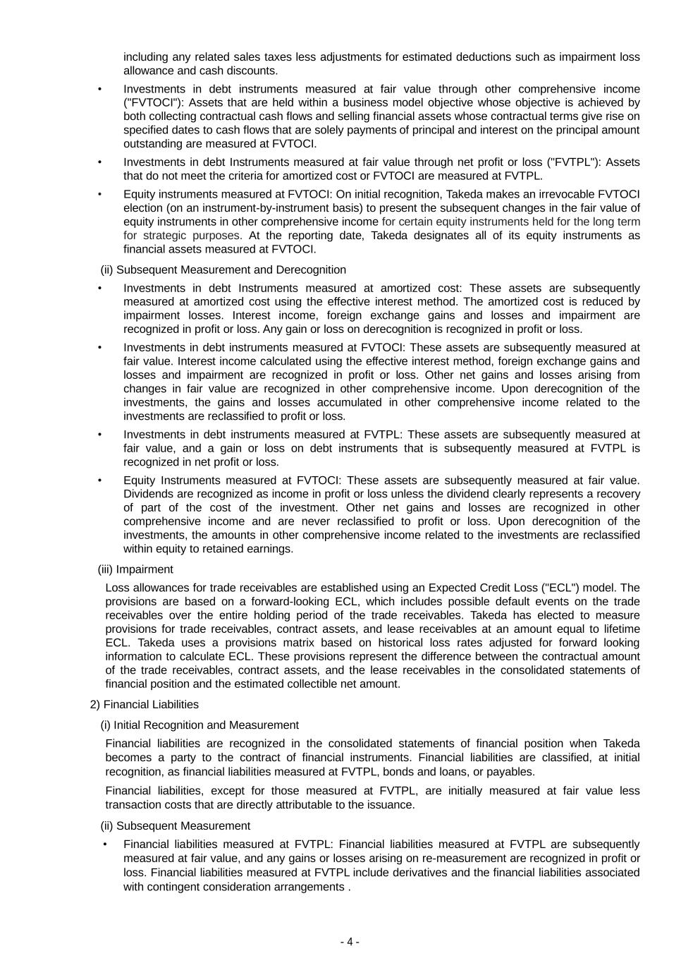 - 4 - including any related sales taxes less adjustments for estimated deductions such as impairment loss allowance and cash discounts. • Investments in debt instruments measured at fair value through other comprehensive income ("FVTOCI"): Assets that are held within a business model objective whose objective is achieved by both collecting contractual cash flows and selling financial assets whose contractual terms give rise on specified dates to cash flows that are solely payments of principal and interest on the principal amount outstanding are measured at FVTOCI. • Investments in debt Instruments measured at fair value through net profit or loss ("FVTPL"): Assets that do not meet the criteria for amortized cost or FVTOCI are measured at FVTPL. • Equity instruments measured at FVTOCI: On initial recognition, Takeda makes an irrevocable FVTOCI election (on an instrument-by-instrument basis) to present the subsequent changes in the fair value of equity instruments in other comprehensive income for certain equity instruments held for the long term for strategic purposes. At the reporting date, Takeda designates all of its equity instruments as financial assets measured at FVTOCI. (ii) Subsequent Measurement and Derecognition • Investments in debt Instruments measured at amortized cost: These assets are subsequently measured at amortized cost using the effective interest method. The amortized cost is reduced by impairment losses. Interest income, foreign exchange gains and losses and impairment are recognized in profit or loss. Any gain or loss on derecognition is recognized in profit or loss. • Investments in debt instruments measured at FVTOCI: These assets are subsequently measured at fair value. Interest income calculated using the effective interest method, foreign exchange gains and losses and impairment are recognized in profit or loss. Other net gains and losses arising from changes in fair value are recognized in other comprehensive income. Upon derecognition of the investments, the gains and losses accumulated in other comprehensive income related to the investments are reclassified to profit or loss. • Investments in debt instruments measured at FVTPL: These assets are subsequently measured at fair value, and a gain or loss on debt instruments that is subsequently measured at FVTPL is recognized in net profit or loss. • Equity Instruments measured at FVTOCI: These assets are subsequently measured at fair value. Dividends are recognized as income in profit or loss unless the dividend clearly represents a recovery of part of the cost of the investment. Other net gains and losses are recognized in other comprehensive income and are never reclassified to profit or loss. Upon derecognition of the investments, the amounts in other comprehensive income related to the investments are reclassified within equity to retained earnings. (iii) Impairment Loss allowances for trade receivables are established using an Expected Credit Loss ("ECL") model. The provisions are based on a forward-looking ECL, which includes possible default events on the trade receivables over the entire holding period of the trade receivables. Takeda has elected to measure provisions for trade receivables, contract assets, and lease receivables at an amount equal to lifetime ECL. Takeda uses a provisions matrix based on historical loss rates adjusted for forward looking information to calculate ECL. These provisions represent the difference between the contractual amount of the trade receivables, contract assets, and the lease receivables in the consolidated statements of financial position and the estimated collectible net amount. 2) Financial Liabilities (i) Initial Recognition and Measurement Financial liabilities are recognized in the consolidated statements of financial position when Takeda becomes a party to the contract of financial instruments. Financial liabilities are classified, at initial recognition, as financial liabilities measured at FVTPL, bonds and loans, or payables. Financial liabilities, except for those measured at FVTPL, are initially measured at fair value less transaction costs that are directly attributable to the issuance. (ii) Subsequent Measurement • Financial liabilities measured at FVTPL: Financial liabilities measured at FVTPL are subsequently measured at fair value, and any gains or losses arising on re-measurement are recognized in profit or loss. Financial liabilities measured at FVTPL include derivatives and the financial liabilities associated with contingent consideration arrangements .