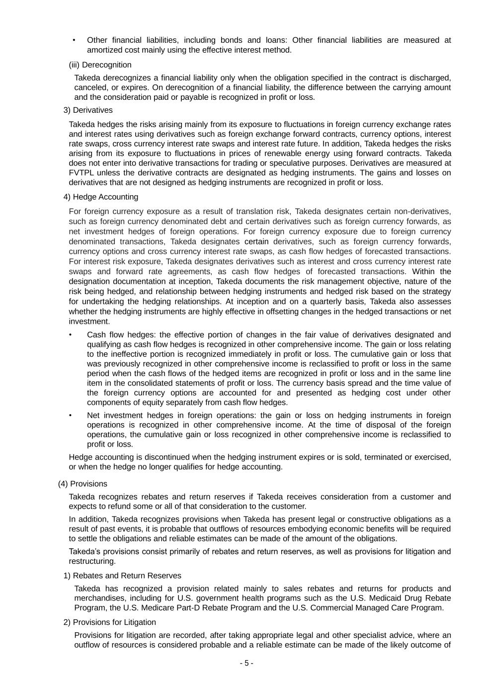 - 5 - • Other financial liabilities, including bonds and loans: Other financial liabilities are measured at amortized cost mainly using the effective interest method. (iii) Derecognition Takeda derecognizes a financial liability only when the obligation specified in the contract is discharged, canceled, or expires. On derecognition of a financial liability, the difference between the carrying amount and the consideration paid or payable is recognized in profit or loss. 3) Derivatives Takeda hedges the risks arising mainly from its exposure to fluctuations in foreign currency exchange rates and interest rates using derivatives such as foreign exchange forward contracts, currency options, interest rate swaps, cross currency interest rate swaps and interest rate future. In addition, Takeda hedges the risks arising from its exposure to fluctuations in prices of renewable energy using forward contracts. Takeda does not enter into derivative transactions for trading or speculative purposes. Derivatives are measured at FVTPL unless the derivative contracts are designated as hedging instruments. The gains and losses on derivatives that are not designed as hedging instruments are recognized in profit or loss. 4) Hedge Accounting For foreign currency exposure as a result of translation risk, Takeda designates certain non-derivatives, such as foreign currency denominated debt and certain derivatives such as foreign currency forwards, as net investment hedges of foreign operations. For foreign currency exposure due to foreign currency denominated transactions, Takeda designates certain derivatives, such as foreign currency forwards, currency options and cross currency interest rate swaps, as cash flow hedges of forecasted transactions. For interest risk exposure, Takeda designates derivatives such as interest and cross currency interest rate swaps and forward rate agreements, as cash flow hedges of forecasted transactions. Within the designation documentation at inception, Takeda documents the risk management objective, nature of the risk being hedged, and relationship between hedging instruments and hedged risk based on the strategy for undertaking the hedging relationships. At inception and on a quarterly basis, Takeda also assesses whether the hedging instruments are highly effective in offsetting changes in the hedged transactions or net investment. • Cash flow hedges: the effective portion of changes in the fair value of derivatives designated and qualifying as cash flow hedges is recognized in other comprehensive income. The gain or loss relating to the ineffective portion is recognized immediately in profit or loss. The cumulative gain or loss that was previously recognized in other comprehensive income is reclassified to profit or loss in the same period when the cash flows of the hedged items are recognized in profit or loss and in the same line item in the consolidated statements of profit or loss. The currency basis spread and the time value of the foreign currency options are accounted for and presented as hedging cost under other components of equity separately from cash flow hedges. • Net investment hedges in foreign operations: the gain or loss on hedging instruments in foreign operations is recognized in other comprehensive income. At the time of disposal of the foreign operations, the cumulative gain or loss recognized in other comprehensive income is reclassified to profit or loss. Hedge accounting is discontinued when the hedging instrument expires or is sold, terminated or exercised, or when the hedge no longer qualifies for hedge accounting. (4) Provisions Takeda recognizes rebates and return reserves if Takeda receives consideration from a customer and expects to refund some or all of that consideration to the customer. In addition, Takeda recognizes provisions when Takeda has present legal or constructive obligations as a result of past events, it is probable that outflows of resources embodying economic benefits will be required to settle the obligations and reliable estimates can be made of the amount of the obligations. Takeda’s provisions consist primarily of rebates and return reserves, as well as provisions for litigation and restructuring. 1) Rebates and Return Reserves Takeda has recognized a provision related mainly to sales rebates and returns for products and merchandises, including for U.S. government health programs such as the U.S. Medicaid Drug Rebate Program, the U.S. Medicare Part-D Rebate Program and the U.S. Commercial Managed Care Program. 2) Provisions for Litigation Provisions for litigation are recorded, after taking appropriate legal and other specialist advice, where an outflow of resources is considered probable and a reliable estimate can be made of the likely outcome of