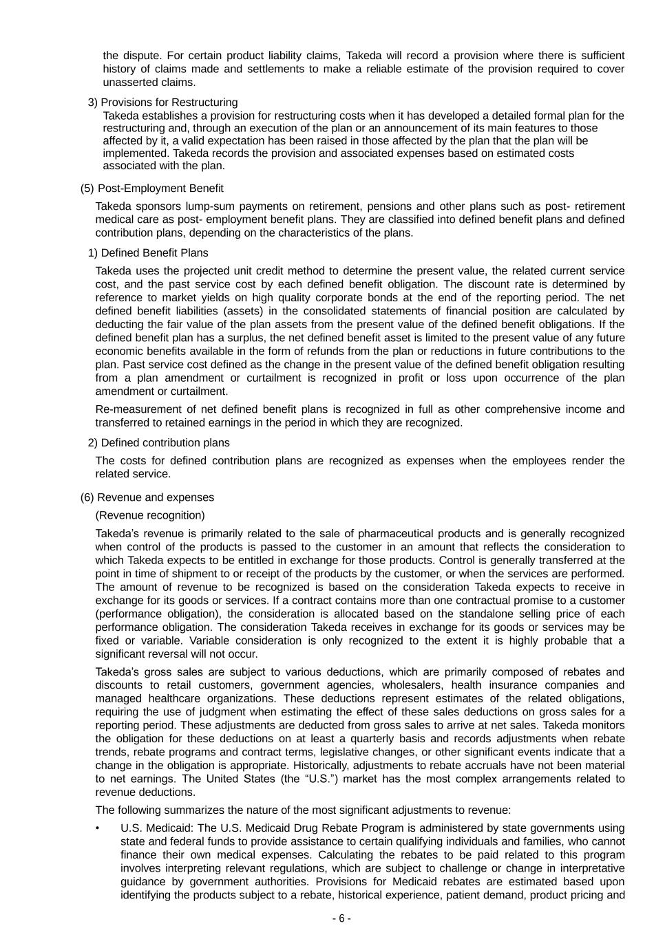 - 6 - the dispute. For certain product liability claims, Takeda will record a provision where there is sufficient history of claims made and settlements to make a reliable estimate of the provision required to cover unasserted claims. 3) Provisions for Restructuring Takeda establishes a provision for restructuring costs when it has developed a detailed formal plan for the restructuring and, through an execution of the plan or an announcement of its main features to those affected by it, a valid expectation has been raised in those affected by the plan that the plan will be implemented. Takeda records the provision and associated expenses based on estimated costs associated with the plan. (5) Post-Employment Benefit Takeda sponsors lump-sum payments on retirement, pensions and other plans such as post- retirement medical care as post- employment benefit plans. They are classified into defined benefit plans and defined contribution plans, depending on the characteristics of the plans. 1) Defined Benefit Plans Takeda uses the projected unit credit method to determine the present value, the related current service cost, and the past service cost by each defined benefit obligation. The discount rate is determined by reference to market yields on high quality corporate bonds at the end of the reporting period. The net defined benefit liabilities (assets) in the consolidated statements of financial position are calculated by deducting the fair value of the plan assets from the present value of the defined benefit obligations. If the defined benefit plan has a surplus, the net defined benefit asset is limited to the present value of any future economic benefits available in the form of refunds from the plan or reductions in future contributions to the plan. Past service cost defined as the change in the present value of the defined benefit obligation resulting from a plan amendment or curtailment is recognized in profit or loss upon occurrence of the plan amendment or curtailment. Re-measurement of net defined benefit plans is recognized in full as other comprehensive income and transferred to retained earnings in the period in which they are recognized. 2) Defined contribution plans The costs for defined contribution plans are recognized as expenses when the employees render the related service. (6) Revenue and expenses (Revenue recognition) Takeda’s revenue is primarily related to the sale of pharmaceutical products and is generally recognized when control of the products is passed to the customer in an amount that reflects the consideration to which Takeda expects to be entitled in exchange for those products. Control is generally transferred at the point in time of shipment to or receipt of the products by the customer, or when the services are performed. The amount of revenue to be recognized is based on the consideration Takeda expects to receive in exchange for its goods or services. If a contract contains more than one contractual promise to a customer (performance obligation), the consideration is allocated based on the standalone selling price of each performance obligation. The consideration Takeda receives in exchange for its goods or services may be fixed or variable. Variable consideration is only recognized to the extent it is highly probable that a significant reversal will not occur. Takeda’s gross sales are subject to various deductions, which are primarily composed of rebates and discounts to retail customers, government agencies, wholesalers, health insurance companies and managed healthcare organizations. These deductions represent estimates of the related obligations, requiring the use of judgment when estimating the effect of these sales deductions on gross sales for a reporting period. These adjustments are deducted from gross sales to arrive at net sales. Takeda monitors the obligation for these deductions on at least a quarterly basis and records adjustments when rebate trends, rebate programs and contract terms, legislative changes, or other significant events indicate that a change in the obligation is appropriate. Historically, adjustments to rebate accruals have not been material to net earnings. The United States (the “U.S.”) market has the most complex arrangements related to revenue deductions. The following summarizes the nature of the most significant adjustments to revenue: • U.S. Medicaid: The U.S. Medicaid Drug Rebate Program is administered by state governments using state and federal funds to provide assistance to certain qualifying individuals and families, who cannot finance their own medical expenses. Calculating the rebates to be paid related to this program involves interpreting relevant regulations, which are subject to challenge or change in interpretative guidance by government authorities. Provisions for Medicaid rebates are estimated based upon identifying the products subject to a rebate, historical experience, patient demand, product pricing and