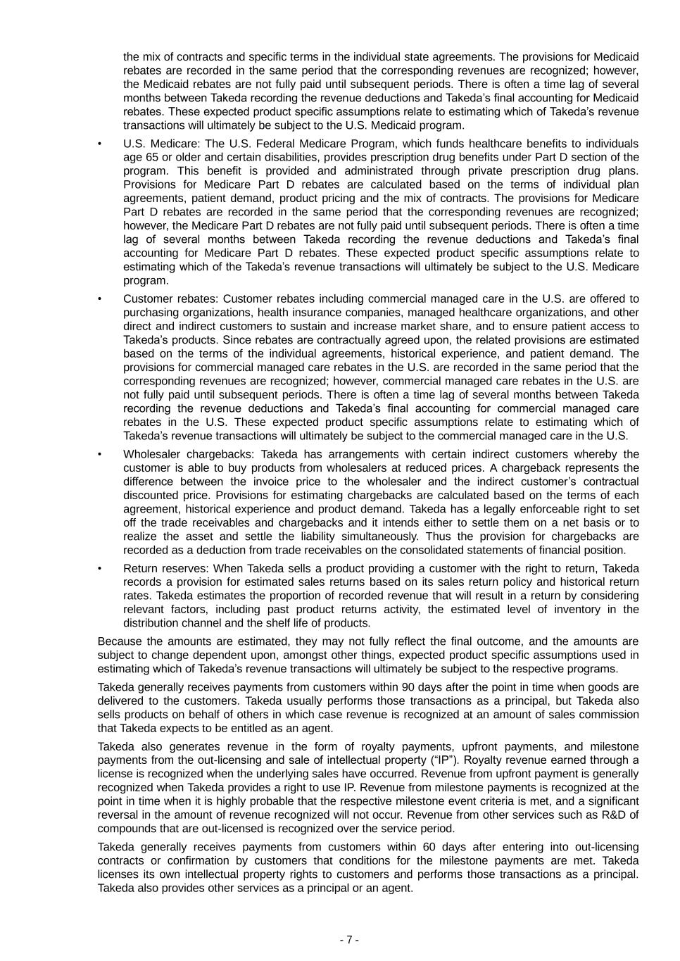 - 7 - the mix of contracts and specific terms in the individual state agreements. The provisions for Medicaid rebates are recorded in the same period that the corresponding revenues are recognized; however, the Medicaid rebates are not fully paid until subsequent periods. There is often a time lag of several months between Takeda recording the revenue deductions and Takeda’s final accounting for Medicaid rebates. These expected product specific assumptions relate to estimating which of Takeda’s revenue transactions will ultimately be subject to the U.S. Medicaid program. • U.S. Medicare: The U.S. Federal Medicare Program, which funds healthcare benefits to individuals age 65 or older and certain disabilities, provides prescription drug benefits under Part D section of the program. This benefit is provided and administrated through private prescription drug plans. Provisions for Medicare Part D rebates are calculated based on the terms of individual plan agreements, patient demand, product pricing and the mix of contracts. The provisions for Medicare Part D rebates are recorded in the same period that the corresponding revenues are recognized; however, the Medicare Part D rebates are not fully paid until subsequent periods. There is often a time lag of several months between Takeda recording the revenue deductions and Takeda’s final accounting for Medicare Part D rebates. These expected product specific assumptions relate to estimating which of the Takeda’s revenue transactions will ultimately be subject to the U.S. Medicare program. • Customer rebates: Customer rebates including commercial managed care in the U.S. are offered to purchasing organizations, health insurance companies, managed healthcare organizations, and other direct and indirect customers to sustain and increase market share, and to ensure patient access to Takeda’s products. Since rebates are contractually agreed upon, the related provisions are estimated based on the terms of the individual agreements, historical experience, and patient demand. The provisions for commercial managed care rebates in the U.S. are recorded in the same period that the corresponding revenues are recognized; however, commercial managed care rebates in the U.S. are not fully paid until subsequent periods. There is often a time lag of several months between Takeda recording the revenue deductions and Takeda’s final accounting for commercial managed care rebates in the U.S. These expected product specific assumptions relate to estimating which of Takeda’s revenue transactions will ultimately be subject to the commercial managed care in the U.S. • Wholesaler chargebacks: Takeda has arrangements with certain indirect customers whereby the customer is able to buy products from wholesalers at reduced prices. A chargeback represents the difference between the invoice price to the wholesaler and the indirect customer’s contractual discounted price. Provisions for estimating chargebacks are calculated based on the terms of each agreement, historical experience and product demand. Takeda has a legally enforceable right to set off the trade receivables and chargebacks and it intends either to settle them on a net basis or to realize the asset and settle the liability simultaneously. Thus the provision for chargebacks are recorded as a deduction from trade receivables on the consolidated statements of financial position. • Return reserves: When Takeda sells a product providing a customer with the right to return, Takeda records a provision for estimated sales returns based on its sales return policy and historical return rates. Takeda estimates the proportion of recorded revenue that will result in a return by considering relevant factors, including past product returns activity, the estimated level of inventory in the distribution channel and the shelf life of products. Because the amounts are estimated, they may not fully reflect the final outcome, and the amounts are subject to change dependent upon, amongst other things, expected product specific assumptions used in estimating which of Takeda’s revenue transactions will ultimately be subject to the respective programs. Takeda generally receives payments from customers within 90 days after the point in time when goods are delivered to the customers. Takeda usually performs those transactions as a principal, but Takeda also sells products on behalf of others in which case revenue is recognized at an amount of sales commission that Takeda expects to be entitled as an agent. Takeda also generates revenue in the form of royalty payments, upfront payments, and milestone payments from the out-licensing and sale of intellectual property (“IP”). Royalty revenue earned through a license is recognized when the underlying sales have occurred. Revenue from upfront payment is generally recognized when Takeda provides a right to use IP. Revenue from milestone payments is recognized at the point in time when it is highly probable that the respective milestone event criteria is met, and a significant reversal in the amount of revenue recognized will not occur. Revenue from other services such as R&D of compounds that are out-licensed is recognized over the service period. Takeda generally receives payments from customers within 60 days after entering into out-licensing contracts or confirmation by customers that conditions for the milestone payments are met. Takeda licenses its own intellectual property rights to customers and performs those transactions as a principal. Takeda also provides other services as a principal or an agent.
