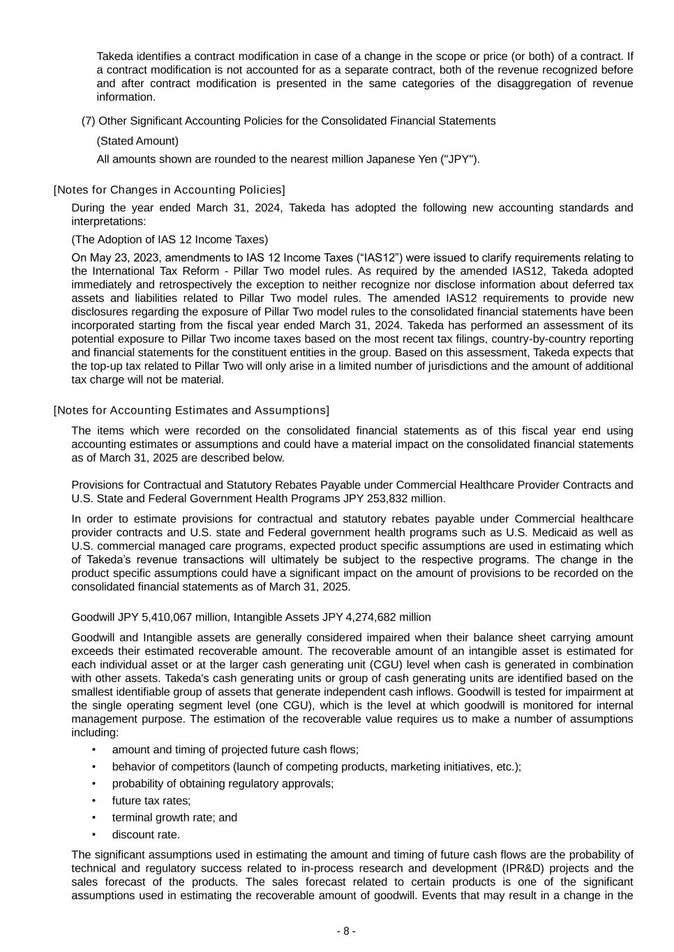 - 8 - Takeda identifies a contract modification in case of a change in the scope or price (or both) of a contract. If a contract modification is not accounted for as a separate contract, both of the revenue recognized before and after contract modification is presented in the same categories of the disaggregation of revenue information. (7) Other Significant Accounting Policies for the Consolidated Financial Statements (Stated Amount) All amounts shown are rounded to the nearest million Japanese Yen ("JPY"). [Notes for Changes in Accounting Policies] During the year ended March 31, 2024, Takeda has adopted the following new accounting standards and interpretations: (The Adoption of IAS 12 Income Taxes) On May 23, 2023, amendments to IAS 12 Income Taxes (“IAS12”) were issued to clarify requirements relating to the International Tax Reform - Pillar Two model rules. As required by the amended IAS12, Takeda adopted immediately and retrospectively the exception to neither recognize nor disclose information about deferred tax assets and liabilities related to Pillar Two model rules. The amended IAS12 requirements to provide new disclosures regarding the exposure of Pillar Two model rules to the consolidated financial statements have been incorporated starting from the fiscal year ended March 31, 2024. Takeda has performed an assessment of its potential exposure to Pillar Two income taxes based on the most recent tax filings, country-by-country reporting and financial statements for the constituent entities in the group. Based on this assessment, Takeda expects that the top-up tax related to Pillar Two will only arise in a limited number of jurisdictions and the amount of additional tax charge will not be material. [Notes for Accounting Estimates and Assumptions] The items which were recorded on the consolidated financial statements as of this fiscal year end using accounting estimates or assumptions and could have a material impact on the consolidated financial statements as of March 31, 2025 are described below. Provisions for Contractual and Statutory Rebates Payable under Commercial Healthcare Provider Contracts and U.S. State and Federal Government Health Programs JPY 253,832 million. In order to estimate provisions for contractual and statutory rebates payable under Commercial healthcare provider contracts and U.S. state and Federal government health programs such as U.S. Medicaid as well as U.S. commercial managed care programs, expected product specific assumptions are used in estimating which of Takeda’s revenue transactions will ultimately be subject to the respective programs. The change in the product specific assumptions could have a significant impact on the amount of provisions to be recorded on the consolidated financial statements as of March 31, 2025. Goodwill JPY 5,410,067 million, Intangible Assets JPY 4,274,682 million Goodwill and Intangible assets are generally considered impaired when their balance sheet carrying amount exceeds their estimated recoverable amount. The recoverable amount of an intangible asset is estimated for each individual asset or at the larger cash generating unit (CGU) level when cash is generated in combination with other assets. Takeda's cash generating units or group of cash generating units are identified based on the smallest identifiable group of assets that generate independent cash inflows. Goodwill is tested for impairment at the single operating segment level (one CGU), which is the level at which goodwill is monitored for internal management purpose. The estimation of the recoverable value requires us to make a number of assumptions including: • amount and timing of projected future cash flows; • behavior of competitors (launch of competing products, marketing initiatives, etc.); • probability of obtaining regulatory approvals; • future tax rates; • terminal growth rate; and • discount rate. The significant assumptions used in estimating the amount and timing of future cash flows are the probability of technical and regulatory success related to in-process research and development (IPR&D) projects and the sales forecast of the products. The sales forecast related to certain products is one of the significant assumptions used in estimating the recoverable amount of goodwill. Events that may result in a change in the