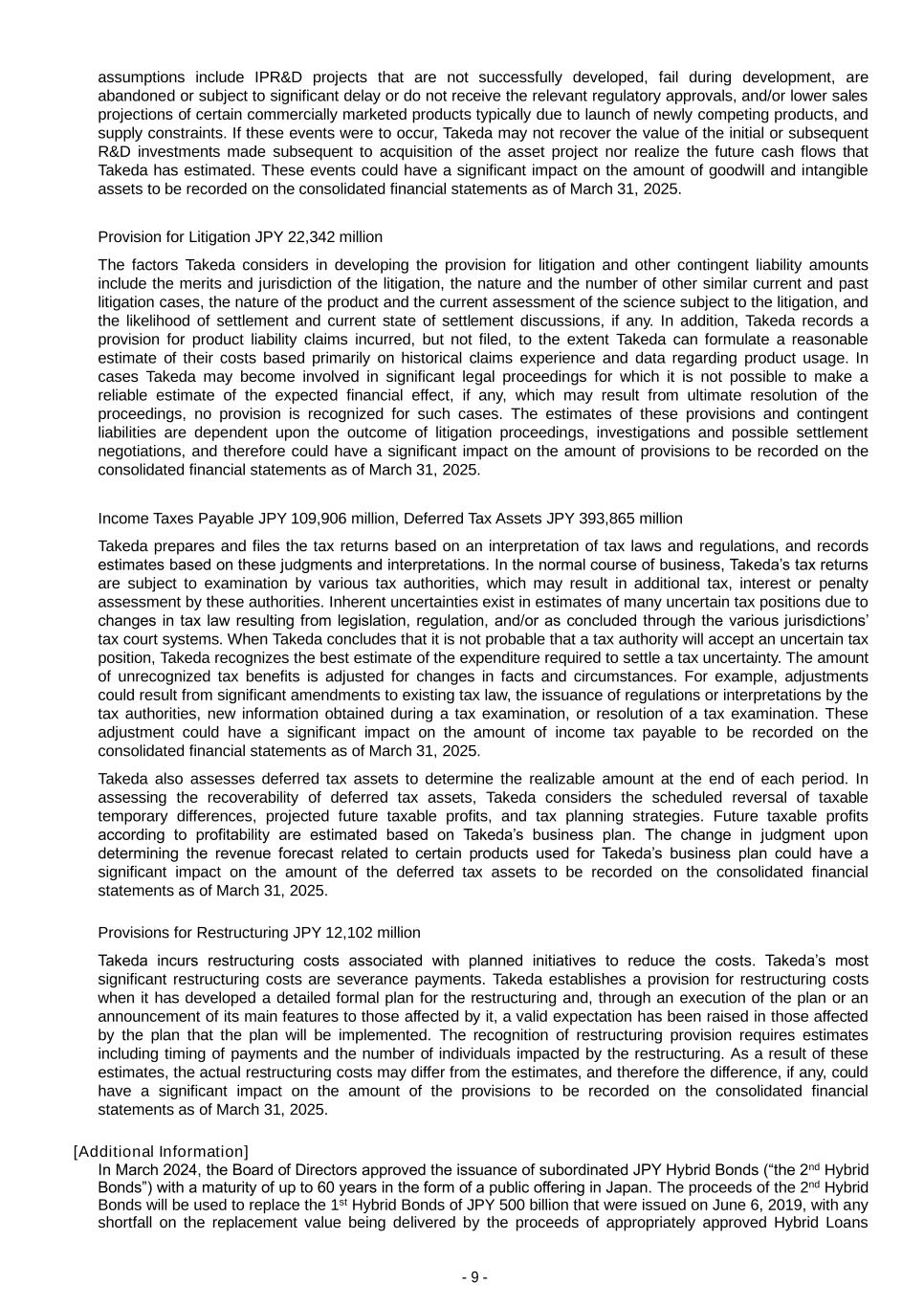 - 9 - assumptions include IPR&D projects that are not successfully developed, fail during development, are abandoned or subject to significant delay or do not receive the relevant regulatory approvals, and/or lower sales projections of certain commercially marketed products typically due to launch of newly competing products, and supply constraints. If these events were to occur, Takeda may not recover the value of the initial or subsequent R&D investments made subsequent to acquisition of the asset project nor realize the future cash flows that Takeda has estimated. These events could have a significant impact on the amount of goodwill and intangible assets to be recorded on the consolidated financial statements as of March 31, 2025. Provision for Litigation JPY 22,342 million The factors Takeda considers in developing the provision for litigation and other contingent liability amounts include the merits and jurisdiction of the litigation, the nature and the number of other similar current and past litigation cases, the nature of the product and the current assessment of the science subject to the litigation, and the likelihood of settlement and current state of settlement discussions, if any. In addition, Takeda records a provision for product liability claims incurred, but not filed, to the extent Takeda can formulate a reasonable estimate of their costs based primarily on historical claims experience and data regarding product usage. In cases Takeda may become involved in significant legal proceedings for which it is not possible to make a reliable estimate of the expected financial effect, if any, which may result from ultimate resolution of the proceedings, no provision is recognized for such cases. The estimates of these provisions and contingent liabilities are dependent upon the outcome of litigation proceedings, investigations and possible settlement negotiations, and therefore could have a significant impact on the amount of provisions to be recorded on the consolidated financial statements as of March 31, 2025. Income Taxes Payable JPY 109,906 million, Deferred Tax Assets JPY 393,865 million Takeda prepares and files the tax returns based on an interpretation of tax laws and regulations, and records estimates based on these judgments and interpretations. In the normal course of business, Takeda’s tax returns are subject to examination by various tax authorities, which may result in additional tax, interest or penalty assessment by these authorities. Inherent uncertainties exist in estimates of many uncertain tax positions due to changes in tax law resulting from legislation, regulation, and/or as concluded through the various jurisdictions’ tax court systems. When Takeda concludes that it is not probable that a tax authority will accept an uncertain tax position, Takeda recognizes the best estimate of the expenditure required to settle a tax uncertainty. The amount of unrecognized tax benefits is adjusted for changes in facts and circumstances. For example, adjustments could result from significant amendments to existing tax law, the issuance of regulations or interpretations by the tax authorities, new information obtained during a tax examination, or resolution of a tax examination. These adjustment could have a significant impact on the amount of income tax payable to be recorded on the consolidated financial statements as of March 31, 2025. Takeda also assesses deferred tax assets to determine the realizable amount at the end of each period. In assessing the recoverability of deferred tax assets, Takeda considers the scheduled reversal of taxable temporary differences, projected future taxable profits, and tax planning strategies. Future taxable profits according to profitability are estimated based on Takeda’s business plan. The change in judgment upon determining the revenue forecast related to certain products used for Takeda’s business plan could have a significant impact on the amount of the deferred tax assets to be recorded on the consolidated financial statements as of March 31, 2025. Provisions for Restructuring JPY 12,102 million Takeda incurs restructuring costs associated with planned initiatives to reduce the costs. Takeda’s most significant restructuring costs are severance payments. Takeda establishes a provision for restructuring costs when it has developed a detailed formal plan for the restructuring and, through an execution of the plan or an announcement of its main features to those affected by it, a valid expectation has been raised in those affected by the plan that the plan will be implemented. The recognition of restructuring provision requires estimates including timing of payments and the number of individuals impacted by the restructuring. As a result of these estimates, the actual restructuring costs may differ from the estimates, and therefore the difference, if any, could have a significant impact on the amount of the provisions to be recorded on the consolidated financial statements as of March 31, 2025. [Additional Information] In March 2024, the Board of Directors approved the issuance of subordinated JPY Hybrid Bonds (“the 2nd Hybrid Bonds”) with a maturity of up to 60 years in the form of a public offering in Japan. The proceeds of the 2nd Hybrid Bonds will be used to replace the 1st Hybrid Bonds of JPY 500 billion that were issued on June 6, 2019, with any shortfall on the replacement value being delivered by the proceeds of appropriately approved Hybrid Loans