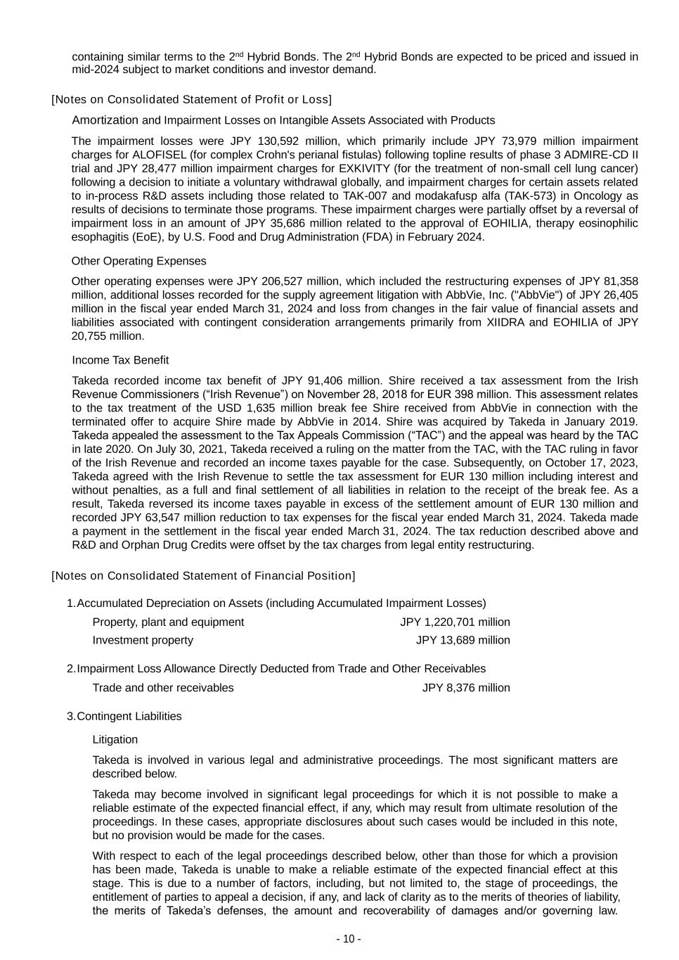 - 10 - containing similar terms to the 2nd Hybrid Bonds. The 2nd Hybrid Bonds are expected to be priced and issued in mid-2024 subject to market conditions and investor demand. [Notes on Consolidated Statement of Profit or Loss] Amortization and Impairment Losses on Intangible Assets Associated with Products The impairment losses were JPY 130,592 million, which primarily include JPY 73,979 million impairment charges for ALOFISEL (for complex Crohn's perianal fistulas) following topline results of phase 3 ADMIRE-CD II trial and JPY 28,477 million impairment charges for EXKIVITY (for the treatment of non-small cell lung cancer) following a decision to initiate a voluntary withdrawal globally, and impairment charges for certain assets related to in-process R&D assets including those related to TAK-007 and modakafusp alfa (TAK-573) in Oncology as results of decisions to terminate those programs. These impairment charges were partially offset by a reversal of impairment loss in an amount of JPY 35,686 million related to the approval of EOHILIA, therapy eosinophilic esophagitis (EoE), by U.S. Food and Drug Administration (FDA) in February 2024. Other Operating Expenses Other operating expenses were JPY 206,527 million, which included the restructuring expenses of JPY 81,358 million, additional losses recorded for the supply agreement litigation with AbbVie, Inc. ("AbbVie") of JPY 26,405 million in the fiscal year ended March 31, 2024 and loss from changes in the fair value of financial assets and liabilities associated with contingent consideration arrangements primarily from XIIDRA and EOHILIA of JPY 20,755 million. Income Tax Benefit Takeda recorded income tax benefit of JPY 91,406 million. Shire received a tax assessment from the Irish Revenue Commissioners (“Irish Revenue”) on November 28, 2018 for EUR 398 million. This assessment relates to the tax treatment of the USD 1,635 million break fee Shire received from AbbVie in connection with the terminated offer to acquire Shire made by AbbVie in 2014. Shire was acquired by Takeda in January 2019. Takeda appealed the assessment to the Tax Appeals Commission (“TAC”) and the appeal was heard by the TAC in late 2020. On July 30, 2021, Takeda received a ruling on the matter from the TAC, with the TAC ruling in favor of the Irish Revenue and recorded an income taxes payable for the case. Subsequently, on October 17, 2023, Takeda agreed with the Irish Revenue to settle the tax assessment for EUR 130 million including interest and without penalties, as a full and final settlement of all liabilities in relation to the receipt of the break fee. As a result, Takeda reversed its income taxes payable in excess of the settlement amount of EUR 130 million and recorded JPY 63,547 million reduction to tax expenses for the fiscal year ended March 31, 2024. Takeda made a payment in the settlement in the fiscal year ended March 31, 2024. The tax reduction described above and R&D and Orphan Drug Credits were offset by the tax charges from legal entity restructuring. [Notes on Consolidated Statement of Financial Position] 1. Accumulated Depreciation on Assets (including Accumulated Impairment Losses) Property, plant and equipment JPY 1,220,701 million Investment property JPY 13,689 million 2. Impairment Loss Allowance Directly Deducted from Trade and Other Receivables Trade and other receivables JPY 8,376 million 3. Contingent Liabilities Litigation Takeda is involved in various legal and administrative proceedings. The most significant matters are described below. Takeda may become involved in significant legal proceedings for which it is not possible to make a reliable estimate of the expected financial effect, if any, which may result from ultimate resolution of the proceedings. In these cases, appropriate disclosures about such cases would be included in this note, but no provision would be made for the cases. With respect to each of the legal proceedings described below, other than those for which a provision has been made, Takeda is unable to make a reliable estimate of the expected financial effect at this stage. This is due to a number of factors, including, but not limited to, the stage of proceedings, the entitlement of parties to appeal a decision, if any, and lack of clarity as to the merits of theories of liability, the merits of Takeda’s defenses, the amount and recoverability of damages and/or governing law.
