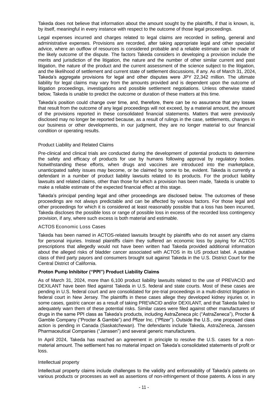 - 11 - Takeda does not believe that information about the amount sought by the plaintiffs, if that is known, is, by itself, meaningful in every instance with respect to the outcome of those legal proceedings. Legal expenses incurred and charges related to legal claims are recorded in selling, general and administrative expenses. Provisions are recorded, after taking appropriate legal and other specialist advice, where an outflow of resources is considered probable and a reliable estimate can be made of the likely outcome of the dispute. The factors Takeda considers in developing a provision include the merits and jurisdiction of the litigation, the nature and the number of other similar current and past litigation, the nature of the product and the current assessment of the science subject to the litigation, and the likelihood of settlement and current state of settlement discussions, if any. As of March 31, 2024, Takeda’s aggregate provisions for legal and other disputes were JPY 22,342 million. The ultimate liability for legal claims may vary from the amounts provided and is dependent upon the outcome of litigation proceedings, investigations and possible settlement negotiations. Unless otherwise stated below, Takeda is unable to predict the outcome or duration of these matters at this time. Takeda’s position could change over time, and, therefore, there can be no assurance that any losses that result from the outcome of any legal proceedings will not exceed, by a material amount, the amount of the provisions reported in these consolidated financial statements. Matters that were previously disclosed may no longer be reported because, as a result of rulings in the case, settlements, changes in our business or other developments, in our judgment, they are no longer material to our financial condition or operating results. Product Liability and Related Claims Pre-clinical and clinical trials are conducted during the development of potential products to determine the safety and efficacy of products for use by humans following approval by regulatory bodies. Notwithstanding these efforts, when drugs and vaccines are introduced into the marketplace, unanticipated safety issues may become, or be claimed by some to be, evident. Takeda is currently a defendant in a number of product liability lawsuits related to its products. For the product liability lawsuits and related claims, other than those for which a provision has been made, Takeda is unable to make a reliable estimate of the expected financial effect at this stage. Takeda’s principal pending legal and other proceedings are disclosed below. The outcomes of these proceedings are not always predictable and can be affected by various factors. For those legal and other proceedings for which it is considered at least reasonably possible that a loss has been incurred, Takeda discloses the possible loss or range of possible loss in excess of the recorded loss contingency provision, if any, where such excess is both material and estimable. ACTOS Economic Loss Cases Takeda has been named in ACTOS-related lawsuits brought by plaintiffs who do not assert any claims for personal injuries. Instead plaintiffs claim they suffered an economic loss by paying for ACTOS prescriptions that allegedly would not have been written had Takeda provided additional information about the alleged risks of bladder cancer associated with ACTOS in its US product label. A putative class of third party payors and consumers brought suit against Takeda in the U.S. District Court for the Central District of California. Proton Pump Inhibitor (“PPI”) Product Liability Claims As of March 31, 2024, more than 6,100 product liability lawsuits related to the use of PREVACID and DEXILANT have been filed against Takeda in U.S. federal and state courts. Most of these cases are pending in U.S. federal court and are consolidated for pre-trial proceedings in a multi-district litigation in federal court in New Jersey. The plaintiffs in these cases allege they developed kidney injuries or, in some cases, gastric cancer as a result of taking PREVACID and/or DEXILANT, and that Takeda failed to adequately warn them of these potential risks. Similar cases were filed against other manufacturers of drugs in the same PPI class as Takeda’s products, including AstraZeneca plc (“AstraZeneca”), Procter & Gamble Company (“Procter & Gamble”) and Pfizer Inc. (“Pfizer”). Outside the U.S., one proposed class action is pending in Canada (Saskatchewan). The defendants include Takeda, AstraZeneca, Janssen Pharmaceutical Companies (“Janssen”) and several generic manufacturers. In April 2024, Takeda has reached an agreement in principle to resolve the U.S. cases for a non- material amount. The settlement has no material impact on Takeda’s consolidated statements of profit or loss. Intellectual property Intellectual property claims include challenges to the validity and enforceability of Takeda’s patents on various products or processes as well as assertions of non-infringement of those patents. A loss in any