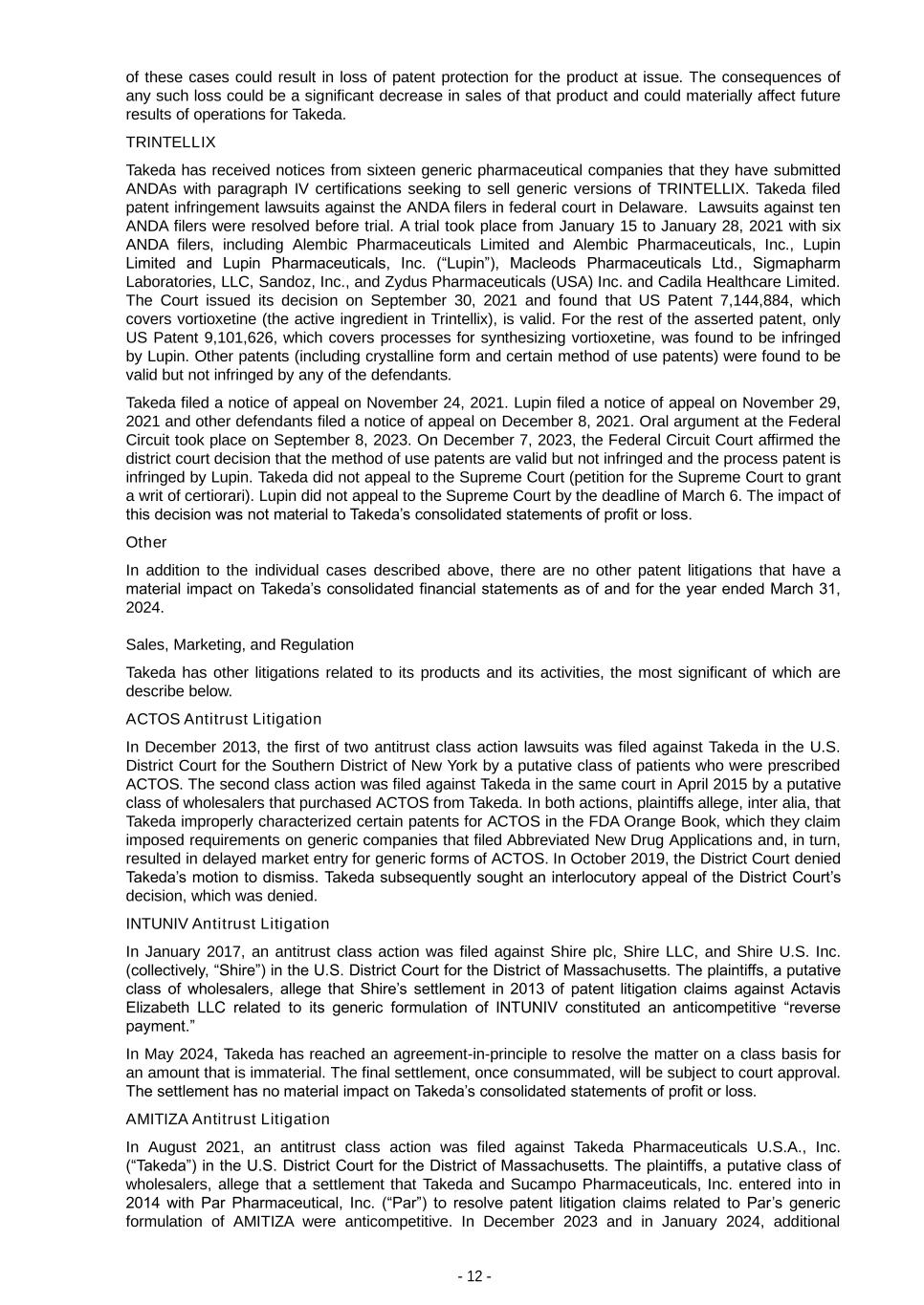 - 12 - of these cases could result in loss of patent protection for the product at issue. The consequences of any such loss could be a significant decrease in sales of that product and could materially affect future results of operations for Takeda. TRINTELLIX Takeda has received notices from sixteen generic pharmaceutical companies that they have submitted ANDAs with paragraph IV certifications seeking to sell generic versions of TRINTELLIX. Takeda filed patent infringement lawsuits against the ANDA filers in federal court in Delaware. Lawsuits against ten ANDA filers were resolved before trial. A trial took place from January 15 to January 28, 2021 with six ANDA filers, including Alembic Pharmaceuticals Limited and Alembic Pharmaceuticals, Inc., Lupin Limited and Lupin Pharmaceuticals, Inc. (“Lupin”), Macleods Pharmaceuticals Ltd., Sigmapharm Laboratories, LLC, Sandoz, Inc., and Zydus Pharmaceuticals (USA) Inc. and Cadila Healthcare Limited. The Court issued its decision on September 30, 2021 and found that US Patent 7,144,884, which covers vortioxetine (the active ingredient in Trintellix), is valid. For the rest of the asserted patent, only US Patent 9,101,626, which covers processes for synthesizing vortioxetine, was found to be infringed by Lupin. Other patents (including crystalline form and certain method of use patents) were found to be valid but not infringed by any of the defendants. Takeda filed a notice of appeal on November 24, 2021. Lupin filed a notice of appeal on November 29, 2021 and other defendants filed a notice of appeal on December 8, 2021. Oral argument at the Federal Circuit took place on September 8, 2023. On December 7, 2023, the Federal Circuit Court affirmed the district court decision that the method of use patents are valid but not infringed and the process patent is infringed by Lupin. Takeda did not appeal to the Supreme Court (petition for the Supreme Court to grant a writ of certiorari). Lupin did not appeal to the Supreme Court by the deadline of March 6. The impact of this decision was not material to Takeda’s consolidated statements of profit or loss. Other In addition to the individual cases described above, there are no other patent litigations that have a material impact on Takeda’s consolidated financial statements as of and for the year ended March 31, 2024. Sales, Marketing, and Regulation Takeda has other litigations related to its products and its activities, the most significant of which are describe below. ACTOS Antitrust Litigation In December 2013, the first of two antitrust class action lawsuits was filed against Takeda in the U.S. District Court for the Southern District of New York by a putative class of patients who were prescribed ACTOS. The second class action was filed against Takeda in the same court in April 2015 by a putative class of wholesalers that purchased ACTOS from Takeda. In both actions, plaintiffs allege, inter alia, that Takeda improperly characterized certain patents for ACTOS in the FDA Orange Book, which they claim imposed requirements on generic companies that filed Abbreviated New Drug Applications and, in turn, resulted in delayed market entry for generic forms of ACTOS. In October 2019, the District Court denied Takeda’s motion to dismiss. Takeda subsequently sought an interlocutory appeal of the District Court’s decision, which was denied. INTUNIV Antitrust Litigation In January 2017, an antitrust class action was filed against Shire plc, Shire LLC, and Shire U.S. Inc. (collectively, “Shire”) in the U.S. District Court for the District of Massachusetts. The plaintiffs, a putative class of wholesalers, allege that Shire’s settlement in 2013 of patent litigation claims against Actavis Elizabeth LLC related to its generic formulation of INTUNIV constituted an anticompetitive “reverse payment.” In May 2024, Takeda has reached an agreement-in-principle to resolve the matter on a class basis for an amount that is immaterial. The final settlement, once consummated, will be subject to court approval. The settlement has no material impact on Takeda’s consolidated statements of profit or loss. AMITIZA Antitrust Litigation In August 2021, an antitrust class action was filed against Takeda Pharmaceuticals U.S.A., Inc. (“Takeda”) in the U.S. District Court for the District of Massachusetts. The plaintiffs, a putative class of wholesalers, allege that a settlement that Takeda and Sucampo Pharmaceuticals, Inc. entered into in 2014 with Par Pharmaceutical, Inc. (“Par”) to resolve patent litigation claims related to Par’s generic formulation of AMITIZA were anticompetitive. In December 2023 and in January 2024, additional