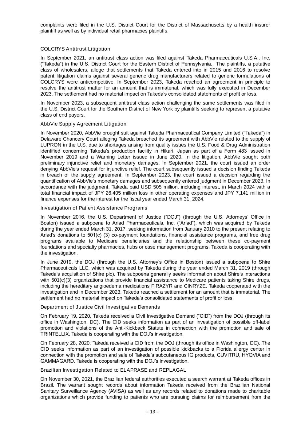 - 13 - complaints were filed in the U.S. District Court for the District of Massachusetts by a health insurer plaintiff as well as by individual retail pharmacies plaintiffs. COLCRYS Antitrust Litigation In September 2021, an antitrust class action was filed against Takeda Pharmaceuticals U.S.A., Inc. (“Takeda”) in the U.S. District Court for the Eastern District of Pennsylvania. The plaintiffs, a putative class of wholesalers, allege that settlements that Takeda entered into in 2015 and 2016 to resolve patent litigation claims against several generic drug manufacturers related to generic formulations of COLCRYS were anticompetitive. In September 2023, Takeda reached an agreement in principle to resolve the antitrust matter for an amount that is immaterial, which was fully executed in December 2023. The settlement had no material impact on Takeda’s consolidated statements of profit or loss. In November 2023, a subsequent antitrust class action challenging the same settlements was filed in the U.S. District Court for the Southern District of New York by plaintiffs seeking to represent a putative class of end payors. AbbVie Supply Agreement Litigation In November 2020, AbbVie brought suit against Takeda Pharmaceutical Company Limited (“Takeda”) in Delaware Chancery Court alleging Takeda breached its agreement with AbbVie related to the supply of LUPRON in the U.S. due to shortages arising from quality issues the U.S. Food & Drug Administration identified concerning Takeda’s production facility in Hikari, Japan as part of a Form 483 issued in November 2019 and a Warning Letter issued in June 2020. In the litigation, AbbVie sought both preliminary injunctive relief and monetary damages. In September 2021, the court issued an order denying AbbVie’s request for injunctive relief. The court subsequently issued a decision finding Takeda in breach of the supply agreement. In September 2023, the court issued a decision regarding the quantification of AbbVie’s monetary damages and subsequently entered judgment in December 2023. In accordance with the judgment, Takeda paid USD 505 million, including interest, in March 2024 with a total financial impact of JPY 26,405 million loss in other operating expenses and JPY 7,141 million in finance expenses for the interest for the fiscal year ended March 31, 2024. Investigation of Patient Assistance Programs In November 2016, the U.S. Department of Justice (“DOJ”) (through the U.S. Attorneys’ Office in Boston) issued a subpoena to Ariad Pharmaceuticals, Inc. (“Ariad”), which was acquired by Takeda during the year ended March 31, 2017, seeking information from January 2010 to the present relating to Ariad’s donations to 501(c) (3) co-payment foundations, financial assistance programs, and free drug programs available to Medicare beneficiaries and the relationship between these co-payment foundations and specialty pharmacies, hubs or case management programs. Takeda is cooperating with the investigation. In June 2019, the DOJ (through the U.S. Attorney’s Office in Boston) issued a subpoena to Shire Pharmaceuticals LLC, which was acquired by Takeda during the year ended March 31, 2019 (through Takeda’s acquisition of Shire plc). The subpoena generally seeks information about Shire’s interactions with 501(c)(3) organizations that provide financial assistance to Medicare patients taking Shire drugs, including the hereditary angioedema medications FIRAZYR and CINRYZE. Takeda cooperated with the investigation and in December 2023, Takeda reached a settlement for an amount that is immaterial. The settlement had no material impact on Takeda’s consolidated statements of profit or loss. Department of Justice Civil Investigative Demands On February 19, 2020, Takeda received a Civil Investigative Demand (“CID”) from the DOJ (through its office in Washington, DC). The CID seeks information as part of an investigation of possible off-label promotion and violations of the Anti-Kickback Statute in connection with the promotion and sale of TRINTELLIX. Takeda is cooperating with the DOJ’s investigation. On February 28, 2020, Takeda received a CID from the DOJ (through its office in Washington, DC). The CID seeks information as part of an investigation of possible kickbacks to a Florida allergy center in connection with the promotion and sale of Takeda’s subcutaneous IG products, CUVITRU, HYQVIA and GAMMAGARD. Takeda is cooperating with the DOJ’s investigation. Brazilian Investigation Related to ELAPRASE and REPLAGAL On November 30, 2021, the Brazilian federal authorities executed a search warrant at Takeda offices in Brazil. The warrant sought records about information Takeda received from the Brazilian National Sanitary Surveillance Agency (AVISA) as well as any records related to donations made to charitable organizations which provide funding to patients who are pursuing claims for reimbursement from the