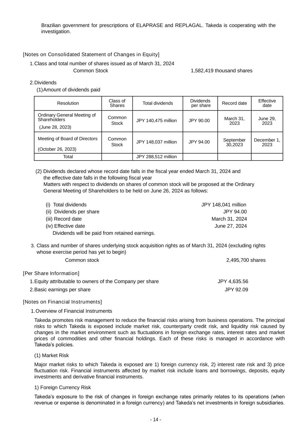 - 14 - Brazilian government for prescriptions of ELAPRASE and REPLAGAL. Takeda is cooperating with the investigation. [Notes on Consolidated Statement of Changes in Equity] 1. Class and total number of shares issued as of March 31, 2024 Common Stock 1,582,419 thousand shares 2. Dividends (1) Amount of dividends paid Resolution Class of Shares Total dividends Dividends per share Record date Effective date Ordinary General Meeting of Shareholders Common Stock JPY 140,475 million JPY 90.00 March 31, 2023 June 29, 2023 (June 28, 2023) Meeting of Board of Directors Common Stock JPY 148,037 million JPY 94.00 September 30,2023 December 1, 2023 (October 26, 2023) Total JPY 288,512 million (2) Dividends declared whose record date falls in the fiscal year ended March 31, 2024 and the effective date falls in the following fiscal year Matters with respect to dividends on shares of common stock will be proposed at the Ordinary General Meeting of Shareholders to be held on June 26, 2024 as follows: (i) Total dividends JPY 148,041 million (ii) Dividends per share JPY 94.00 (iii) Record date March 31, 2024 (iv) Effective date June 27, 2024 Dividends will be paid from retained earnings. 3. Class and number of shares underlying stock acquisition rights as of March 31, 2024 (excluding rights whose exercise period has yet to begin) Common stock 2,495,700 shares [Per Share Information] 1. Equity attributable to owners of the Company per share JPY 4,635.56 2. Basic earnings per share JPY 92.09 [Notes on Financial Instruments] 1. Overview of Financial Instruments Takeda promotes risk management to reduce the financial risks arising from business operations. The principal risks to which Takeda is exposed include market risk, counterparty credit risk, and liquidity risk caused by changes in the market environment such as fluctuations in foreign exchange rates, interest rates and market prices of commodities and other financial holdings. Each of these risks is managed in accordance with Takeda’s policies. (1) Market Risk Major market risks to which Takeda is exposed are 1) foreign currency risk, 2) interest rate risk and 3) price fluctuation risk. Financial instruments affected by market risk include loans and borrowings, deposits, equity investments and derivative financial instruments. 1) Foreign Currency Risk Takeda’s exposure to the risk of changes in foreign exchange rates primarily relates to its operations (when revenue or expense is denominated in a foreign currency) and Takeda’s net investments in foreign subsidiaries.