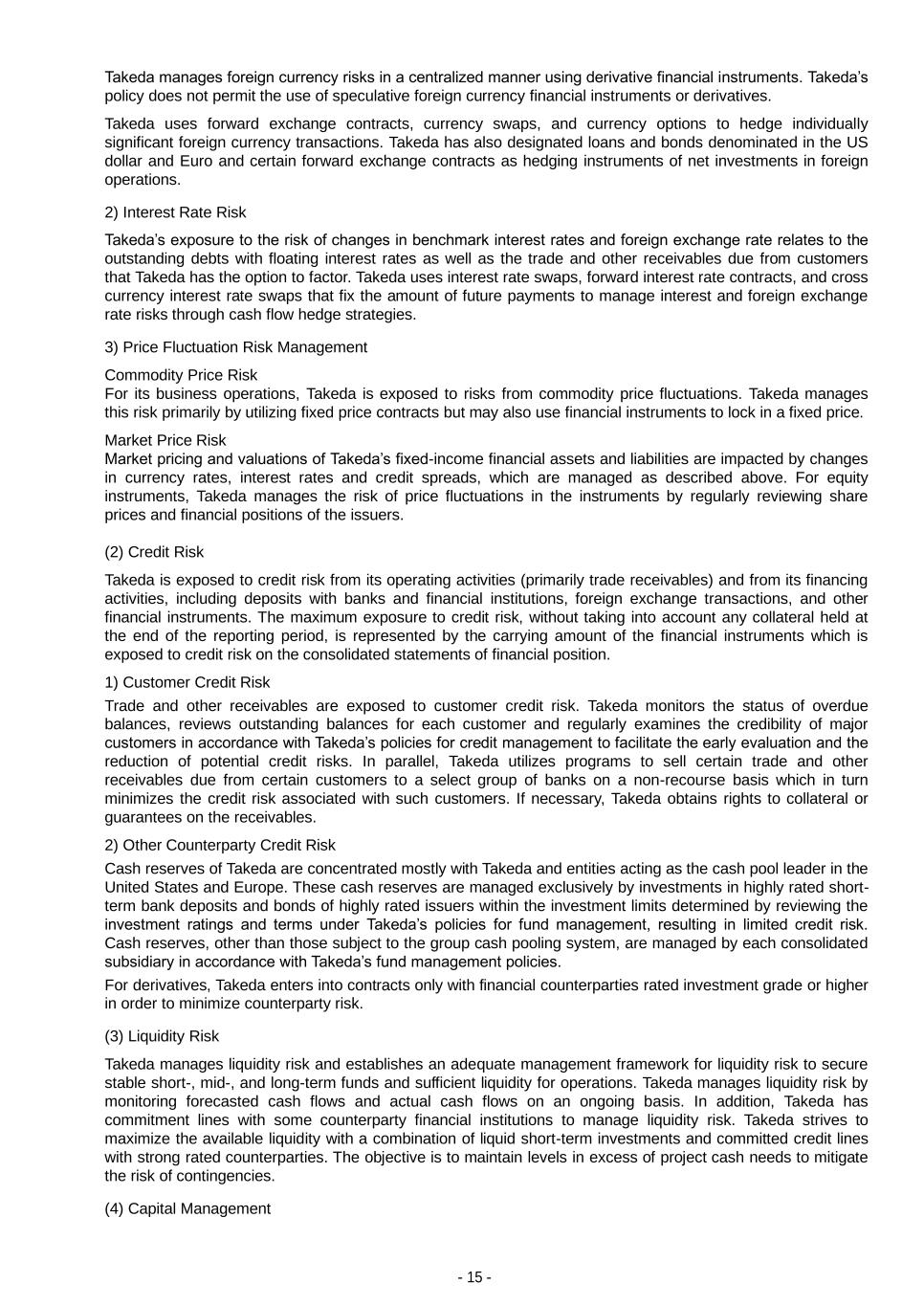 - 15 - Takeda manages foreign currency risks in a centralized manner using derivative financial instruments. Takeda’s policy does not permit the use of speculative foreign currency financial instruments or derivatives. Takeda uses forward exchange contracts, currency swaps, and currency options to hedge individually significant foreign currency transactions. Takeda has also designated loans and bonds denominated in the US dollar and Euro and certain forward exchange contracts as hedging instruments of net investments in foreign operations. 2) Interest Rate Risk Takeda’s exposure to the risk of changes in benchmark interest rates and foreign exchange rate relates to the outstanding debts with floating interest rates as well as the trade and other receivables due from customers that Takeda has the option to factor. Takeda uses interest rate swaps, forward interest rate contracts, and cross currency interest rate swaps that fix the amount of future payments to manage interest and foreign exchange rate risks through cash flow hedge strategies. 3) Price Fluctuation Risk Management Commodity Price Risk For its business operations, Takeda is exposed to risks from commodity price fluctuations. Takeda manages this risk primarily by utilizing fixed price contracts but may also use financial instruments to lock in a fixed price. Market Price Risk Market pricing and valuations of Takeda’s fixed-income financial assets and liabilities are impacted by changes in currency rates, interest rates and credit spreads, which are managed as described above. For equity instruments, Takeda manages the risk of price fluctuations in the instruments by regularly reviewing share prices and financial positions of the issuers. (2) Credit Risk Takeda is exposed to credit risk from its operating activities (primarily trade receivables) and from its financing activities, including deposits with banks and financial institutions, foreign exchange transactions, and other financial instruments. The maximum exposure to credit risk, without taking into account any collateral held at the end of the reporting period, is represented by the carrying amount of the financial instruments which is exposed to credit risk on the consolidated statements of financial position. 1) Customer Credit Risk Trade and other receivables are exposed to customer credit risk. Takeda monitors the status of overdue balances, reviews outstanding balances for each customer and regularly examines the credibility of major customers in accordance with Takeda’s policies for credit management to facilitate the early evaluation and the reduction of potential credit risks. In parallel, Takeda utilizes programs to sell certain trade and other receivables due from certain customers to a select group of banks on a non-recourse basis which in turn minimizes the credit risk associated with such customers. If necessary, Takeda obtains rights to collateral or guarantees on the receivables. 2) Other Counterparty Credit Risk Cash reserves of Takeda are concentrated mostly with Takeda and entities acting as the cash pool leader in the United States and Europe. These cash reserves are managed exclusively by investments in highly rated short- term bank deposits and bonds of highly rated issuers within the investment limits determined by reviewing the investment ratings and terms under Takeda’s policies for fund management, resulting in limited credit risk. Cash reserves, other than those subject to the group cash pooling system, are managed by each consolidated subsidiary in accordance with Takeda’s fund management policies. For derivatives, Takeda enters into contracts only with financial counterparties rated investment grade or higher in order to minimize counterparty risk. (3) Liquidity Risk Takeda manages liquidity risk and establishes an adequate management framework for liquidity risk to secure stable short-, mid-, and long-term funds and sufficient liquidity for operations. Takeda manages liquidity risk by monitoring forecasted cash flows and actual cash flows on an ongoing basis. In addition, Takeda has commitment lines with some counterparty financial institutions to manage liquidity risk. Takeda strives to maximize the available liquidity with a combination of liquid short-term investments and committed credit lines with strong rated counterparties. The objective is to maintain levels in excess of project cash needs to mitigate the risk of contingencies. (4) Capital Management
