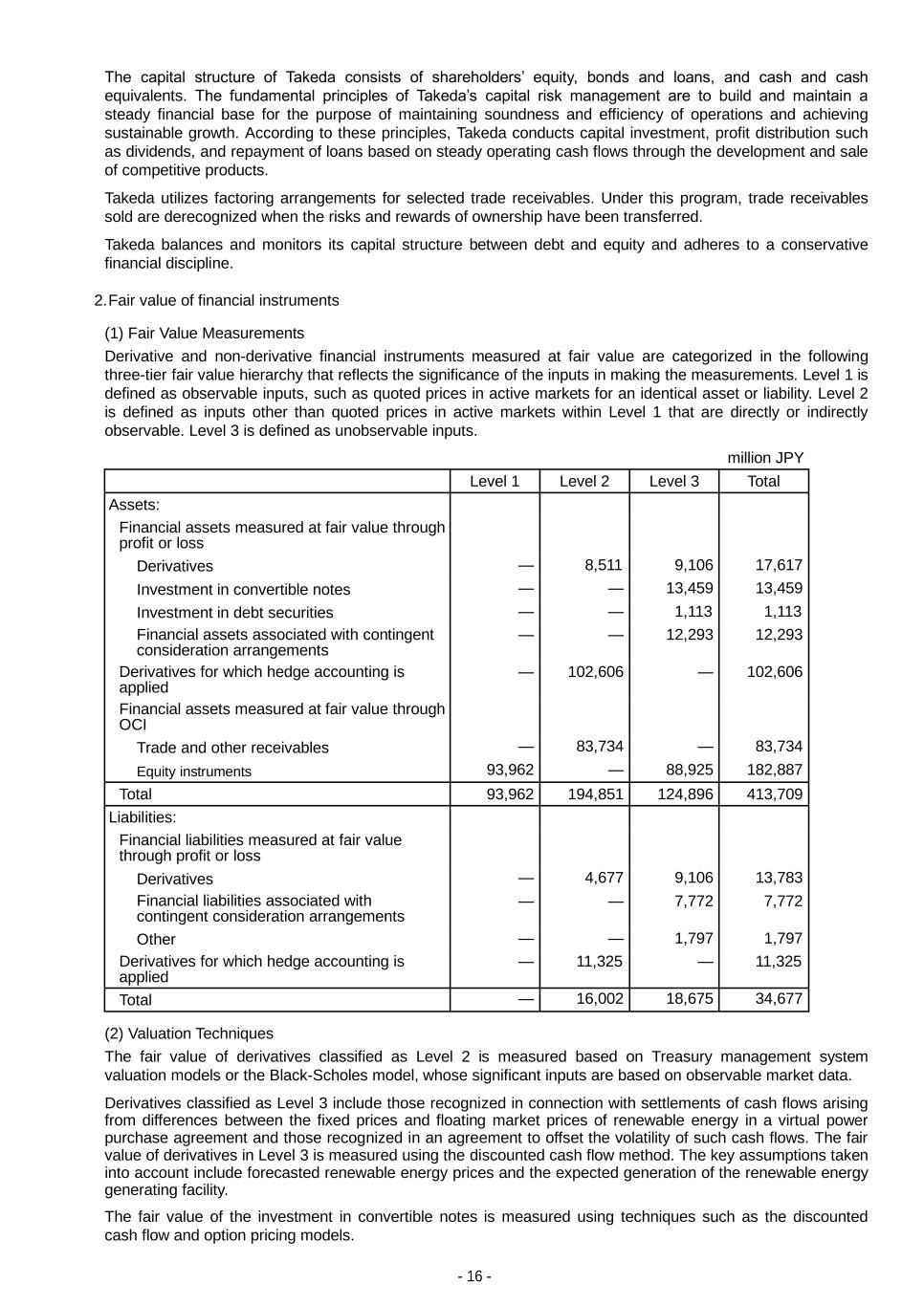 - 16 - The capital structure of Takeda consists of shareholders’ equity, bonds and loans, and cash and cash equivalents. The fundamental principles of Takeda’s capital risk management are to build and maintain a steady financial base for the purpose of maintaining soundness and efficiency of operations and achieving sustainable growth. According to these principles, Takeda conducts capital investment, profit distribution such as dividends, and repayment of loans based on steady operating cash flows through the development and sale of competitive products. Takeda utilizes factoring arrangements for selected trade receivables. Under this program, trade receivables sold are derecognized when the risks and rewards of ownership have been transferred. Takeda balances and monitors its capital structure between debt and equity and adheres to a conservative financial discipline. 2. Fair value of financial instruments (1) Fair Value Measurements Derivative and non-derivative financial instruments measured at fair value are categorized in the following three-tier fair value hierarchy that reflects the significance of the inputs in making the measurements. Level 1 is defined as observable inputs, such as quoted prices in active markets for an identical asset or liability. Level 2 is defined as inputs other than quoted prices in active markets within Level 1 that are directly or indirectly observable. Level 3 is defined as unobservable inputs. million JPY Level 1 Level 2 Level 3 Total Assets: Financial assets measured at fair value through profit or loss Derivatives — 8,511 9,106 17,617 Investment in convertible notes — — 13,459 13,459 Investment in debt securities — — 1,113 1,113 Financial assets associated with contingent consideration arrangements — — 12,293 12,293 Derivatives for which hedge accounting is applied — 102,606 — 102,606 Financial assets measured at fair value through OCI Trade and other receivables — 83,734 — 83,734 Equity instruments 93,962 — 88,925 182,887 Total 93,962 194,851 124,896 413,709 Liabilities: Financial liabilities measured at fair value through profit or loss Derivatives — 4,677 9,106 13,783 Financial liabilities associated with contingent consideration arrangements — — 7,772 7,772 Other — — 1,797 1,797 Derivatives for which hedge accounting is applied — 11,325 — 11,325 Total — 16,002 18,675 34,677 (2) Valuation Techniques The fair value of derivatives classified as Level 2 is measured based on Treasury management system valuation models or the Black-Scholes model, whose significant inputs are based on observable market data. Derivatives classified as Level 3 include those recognized in connection with settlements of cash flows arising from differences between the fixed prices and floating market prices of renewable energy in a virtual power purchase agreement and those recognized in an agreement to offset the volatility of such cash flows. The fair value of derivatives in Level 3 is measured using the discounted cash flow method. The key assumptions taken into account include forecasted renewable energy prices and the expected generation of the renewable energy generating facility. The fair value of the investment in convertible notes is measured using techniques such as the discounted cash flow and option pricing models.