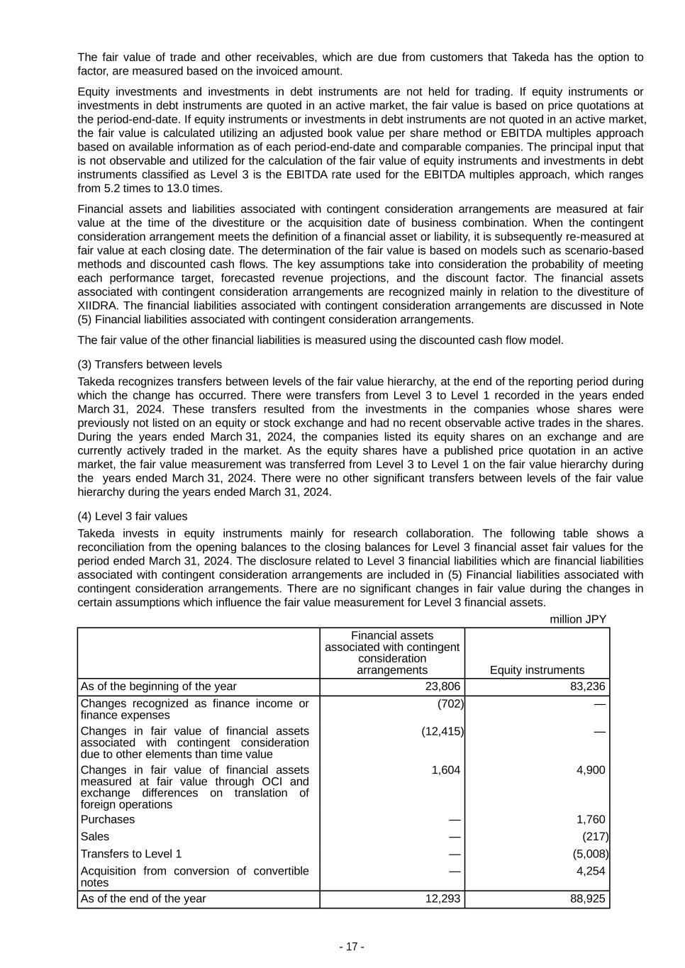 - 17 - The fair value of trade and other receivables, which are due from customers that Takeda has the option to factor, are measured based on the invoiced amount. Equity investments and investments in debt instruments are not held for trading. If equity instruments or investments in debt instruments are quoted in an active market, the fair value is based on price quotations at the period-end-date. If equity instruments or investments in debt instruments are not quoted in an active market, the fair value is calculated utilizing an adjusted book value per share method or EBITDA multiples approach based on available information as of each period-end-date and comparable companies. The principal input that is not observable and utilized for the calculation of the fair value of equity instruments and investments in debt instruments classified as Level 3 is the EBITDA rate used for the EBITDA multiples approach, which ranges from 5.2 times to 13.0 times. Financial assets and liabilities associated with contingent consideration arrangements are measured at fair value at the time of the divestiture or the acquisition date of business combination. When the contingent consideration arrangement meets the definition of a financial asset or liability, it is subsequently re-measured at fair value at each closing date. The determination of the fair value is based on models such as scenario-based methods and discounted cash flows. The key assumptions take into consideration the probability of meeting each performance target, forecasted revenue projections, and the discount factor. The financial assets associated with contingent consideration arrangements are recognized mainly in relation to the divestiture of XIIDRA. The financial liabilities associated with contingent consideration arrangements are discussed in Note (5) Financial liabilities associated with contingent consideration arrangements. The fair value of the other financial liabilities is measured using the discounted cash flow model. (3) Transfers between levels Takeda recognizes transfers between levels of the fair value hierarchy, at the end of the reporting period during which the change has occurred. There were transfers from Level 3 to Level 1 recorded in the years ended March 31, 2024. These transfers resulted from the investments in the companies whose shares were previously not listed on an equity or stock exchange and had no recent observable active trades in the shares. During the years ended March 31, 2024, the companies listed its equity shares on an exchange and are currently actively traded in the market. As the equity shares have a published price quotation in an active market, the fair value measurement was transferred from Level 3 to Level 1 on the fair value hierarchy during the years ended March 31, 2024. There were no other significant transfers between levels of the fair value hierarchy during the years ended March 31, 2024. (4) Level 3 fair values Takeda invests in equity instruments mainly for research collaboration. The following table shows a reconciliation from the opening balances to the closing balances for Level 3 financial asset fair values for the period ended March 31, 2024. The disclosure related to Level 3 financial liabilities which are financial liabilities associated with contingent consideration arrangements are included in (5) Financial liabilities associated with contingent consideration arrangements. There are no significant changes in fair value during the changes in certain assumptions which influence the fair value measurement for Level 3 financial assets. million JPY Financial assets associated with contingent consideration arrangements Equity instruments As of the beginning of the year 23,806 83,236 Changes recognized as finance income or finance expenses (702) — Changes in fair value of financial assets associated with contingent consideration due to other elements than time value (12,415) — Changes in fair value of financial assets measured at fair value through OCI and exchange differences on translation of foreign operations 1,604 4,900 Purchases — 1,760 Sales — (217) Transfers to Level 1 — (5,008) Acquisition from conversion of convertible notes — 4,254 As of the end of the year 12,293 88,925