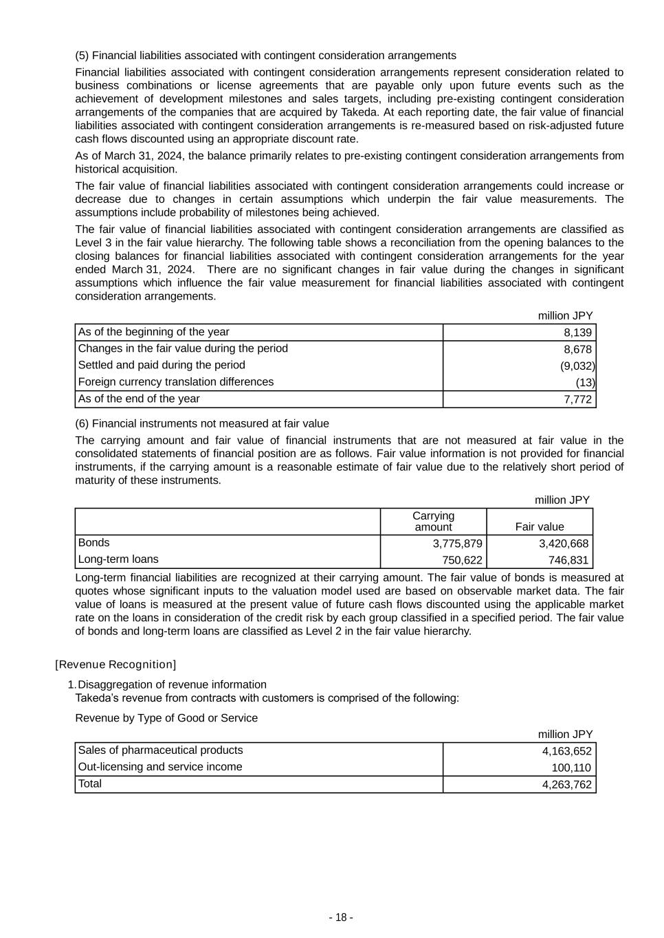 - 18 - (5) Financial liabilities associated with contingent consideration arrangements Financial liabilities associated with contingent consideration arrangements represent consideration related to business combinations or license agreements that are payable only upon future events such as the achievement of development milestones and sales targets, including pre-existing contingent consideration arrangements of the companies that are acquired by Takeda. At each reporting date, the fair value of financial liabilities associated with contingent consideration arrangements is re-measured based on risk-adjusted future cash flows discounted using an appropriate discount rate. As of March 31, 2024, the balance primarily relates to pre-existing contingent consideration arrangements from historical acquisition. The fair value of financial liabilities associated with contingent consideration arrangements could increase or decrease due to changes in certain assumptions which underpin the fair value measurements. The assumptions include probability of milestones being achieved. The fair value of financial liabilities associated with contingent consideration arrangements are classified as Level 3 in the fair value hierarchy. The following table shows a reconciliation from the opening balances to the closing balances for financial liabilities associated with contingent consideration arrangements for the year ended March 31, 2024. There are no significant changes in fair value during the changes in significant assumptions which influence the fair value measurement for financial liabilities associated with contingent consideration arrangements. million JPY As of the beginning of the year 8,139 Changes in the fair value during the period 8,678 Settled and paid during the period (9,032) Foreign currency translation differences (13) As of the end of the year 7,772 (6) Financial instruments not measured at fair value The carrying amount and fair value of financial instruments that are not measured at fair value in the consolidated statements of financial position are as follows. Fair value information is not provided for financial instruments, if the carrying amount is a reasonable estimate of fair value due to the relatively short period of maturity of these instruments. million JPY Carrying amount Fair value Bonds 3,775,879 3,420,668 Long-term loans 750,622 746,831 Long-term financial liabilities are recognized at their carrying amount. The fair value of bonds is measured at quotes whose significant inputs to the valuation model used are based on observable market data. The fair value of loans is measured at the present value of future cash flows discounted using the applicable market rate on the loans in consideration of the credit risk by each group classified in a specified period. The fair value of bonds and long-term loans are classified as Level 2 in the fair value hierarchy. [Revenue Recognition] 1. Disaggregation of revenue information Takeda’s revenue from contracts with customers is comprised of the following: Revenue by Type of Good or Service million JPY Sales of pharmaceutical products 4,163,652 Out-licensing and service income 100,110 Total 4,263,762