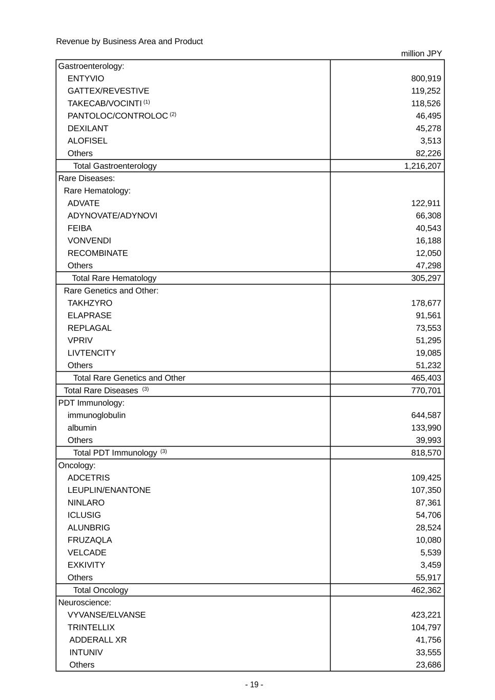 - 19 - Revenue by Business Area and Product million JPY Gastroenterology: ENTYVIO 800,919 GATTEX/REVESTIVE 119,252 TAKECAB/VOCINTI (1) 118,526 PANTOLOC/CONTROLOC (2) 46,495 DEXILANT 45,278 ALOFISEL 3,513 Others 82,226 Total Gastroenterology 1,216,207 Rare Diseases: Rare Hematology: ADVATE 122,911 ADYNOVATE/ADYNOVI 66,308 FEIBA 40,543 VONVENDI 16,188 RECOMBINATE 12,050 Others 47,298 Total Rare Hematology 305,297 Rare Genetics and Other: TAKHZYRO 178,677 ELAPRASE 91,561 REPLAGAL 73,553 VPRIV 51,295 LIVTENCITY 19,085 Others 51,232 Total Rare Genetics and Other 465,403 Total Rare Diseases (3) 770,701 PDT Immunology: immunoglobulin 644,587 albumin 133,990 Others 39,993 Total PDT Immunology (3) 818,570 Oncology: ADCETRIS 109,425 LEUPLIN/ENANTONE 107,350 NINLARO 87,361 ICLUSIG 54,706 ALUNBRIG 28,524 FRUZAQLA 10,080 VELCADE 5,539 EXKIVITY 3,459 Others 55,917 Total Oncology 462,362 Neuroscience: VYVANSE/ELVANSE 423,221 TRINTELLIX 104,797 ADDERALL XR 41,756 INTUNIV 33,555 Others 23,686
