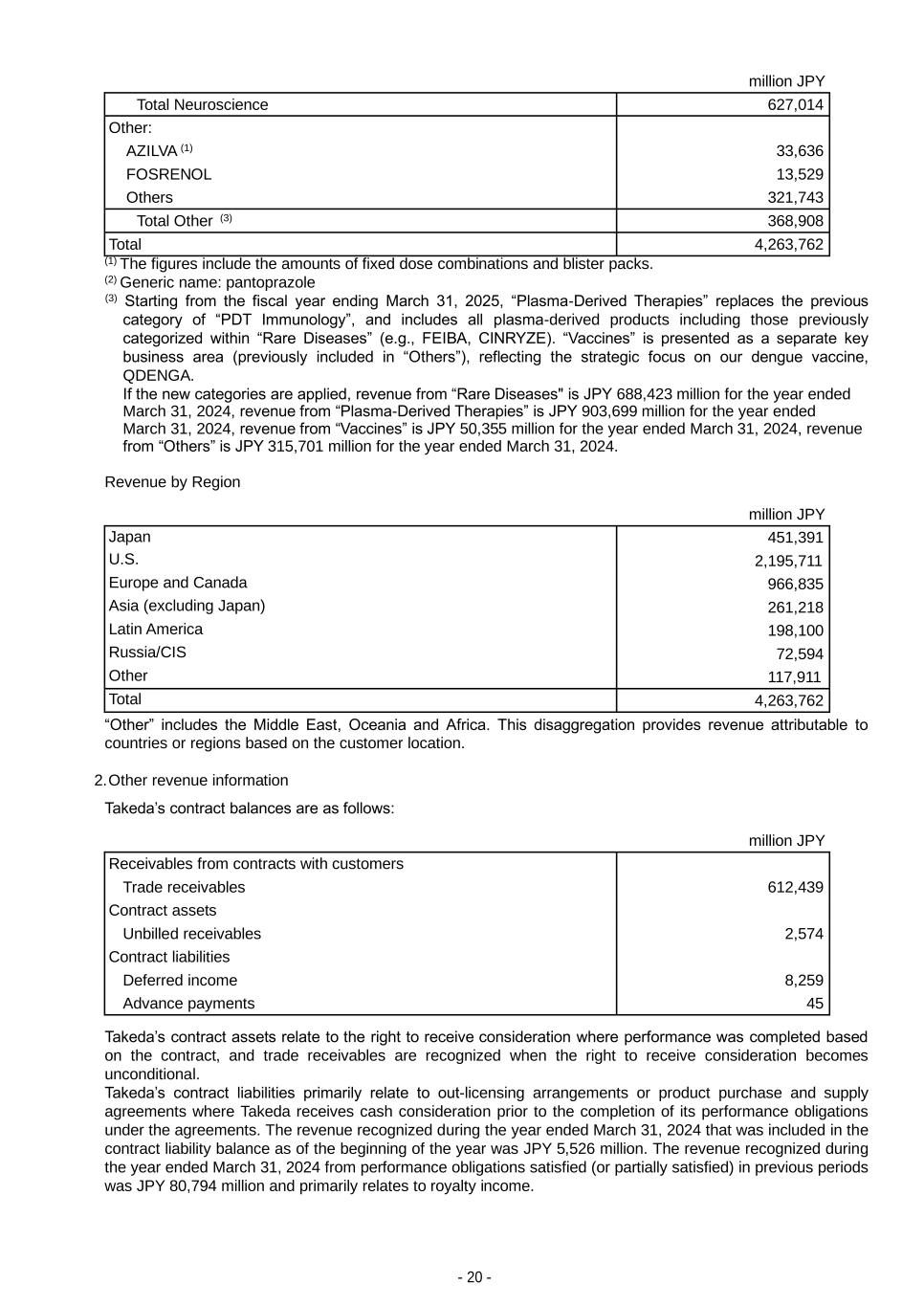 - 20 - million JPY Total Neuroscience 627,014 Other: AZILVA (1) 33,636 FOSRENOL 13,529 Others 321,743 Total Other (3) 368,908 Total 4,263,762 (1) The figures include the amounts of fixed dose combinations and blister packs. (2) Generic name: pantoprazole (3) Starting from the fiscal year ending March 31, 2025, “Plasma-Derived Therapies” replaces the previous category of “PDT Immunology”, and includes all plasma-derived products including those previously categorized within “Rare Diseases” (e.g., FEIBA, CINRYZE). “Vaccines” is presented as a separate key business area (previously included in “Others”), reflecting the strategic focus on our dengue vaccine, QDENGA. If the new categories are applied, revenue from “Rare Diseases" is JPY 688,423 million for the year ended March 31, 2024, revenue from “Plasma-Derived Therapies” is JPY 903,699 million for the year ended March 31, 2024, revenue from “Vaccines” is JPY 50,355 million for the year ended March 31, 2024, revenue from “Others” is JPY 315,701 million for the year ended March 31, 2024. Revenue by Region million JPY Japan 451,391 U.S. 2,195,711 Europe and Canada 966,835 Asia (excluding Japan) 261,218 Latin America 198,100 Russia/CIS 72,594 Other 117,911 Total 4,263,762 “Other” includes the Middle East, Oceania and Africa. This disaggregation provides revenue attributable to countries or regions based on the customer location. 2. Other revenue information Takeda’s contract balances are as follows: million JPY Receivables from contracts with customers Trade receivables 612,439 Contract assets Unbilled receivables 2,574 Contract liabilities Deferred income 8,259 Advance payments 45 Takeda’s contract assets relate to the right to receive consideration where performance was completed based on the contract, and trade receivables are recognized when the right to receive consideration becomes unconditional. Takeda’s contract liabilities primarily relate to out-licensing arrangements or product purchase and supply agreements where Takeda receives cash consideration prior to the completion of its performance obligations under the agreements. The revenue recognized during the year ended March 31, 2024 that was included in the contract liability balance as of the beginning of the year was JPY 5,526 million. The revenue recognized during the year ended March 31, 2024 from performance obligations satisfied (or partially satisfied) in previous periods was JPY 80,794 million and primarily relates to royalty income.