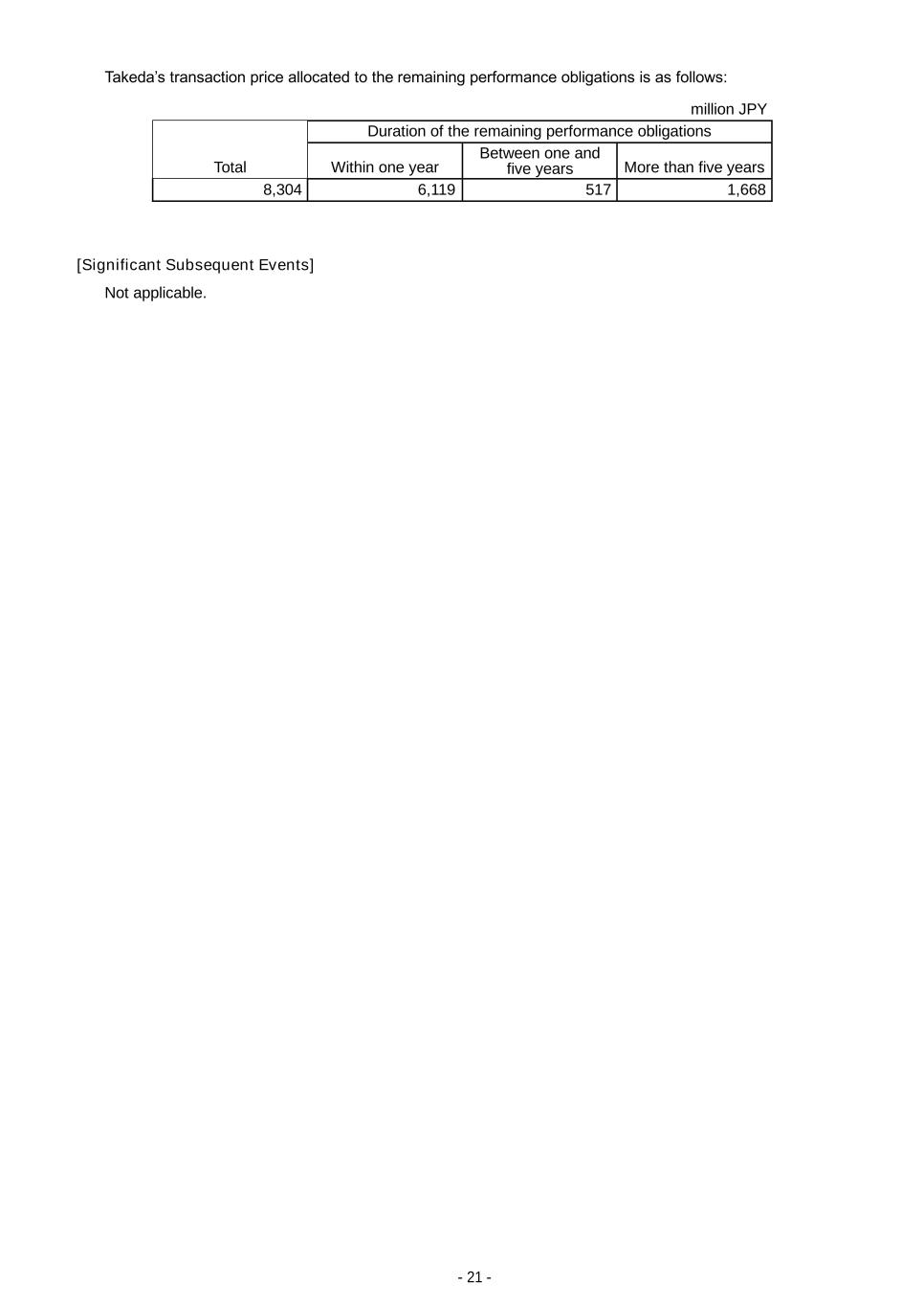 - 21 - Takeda’s transaction price allocated to the remaining performance obligations is as follows: million JPY Total Duration of the remaining performance obligations Within one year Between one and five years More than five years 8,304 6,119 517 1,668 [Significant Subsequent Events] Not applicable.