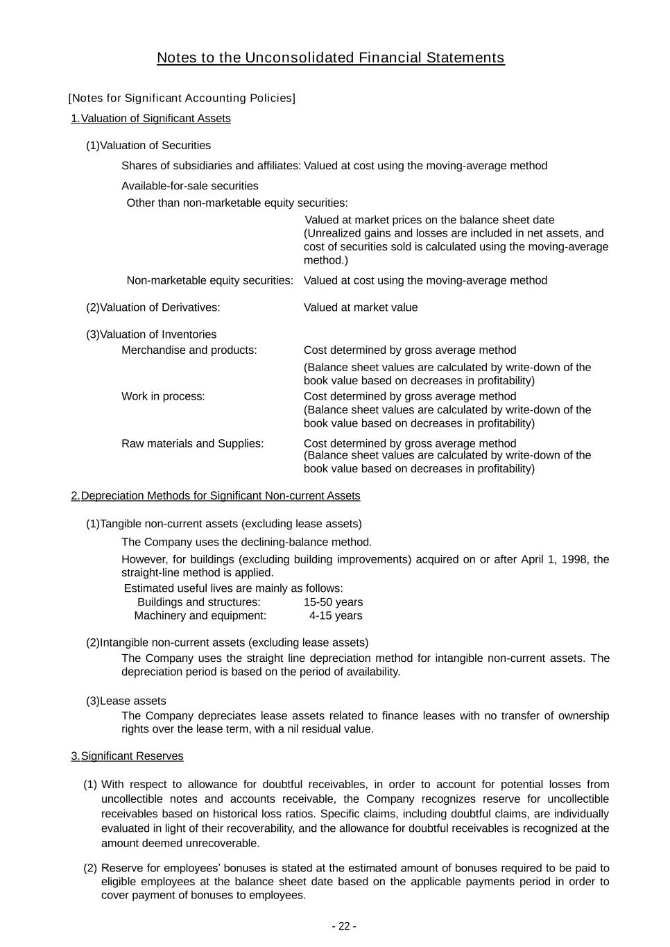 - 22 - Notes to the Unconsolidated Financial Statements [Notes for Significant Accounting Policies] 1. Valuation of Significant Assets (1)Valuation of Securities Shares of subsidiaries and affiliates: Valued at cost using the moving-average method Available-for-sale securities Other than non-marketable equity securities: Valued at market prices on the balance sheet date (Unrealized gains and losses are included in net assets, and cost of securities sold is calculated using the moving-average method.) Non-marketable equity securities: Valued at cost using the moving-average method (2)Valuation of Derivatives: Valued at market value (3)Valuation of Inventories Merchandise and products: Cost determined by gross average method (Balance sheet values are calculated by write-down of the book value based on decreases in profitability) Work in process: Cost determined by gross average method (Balance sheet values are calculated by write-down of the book value based on decreases in profitability) Raw materials and Supplies: Cost determined by gross average method (Balance sheet values are calculated by write-down of the book value based on decreases in profitability) 2. Depreciation Methods for Significant Non-current Assets (1)Tangible non-current assets (excluding lease assets) The Company uses the declining-balance method. However, for buildings (excluding building improvements) acquired on or after April 1, 1998, the straight-line method is applied. Estimated useful lives are mainly as follows: Buildings and structures: 15-50 years Machinery and equipment: 4-15 years (2)Intangible non-current assets (excluding lease assets) The Company uses the straight line depreciation method for intangible non-current assets. The depreciation period is based on the period of availability. (3)Lease assets The Company depreciates lease assets related to finance leases with no transfer of ownership rights over the lease term, with a nil residual value. 3. Significant Reserves (1) With respect to allowance for doubtful receivables, in order to account for potential losses from uncollectible notes and accounts receivable, the Company recognizes reserve for uncollectible receivables based on historical loss ratios. Specific claims, including doubtful claims, are individually evaluated in light of their recoverability, and the allowance for doubtful receivables is recognized at the amount deemed unrecoverable. (2) Reserve for employees’ bonuses is stated at the estimated amount of bonuses required to be paid to eligible employees at the balance sheet date based on the applicable payments period in order to cover payment of bonuses to employees.