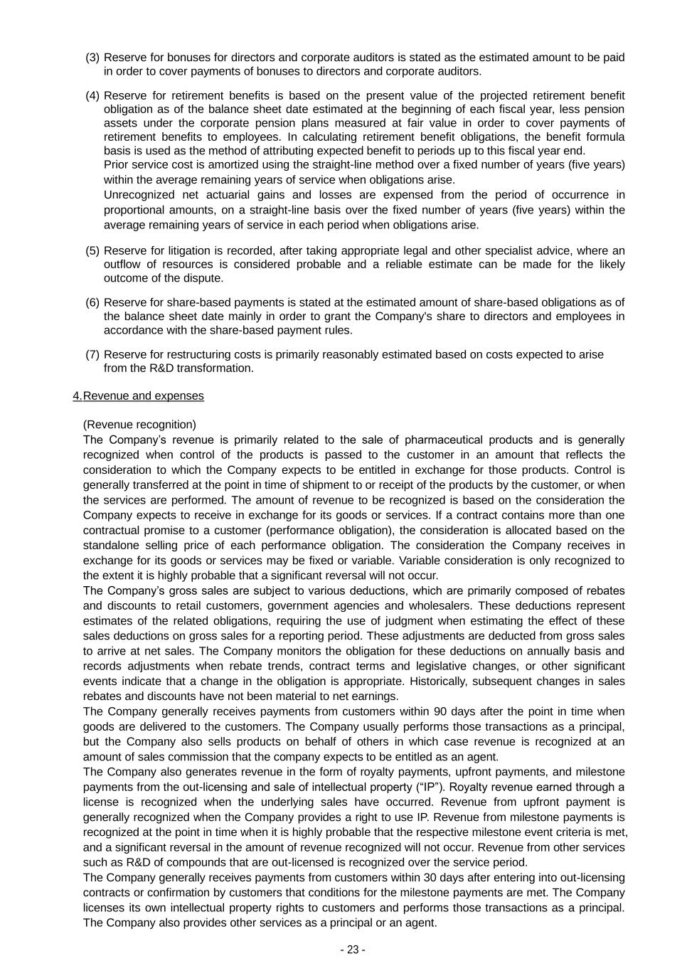 - 23 - (3) Reserve for bonuses for directors and corporate auditors is stated as the estimated amount to be paid in order to cover payments of bonuses to directors and corporate auditors. (4) Reserve for retirement benefits is based on the present value of the projected retirement benefit obligation as of the balance sheet date estimated at the beginning of each fiscal year, less pension assets under the corporate pension plans measured at fair value in order to cover payments of retirement benefits to employees. In calculating retirement benefit obligations, the benefit formula basis is used as the method of attributing expected benefit to periods up to this fiscal year end. Prior service cost is amortized using the straight-line method over a fixed number of years (five years) within the average remaining years of service when obligations arise. Unrecognized net actuarial gains and losses are expensed from the period of occurrence in proportional amounts, on a straight-line basis over the fixed number of years (five years) within the average remaining years of service in each period when obligations arise. (5) Reserve for litigation is recorded, after taking appropriate legal and other specialist advice, where an outflow of resources is considered probable and a reliable estimate can be made for the likely outcome of the dispute. (6) Reserve for share-based payments is stated at the estimated amount of share-based obligations as of the balance sheet date mainly in order to grant the Company's share to directors and employees in accordance with the share-based payment rules. (7) Reserve for restructuring costs is primarily reasonably estimated based on costs expected to arise from the R&D transformation. 4. Revenue and expenses (Revenue recognition) The Company’s revenue is primarily related to the sale of pharmaceutical products and is generally recognized when control of the products is passed to the customer in an amount that reflects the consideration to which the Company expects to be entitled in exchange for those products. Control is generally transferred at the point in time of shipment to or receipt of the products by the customer, or when the services are performed. The amount of revenue to be recognized is based on the consideration the Company expects to receive in exchange for its goods or services. If a contract contains more than one contractual promise to a customer (performance obligation), the consideration is allocated based on the standalone selling price of each performance obligation. The consideration the Company receives in exchange for its goods or services may be fixed or variable. Variable consideration is only recognized to the extent it is highly probable that a significant reversal will not occur. The Company’s gross sales are subject to various deductions, which are primarily composed of rebates and discounts to retail customers, government agencies and wholesalers. These deductions represent estimates of the related obligations, requiring the use of judgment when estimating the effect of these sales deductions on gross sales for a reporting period. These adjustments are deducted from gross sales to arrive at net sales. The Company monitors the obligation for these deductions on annually basis and records adjustments when rebate trends, contract terms and legislative changes, or other significant events indicate that a change in the obligation is appropriate. Historically, subsequent changes in sales rebates and discounts have not been material to net earnings. The Company generally receives payments from customers within 90 days after the point in time when goods are delivered to the customers. The Company usually performs those transactions as a principal, but the Company also sells products on behalf of others in which case revenue is recognized at an amount of sales commission that the company expects to be entitled as an agent. The Company also generates revenue in the form of royalty payments, upfront payments, and milestone payments from the out-licensing and sale of intellectual property (“IP”). Royalty revenue earned through a license is recognized when the underlying sales have occurred. Revenue from upfront payment is generally recognized when the Company provides a right to use IP. Revenue from milestone payments is recognized at the point in time when it is highly probable that the respective milestone event criteria is met, and a significant reversal in the amount of revenue recognized will not occur. Revenue from other services such as R&D of compounds that are out-licensed is recognized over the service period. The Company generally receives payments from customers within 30 days after entering into out-licensing contracts or confirmation by customers that conditions for the milestone payments are met. The Company licenses its own intellectual property rights to customers and performs those transactions as a principal. The Company also provides other services as a principal or an agent.