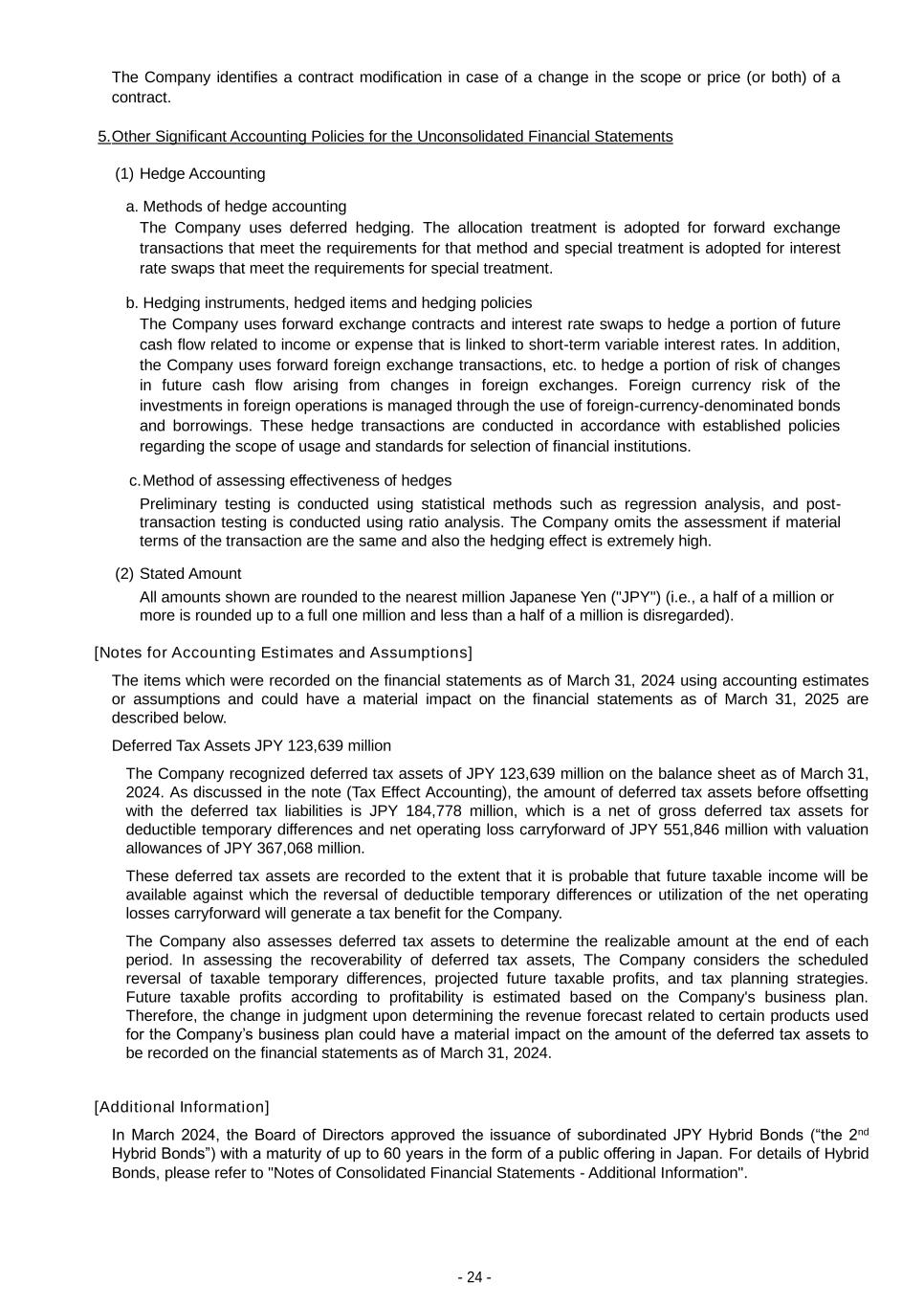 - 24 - The Company identifies a contract modification in case of a change in the scope or price (or both) of a contract. 5. Other Significant Accounting Policies for the Unconsolidated Financial Statements (1) Hedge Accounting a. Methods of hedge accounting The Company uses deferred hedging. The allocation treatment is adopted for forward exchange transactions that meet the requirements for that method and special treatment is adopted for interest rate swaps that meet the requirements for special treatment. b. Hedging instruments, hedged items and hedging policies The Company uses forward exchange contracts and interest rate swaps to hedge a portion of future cash flow related to income or expense that is linked to short-term variable interest rates. In addition, the Company uses forward foreign exchange transactions, etc. to hedge a portion of risk of changes in future cash flow arising from changes in foreign exchanges. Foreign currency risk of the investments in foreign operations is managed through the use of foreign-currency-denominated bonds and borrowings. These hedge transactions are conducted in accordance with established policies regarding the scope of usage and standards for selection of financial institutions. c. Method of assessing effectiveness of hedges Preliminary testing is conducted using statistical methods such as regression analysis, and post- transaction testing is conducted using ratio analysis. The Company omits the assessment if material terms of the transaction are the same and also the hedging effect is extremely high. (2) Stated Amount All amounts shown are rounded to the nearest million Japanese Yen ("JPY") (i.e., a half of a million or more is rounded up to a full one million and less than a half of a million is disregarded). [Notes for Accounting Estimates and Assumptions] The items which were recorded on the financial statements as of March 31, 2024 using accounting estimates or assumptions and could have a material impact on the financial statements as of March 31, 2025 are described below. Deferred Tax Assets JPY 123,639 million The Company recognized deferred tax assets of JPY 123,639 million on the balance sheet as of March 31, 2024. As discussed in the note (Tax Effect Accounting), the amount of deferred tax assets before offsetting with the deferred tax liabilities is JPY 184,778 million, which is a net of gross deferred tax assets for deductible temporary differences and net operating loss carryforward of JPY 551,846 million with valuation allowances of JPY 367,068 million. These deferred tax assets are recorded to the extent that it is probable that future taxable income will be available against which the reversal of deductible temporary differences or utilization of the net operating losses carryforward will generate a tax benefit for the Company. The Company also assesses deferred tax assets to determine the realizable amount at the end of each period. In assessing the recoverability of deferred tax assets, The Company considers the scheduled reversal of taxable temporary differences, projected future taxable profits, and tax planning strategies. Future taxable profits according to profitability is estimated based on the Company's business plan. Therefore, the change in judgment upon determining the revenue forecast related to certain products used for the Company’s business plan could have a material impact on the amount of the deferred tax assets to be recorded on the financial statements as of March 31, 2024. [Additional Information] In March 2024, the Board of Directors approved the issuance of subordinated JPY Hybrid Bonds (“the 2nd Hybrid Bonds”) with a maturity of up to 60 years in the form of a public offering in Japan. For details of Hybrid Bonds, please refer to "Notes of Consolidated Financial Statements - Additional Information".
