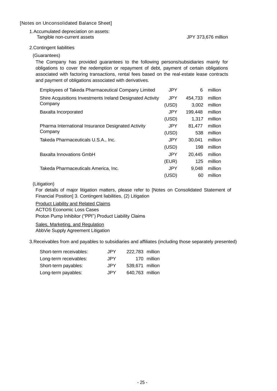 - 25 - [Notes on Unconsolidated Balance Sheet] 1. Accumulated depreciation on assets: Tangible non-current assets JPY 373,676 million 2.Contingent liabilities (Guarantees) The Company has provided guarantees to the following persons/subsidiaries mainly for obligations to cover the redemption or repayment of debt, payment of certain obligations associated with factoring transactions, rental fees based on the real-estate lease contracts and payment of obligations associated with derivatives. Employees of Takeda Pharmaceutical Company Limited JPY 6 million Shire Acquisitions Investments Ireland Designated Activity Company JPY 454,733 million (USD) 3,002 million Baxalta Incorporated JPY 199,448 million (USD) 1,317 million Pharma International Insurance Designated Activity Company JPY 81,477 million (USD) 538 million Takeda Pharmaceuticals U.S.A., Inc. JPY 30,041 million (USD) 198 million Baxalta Innovations GmbH JPY 20,445 million (EUR) 125 million Takeda Pharmaceuticals America, Inc. JPY 9,048 million (USD) 60 million (Litigation) For details of major litigation matters, please refer to [Notes on Consolidated Statement of Financial Position] 3. Contingent liabilities, (2) Litigation Product Liability and Related Claims ACTOS Economic Loss Cases Proton Pump Inhibitor (“PPI”) Product Liability Claims Sales, Marketing, and Regulation AbbVie Supply Agreement Litigation 3. Receivables from and payables to subsidiaries and affiliates (including those separately presented) Short-term receivables: JPY 222,783 million Long-term receivables: JPY 170 million Short-term payables: JPY 539,671 million Long-term payables: JPY 640,763 million