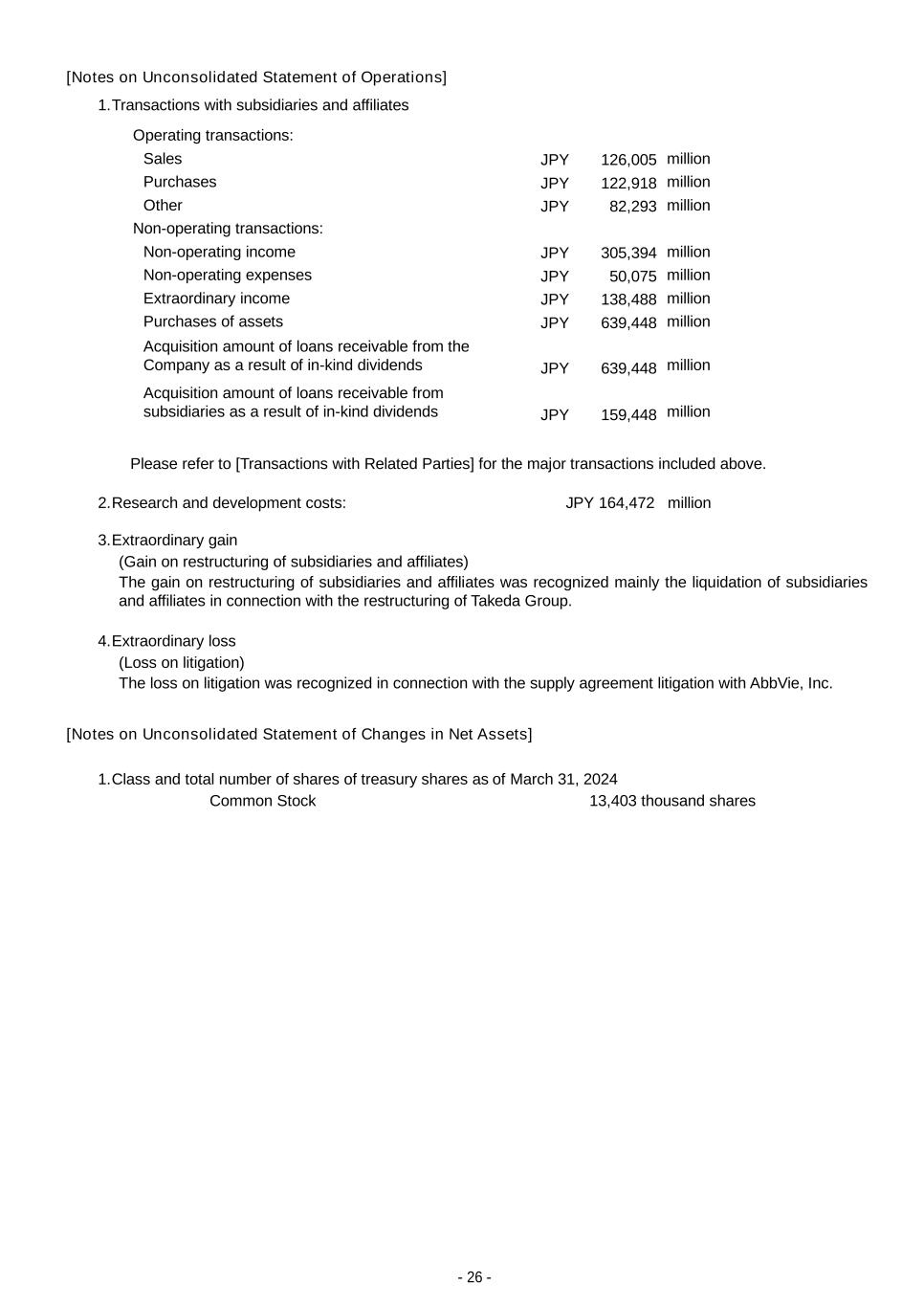 - 26 - [Notes on Unconsolidated Statement of Operations] 1. Transactions with subsidiaries and affiliates Operating transactions: Sales JPY 126,005 million Purchases JPY 122,918 million Other JPY 82,293 million Non-operating transactions: Non-operating income JPY 305,394 million Non-operating expenses JPY 50,075 million Extraordinary income JPY 138,488 million Purchases of assets JPY 639,448 million Acquisition amount of loans receivable from the Company as a result of in-kind dividends JPY 639,448 million Acquisition amount of loans receivable from subsidiaries as a result of in-kind dividends JPY 159,448 million Please refer to [Transactions with Related Parties] for the major transactions included above. 2. Research and development costs: JPY 164,472 million 3. Extraordinary gain (Gain on restructuring of subsidiaries and affiliates) The gain on restructuring of subsidiaries and affiliates was recognized mainly the liquidation of subsidiaries and affiliates in connection with the restructuring of Takeda Group. 4. Extraordinary loss (Loss on litigation) The loss on litigation was recognized in connection with the supply agreement litigation with AbbVie, Inc. [Notes on Unconsolidated Statement of Changes in Net Assets] 1. Class and total number of shares of treasury shares as of March 31, 2024 Common Stock 13,403 thousand shares