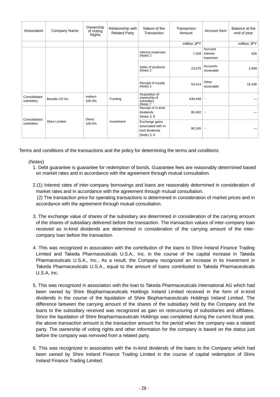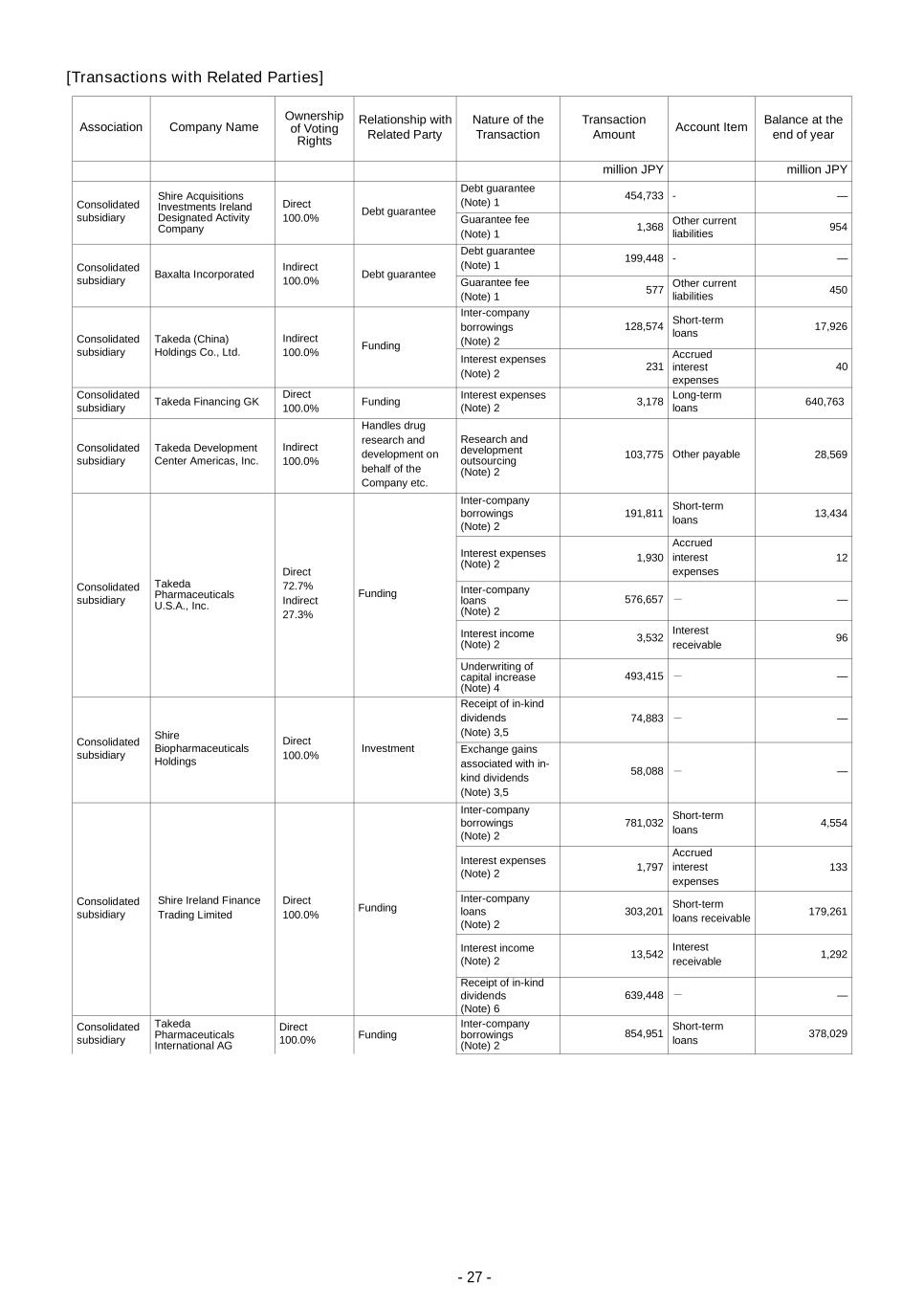 - 27 - [Transactions with Related Parties] Association Company Name Ownership of Voting Rights Relationship with Related Party Nature of the Transaction Transaction Amount Account Item Balance at the end of year million JPY million JPY Consolidated subsidiary Shire Acquisitions Investments Ireland Designated Activity Company Direct 100.0% Debt guarantee Debt guarantee (Note) 1 454,733 - — Guarantee fee (Note) 1 1,368 Other current liabilities 954 Consolidated subsidiary Baxalta Incorporated Indirect 100.0% Debt guarantee Debt guarantee (Note) 1 199,448 - — Guarantee fee (Note) 1 577 Other current liabilities 450 Consolidated subsidiary Takeda (China) Holdings Co., Ltd. Indirect 100.0% Funding Inter-company borrowings (Note) 2 128,574 Short-term loans 17,926 Interest expenses (Note) 2 231 Accrued interest expenses 40 Consolidated subsidiary Takeda Financing GK Direct 100.0% Funding Interest expenses (Note) 2 3,178 Long-term loans 640,763 Consolidated subsidiary Takeda Development Center Americas, Inc. Indirect 100.0% Handles drug research and development on behalf of the Company etc. Research and development outsourcing (Note) 2 103,775 Other payable 28,569 Consolidated subsidiary Takeda Pharmaceuticals U.S.A., Inc. Direct 72.7% Indirect 27.3% Funding Inter-company borrowings (Note) 2 191,811 Short-term loans 13,434 Interest expenses (Note) 2 1,930 Accrued interest expenses 12 Inter-company loans (Note) 2 576,657 - — Interest income (Note) 2 3,532 Interest receivable 96 Underwriting of capital increase (Note) 4 493,415 - — Consolidated subsidiary Shire Biopharmaceuticals Holdings Direct 100.0% Investment Receipt of in-kind dividends (Note) 3,5 74,883 - — Exchange gains associated with in- kind dividends (Note) 3,5 58,088 - — Consolidated subsidiary Shire Ireland Finance Trading Limited Direct 100.0% Funding Inter-company borrowings (Note) 2 781,032 Short-term loans 4,554 Interest expenses (Note) 2 1,797 Accrued interest expenses 133 Inter-company loans (Note) 2 303,201 Short-term loans receivable 179,261 Interest income (Note) 2 13,542 Interest receivable 1,292 Receipt of in-kind dividends (Note) 6 639,448 - — Consolidated subsidiary Takeda Pharmaceuticals International AG Direct 100.0% Funding Inter-company borrowings (Note) 2 854,951 Short-term loans 378,029
