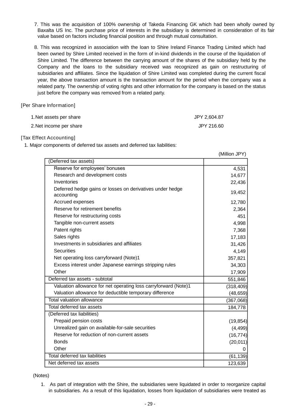 - 29 - 7. This was the acquisition of 100% ownership of Takeda Financing GK which had been wholly owned by Baxalta US Inc. The purchase price of interests in the subsidiary is determined in consideration of its fair value based on factors including financial position and through mutual consultation. 8. This was recognized in association with the loan to Shire Ireland Finance Trading Limited which had been owned by Shire Limited received in the form of in-kind dividends in the course of the liquidation of Shire Limited. The difference between the carrying amount of the shares of the subsidiary held by the Company and the loans to the subsidiary received was recognized as gain on restructuring of subsidiaries and affiliates. Since the liquidation of Shire Limited was completed during the current fiscal year, the above transaction amount is the transaction amount for the period when the company was a related party. The ownership of voting rights and other information for the company is based on the status just before the company was removed from a related party. [Per Share Information] 1. Net assets per share JPY 2,604.87 2. Net income per share JPY 216.60 [Tax Effect Accounting] 1. Major components of deferred tax assets and deferred tax liabilities: (Million JPY) (Deferred tax assets) Reserve for employees’ bonuses 4,531 Research and development costs 14,677 Inventories 22,436 Deferred hedge gains or losses on derivatives under hedge accounting 19,452 Accrued expenses 12,780 Reserve for retirement benefits 2,364 Reserve for restructuring costs 451 Tangible non-current assets 4,998 Patent rights 7,368 Sales rights 17,183 Investments in subsidiaries and affiliates 31,426 Securities 4,149 Net operating loss carryforward (Note)1 357,821 Excess interest under Japanese earnings stripping rules 34,303 Other 17,909 Deferred tax assets - subtotal 551,846 Valuation allowance for net operating loss carryforward (Note)1 (318,409) Valuation allowance for deductible temporary difference (48,659) Total valuation allowance (367,068) Total deferred tax assets 184,778 (Deferred tax liabilities) Prepaid pension costs (19,854) Unrealized gain on available-for-sale securities (4,499) Reserve for reduction of non-current assets (16,774) Bonds (20,011) Other 0 Total deferred tax liabilities (61,139) Net deferred tax assets 123,639 (Notes) 1. As part of integration with the Shire, the subsidiaries were liquidated in order to reorganize capital in subsidiaries. As a result of this liquidation, losses from liquidation of subsidiaries were treated as