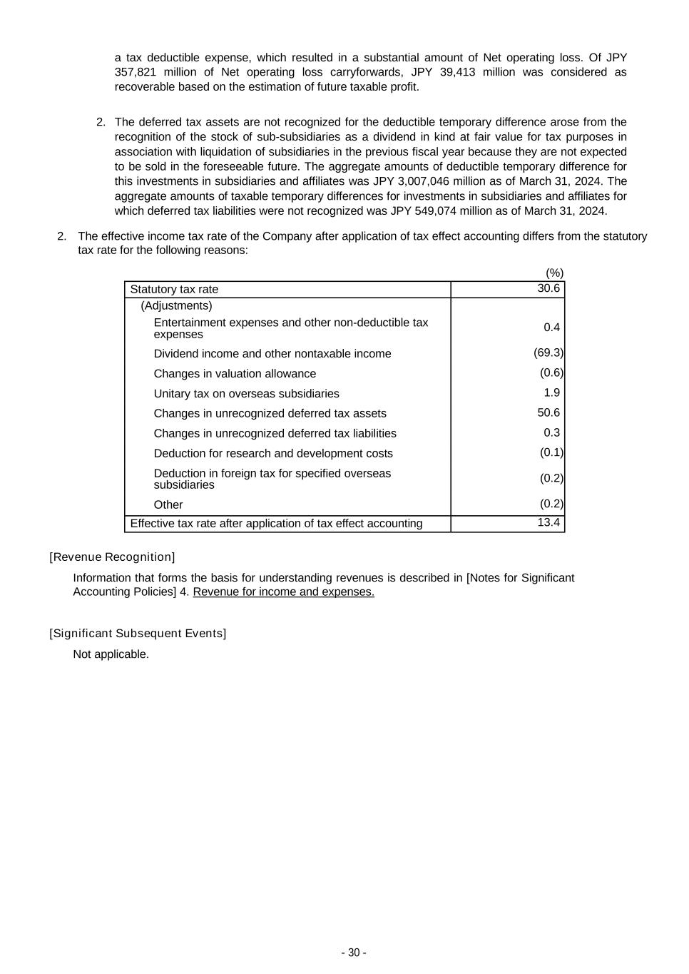 - 30 - a tax deductible expense, which resulted in a substantial amount of Net operating loss. Of JPY 357,821 million of Net operating loss carryforwards, JPY 39,413 million was considered as recoverable based on the estimation of future taxable profit. 2. The deferred tax assets are not recognized for the deductible temporary difference arose from the recognition of the stock of sub-subsidiaries as a dividend in kind at fair value for tax purposes in association with liquidation of subsidiaries in the previous fiscal year because they are not expected to be sold in the foreseeable future. The aggregate amounts of deductible temporary difference for this investments in subsidiaries and affiliates was JPY 3,007,046 million as of March 31, 2024. The aggregate amounts of taxable temporary differences for investments in subsidiaries and affiliates for which deferred tax liabilities were not recognized was JPY 549,074 million as of March 31, 2024. 2. The effective income tax rate of the Company after application of tax effect accounting differs from the statutory tax rate for the following reasons: (%) Statutory tax rate 30.6 (Adjustments) Entertainment expenses and other non-deductible tax expenses 0.4 Dividend income and other nontaxable income (69.3) Changes in valuation allowance (0.6) Unitary tax on overseas subsidiaries 1.9 Changes in unrecognized deferred tax assets 50.6 Changes in unrecognized deferred tax liabilities 0.3 Deduction for research and development costs (0.1) Deduction in foreign tax for specified overseas subsidiaries (0.2) Other (0.2) Effective tax rate after application of tax effect accounting 13.4 [Revenue Recognition] Information that forms the basis for understanding revenues is described in [Notes for Significant Accounting Policies] 4. Revenue for income and expenses. [Significant Subsequent Events] Not applicable.